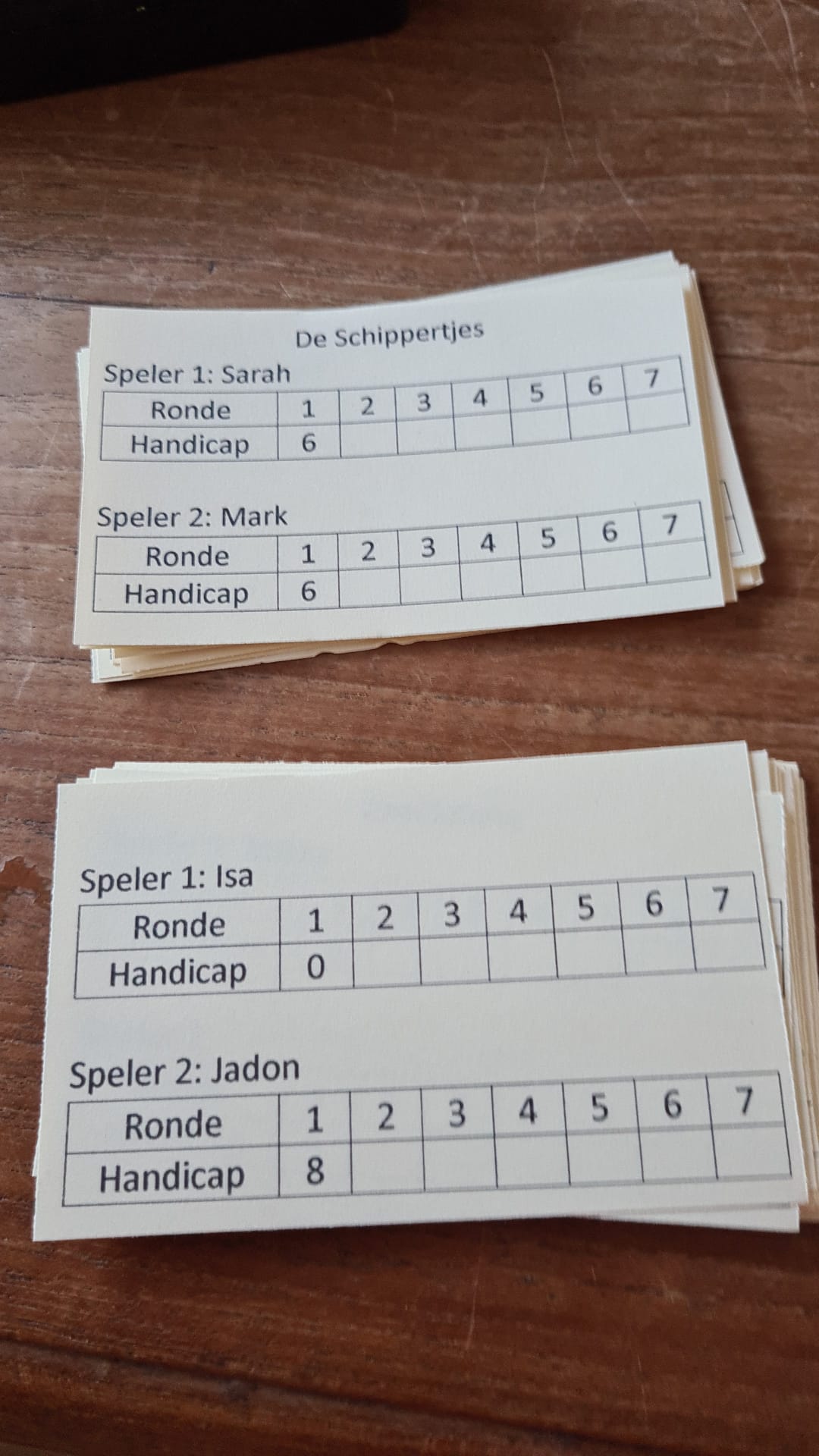 Het werd inderdaad een gezellige middag. Maar liefst 28 teams, het hoogste aantal ooit. Bijna alle tafels in Menorah moesten gebruikt worden. Na met elkaar kennis gemaakt te hebben en een uitgebreide uitleg over de betekenis van een handicap konden we pas rond 2 uur beginnen met de eerste ronde. Gerbrich had voor iedereen handicap kaartjes gemaakt. Omdat de handicap niet altijd goed in te schatten is hadden we de dynamische handicap bedacht. Na elke ronde werd je handicap bijgesteld aan de hand van je resultaat. Een gouden greep want als wedstrijdleiders konden we met een ondoorgrondelijke uitleg elke nieuwe waarde aan de speler wijs maken.