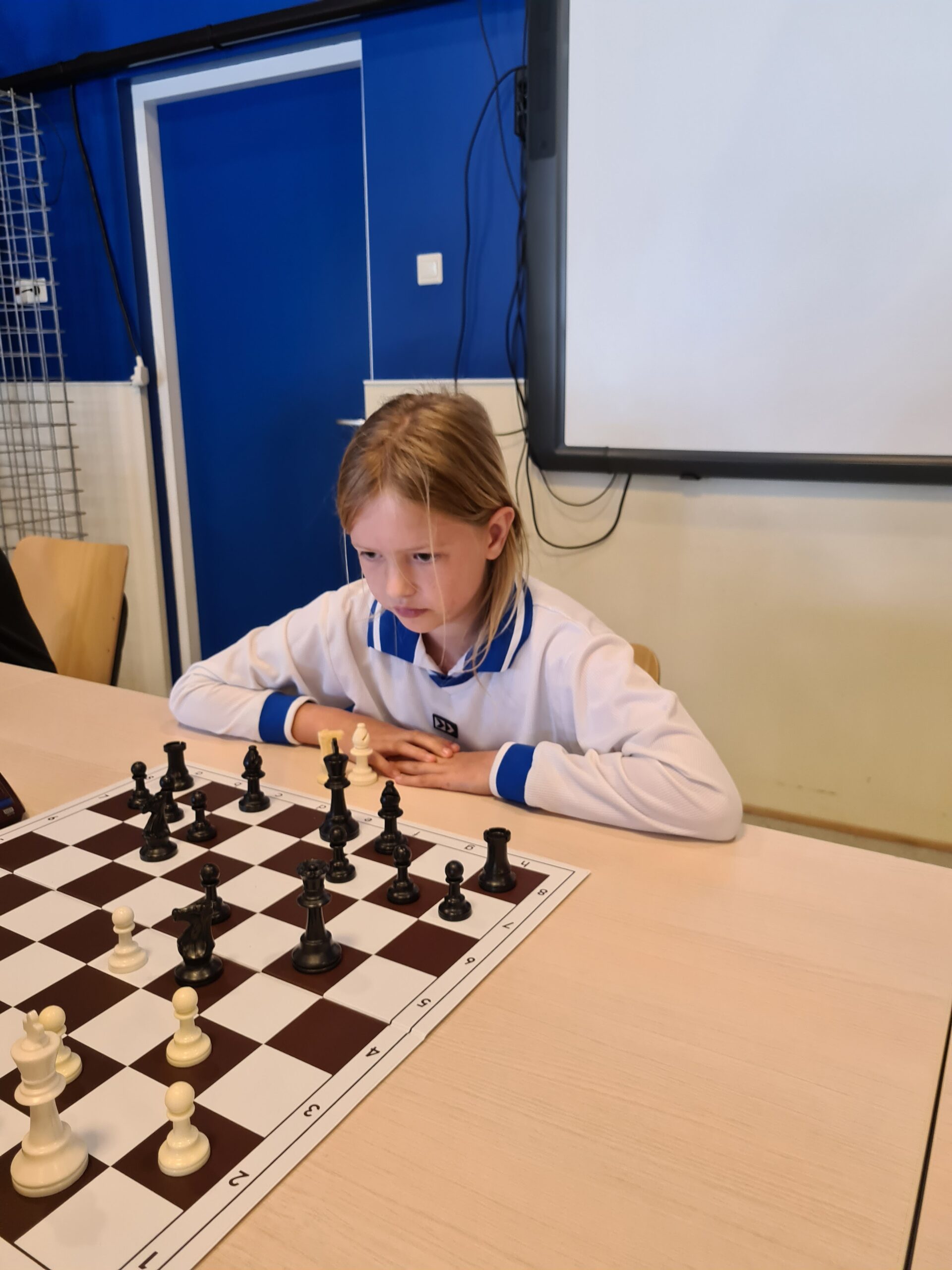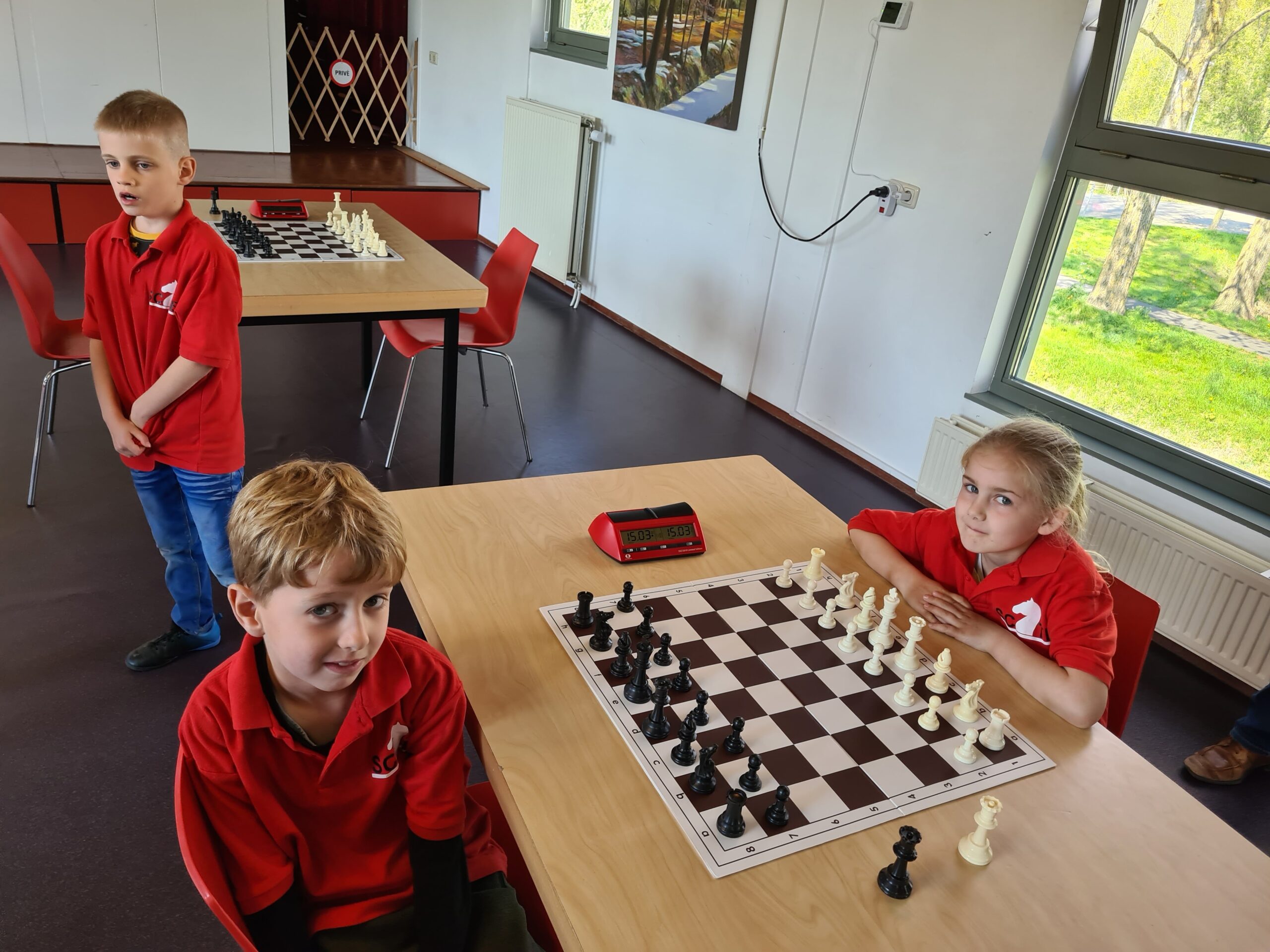 Samuel en Sarah schaakten beiden niet zo goed, vermoedelijk vanwege het kamp van groep 7/8 de dagen ervoor. Je zag dat ze door vermoeidheid andere beslissingen dan anders namen. Om een voorbeeld te geven: