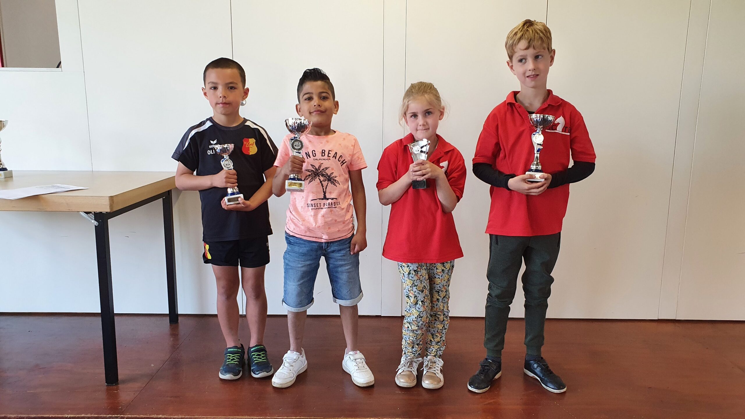 In de D-categorie 7 spelers van onze club. Voor een aantal was het het eerste toernooi. Bijvoorbeeld Mikka mocht er voor het eerst aan proeven en haalde 2 uit 7. Vincent, Noa en Merijn hebben ook nog niet weer het ritme en haalden 1, 3 en 3 punten. Vooral de prestaties van Noa en Merijn waren daarmee goed te nomen. Sarah, Niek en Samuel hadden een heel ander doel: wedstrijdritme opdoen voor het BSK een week later. Zij experimenteerden meer en haalden af en toe goede en af en toe tegenvallende resultaten. Ze eindigden alle drie in de middenmoot.