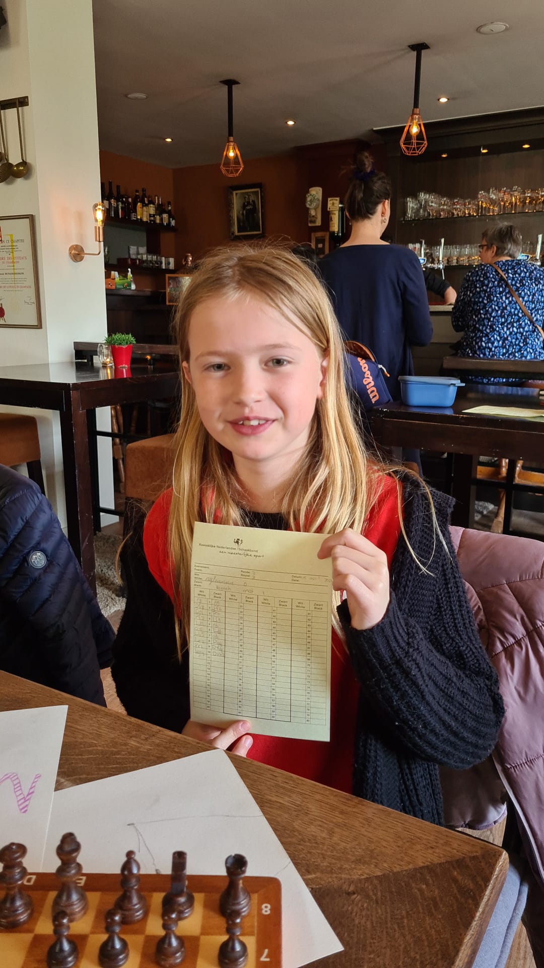 Met 5 uit 9 heeft Hannah het boven verwachting gedaan. In de eindstand is ze gedeeld vijfde en op weerstandspunten zesde. Een prachtige schaaktweedaagse! Wat is er veel geleerd en wat hebben we veel plezier gehad. Positief: tijdens het toernooi werd het schaken steeds beter, Hannah neemt heel snel nieuwe informatie op en kan het toepassen en ze heeft veel nieuwe vriendinnen gemaakt. De club bedankt Hannah voor de twee mooie schaakdagen!