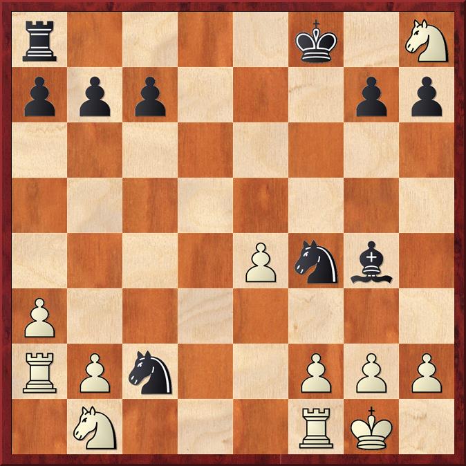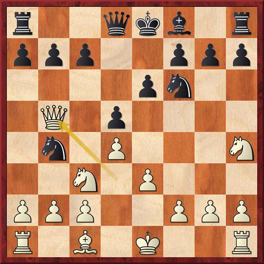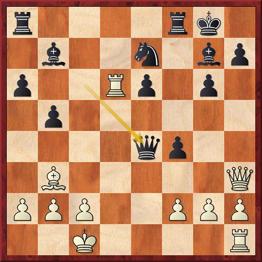 In deze stelling speelde Sarah 1… c6! 2. Dxb7? Tb8! (nauwkeuriger dan direct slaan op c2) 3. Dxa7 Pxc2+ en ze won de partij. Noot: Martijn wees mij er vandaag op dat de zet 1… Pd7 eigenlijk veel sterker is. Na 1… c6 kan wit nog terug met de dame naar e2. Na 1… Pd7 is een dubbele aanval ontstaan: zowel het paard op h4 als de pion op c2 zijn aangevallen. Die kunnen niet beiden gedekt worden.