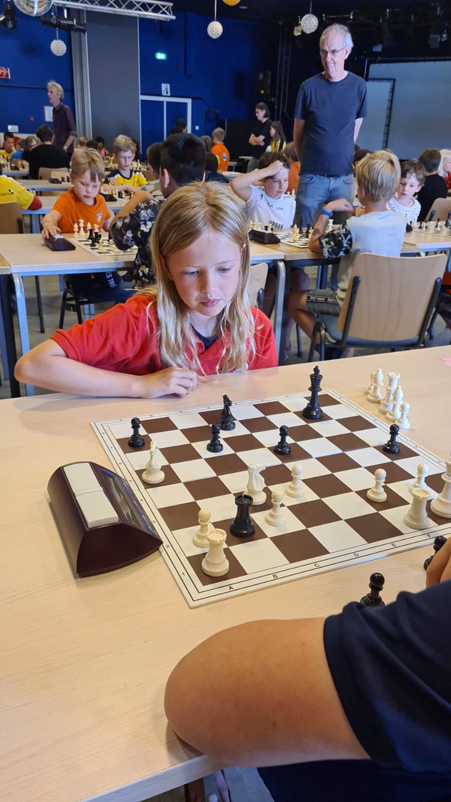 – Paulien haalde 2,5 punt. Ze won onder meer van een Duitse jongen en speelde remise tegen een D-speler. Uiteindelijk de 121ste plaats van de 141 deelnemers. Eén van haar partijen heb ik bekeken en die won ze meteen. Het matzetten gaat ook al steeds beter, vooral het roltrapmat.
