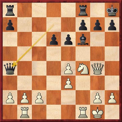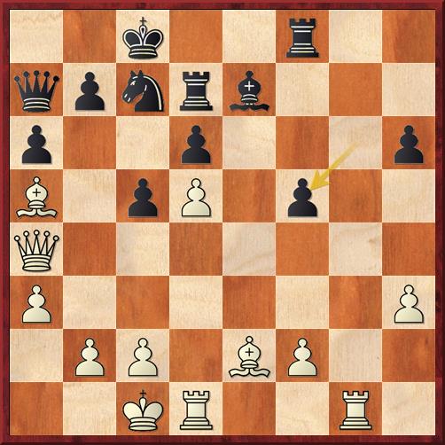In deze stelling had Wyona net 1… Da4 gespeeld. Beide spelers en ook in de analyse misten we 2. e5! met de dreiging 3. Pg6+ met damewinst. De loper gaat dus verloren.