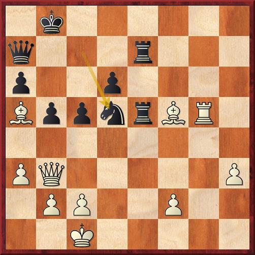 Hier speelde Wyona 1… Pg4 waarbij ze had gezien dat 2. Pxc6 bxc6 3. Lxc6 Pxe3 4. Lxd7+ Dxd7 5. fxe3 mogelijk was. De stelling schatte ze als ok in voor zwart. De engine geeft ook 1… Pg4 als één van de betere zetten. Na afloop keken we nog naar 2… Pxe3 3. Pxd8 Pxd1 4. Lxd7 Kxd8 5. Txd1 Kxd7 6. e5 en we hadden het idee dat wit iets beter staat.