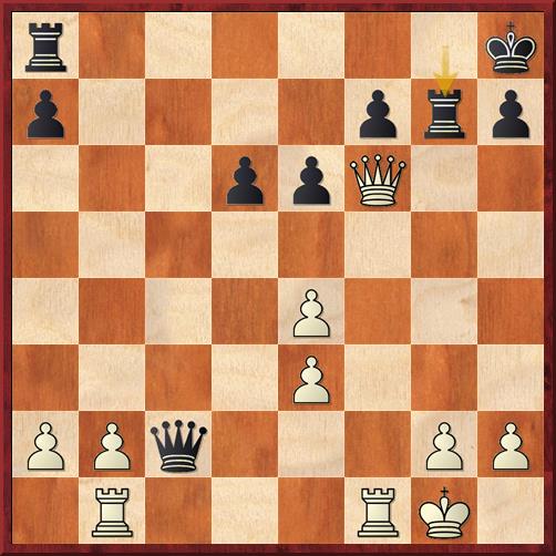 In deze stelling lijkt mij 1. Tg8+ al heel goed (na 1… Te8 2. Txe8+ Txe8 is het paard op d5 niet meer gedekt). Rowin speelde 1. Dg3 b4 om nu 2. Tg8+ te spelen. Ernst had hier met 2… Kb7 nog tegenstand kunnen bieden maar na 2… Te8 3. Txe8+ Txe8 4. Dxd6 is de stelling opeens verloren.