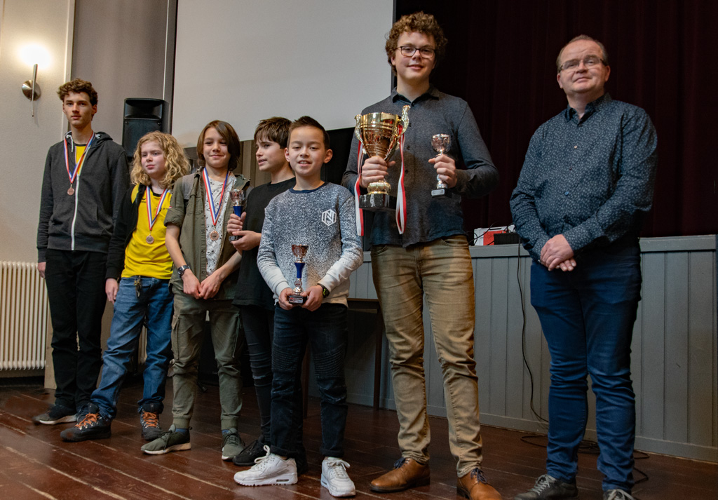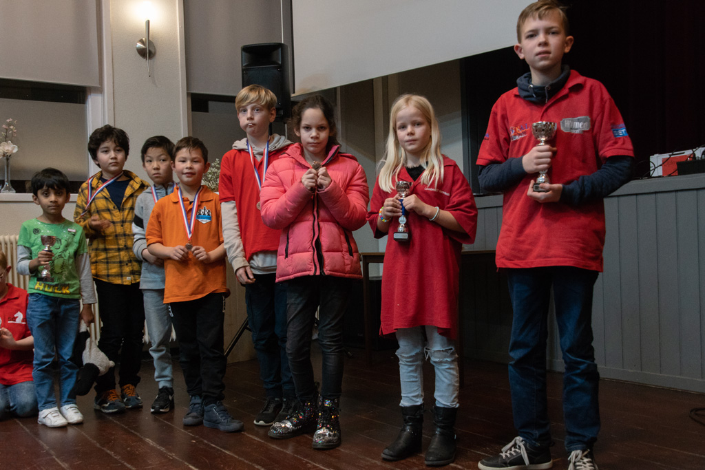 Hij deed het echter uitstekend. Hij moest wel wat wennen dat aanraken zetten is, maar de zetten die hij speelde getuigden van een hoog niveau. Hij begon als een speer met 3 uit 3. Hierna werd hij toch wat moe en volgden nog 3 remises en een verliespartij tegen een ander fenomeen: Yildert Kempenaar. Yildert is nog maar 6 en speelt in Leeuwarden bij Philidor. Dat ze daar een goede trainer hebben weet iedereen. Yildert haalde 6,5 uit 7. Alleen tegen Joas liet hij een half punt liggen. Dus Yildert eerste en Beshr tweede. Op SB-punten, want ook onze eigen Justen Wiltjer had 4,5 punt gehaald. Die ontving ook zijn eerste beker en werd derde.
