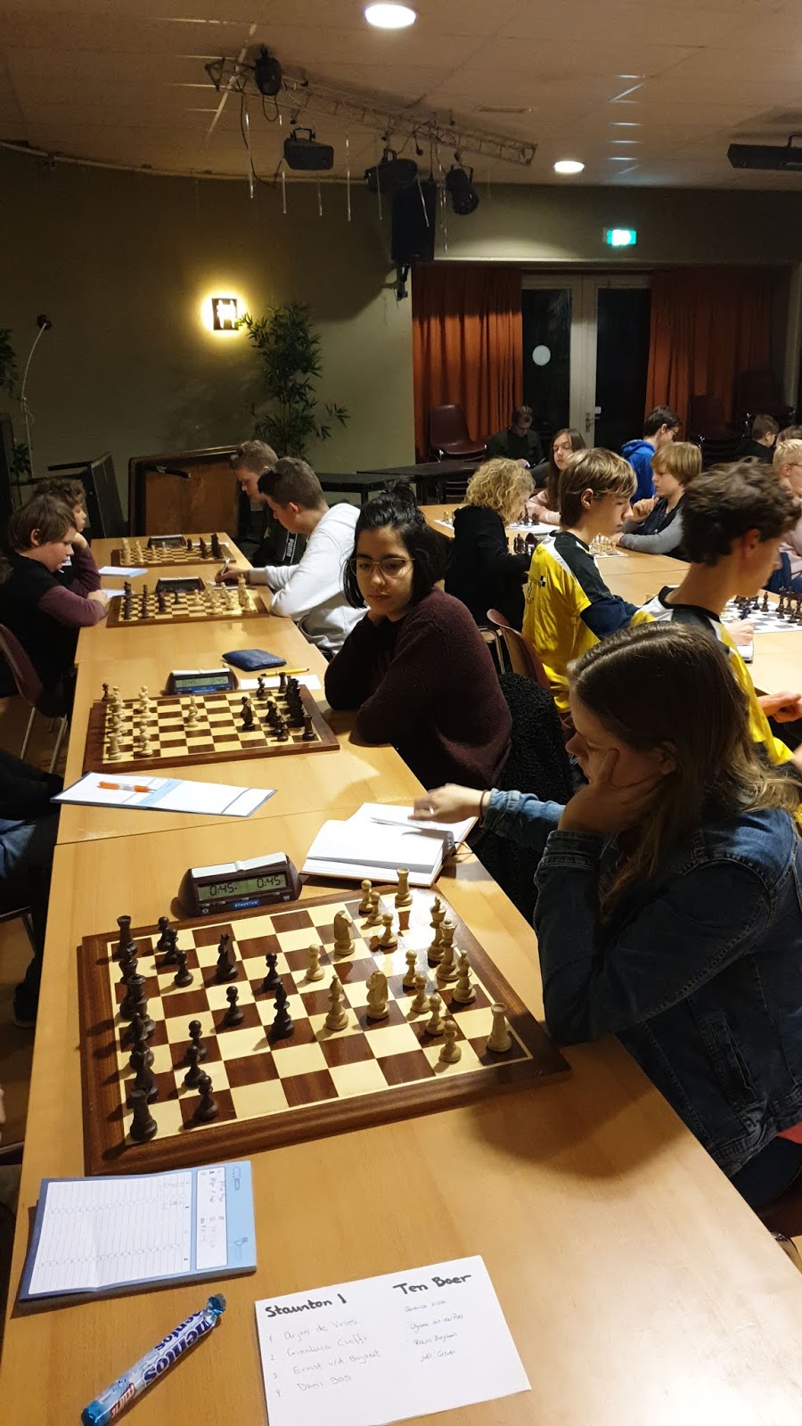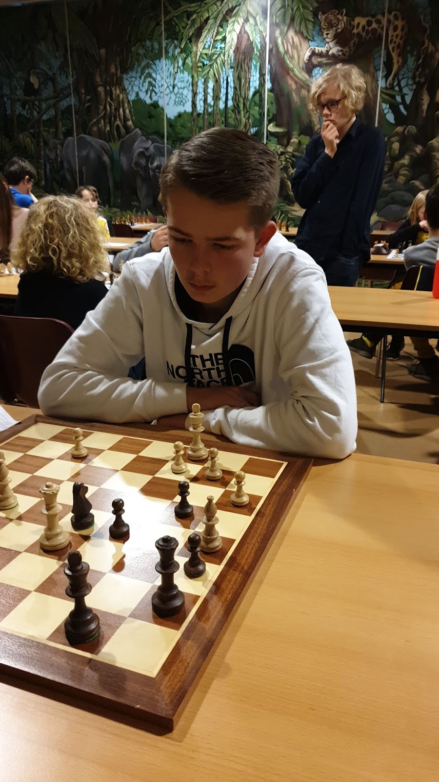 Vrijdag heeft ons viertal zijn eerste wedstrijd voor wedstrijd voor de Noordelijke Jeugd Competitie gespeeld. De eerste ronde had het team vrij, dus we stonden al eerste. Afgelopen vrijdag kwam daar een geflatteerde 4-0 overwinning bij. Geflatteerd want vooral de strijd op bord 1 verliep onlogisch. Toen daar het tij gekeerd was, geloofden de tegenstanders op de andere borden het ook wel.