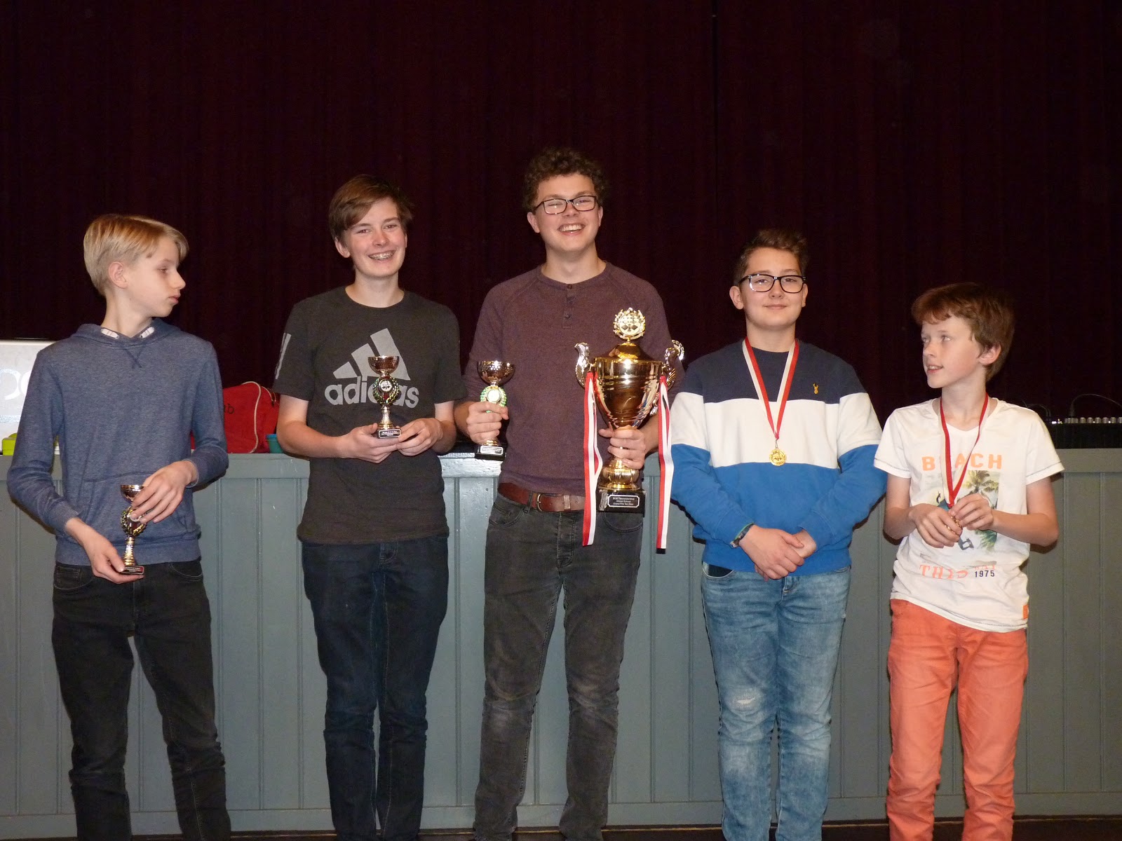 In elk geval was er één het sterkst in deze groep. Dat was Christian. Op het scorebord staat dat hij 7 uit 7 haalde. Dat was alleen niet zo. Hij verloor een partij van Tim Wiltjer. En dat dit fout is gegaan is nogal vervelend voor Tim, want hij werd daardoor geen gedeeld derde maar vijfde. Bij narekenen van alle standen concludeerde ik wel dat Sumrud de onderlinge partij gewonnen had en dus terecht de derde prijs kreeg. Christian haalde echter zijn eerste beker bij een toernooi en dat deed Paulien ook. Zij haalde 5 uit 7 en verloor alleen van Christian en Tim.