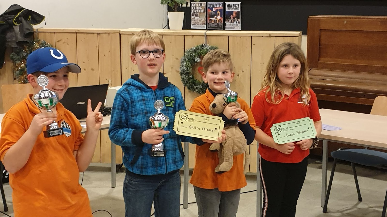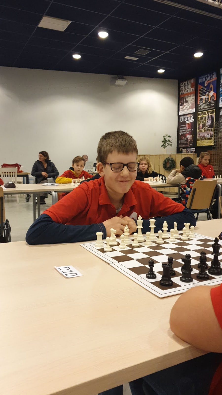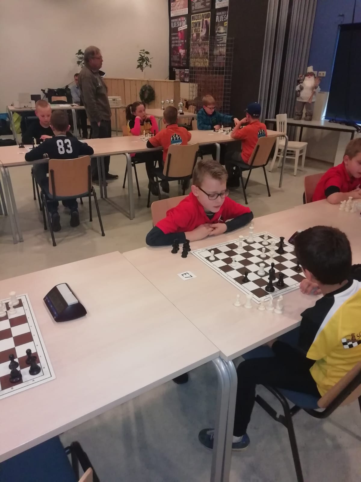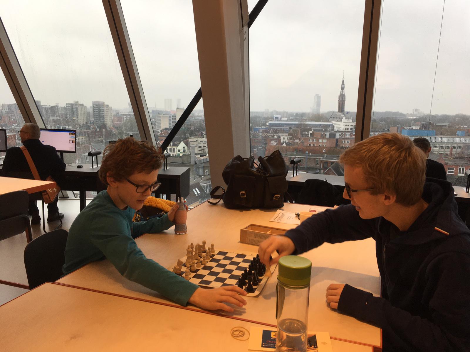 Het werd een leerzame middag voor onze 12 schakers. Door omstandigheden was de organisatie niet optimaal. De hoofdorganisator had wegens ziekte ’s ochtends af moeten zeggen, dus dat betekende dat Jan en Bastian van Os opeens voor een enorme taak opgesteld stonden. Gelukkig waren er enkele schakers zoals Erwin van Pelt en Marijn Swemmer die spontaan meehielpen. En ook leuk was dat Jan een schaakprobleem voor de kinderen had neergelegd. Vijf kinderen konden zo een trainingsclinic met Nederlands Kampioen Jonas Hilwerda winnen. Gijs was één van de vijf gelukkigen.