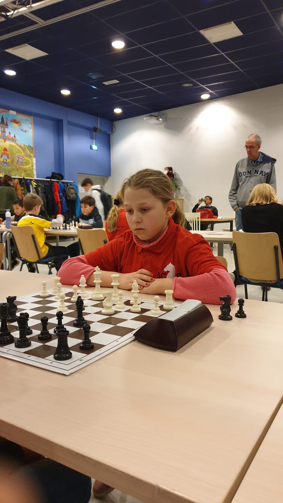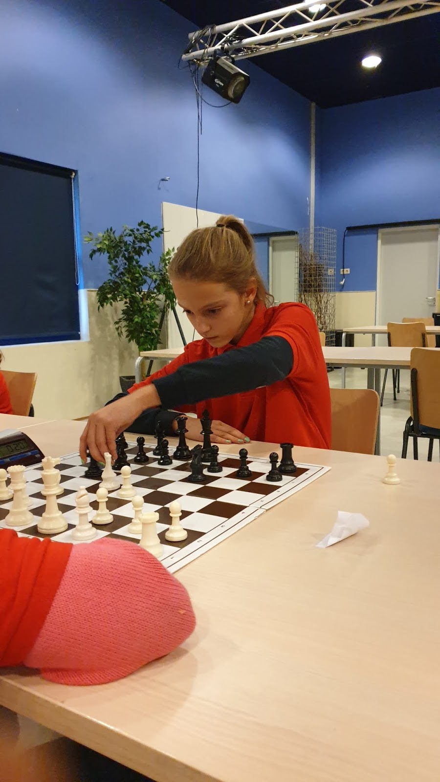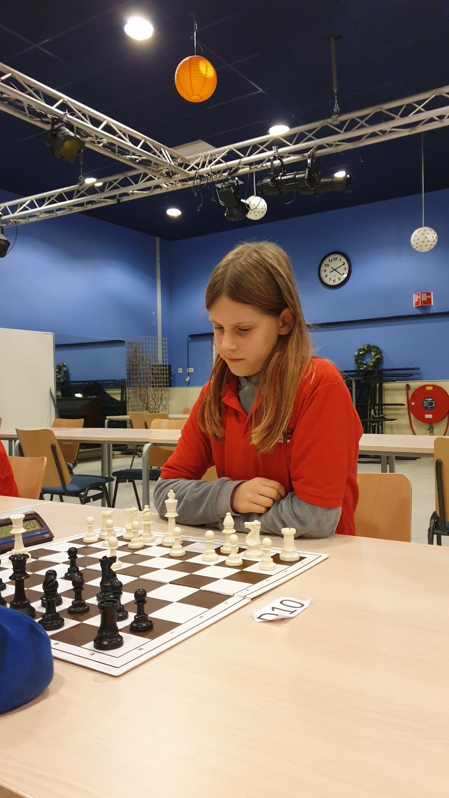 Elisa speelde in de A-groep. Ook zij is in voorbereiding op het NK en dit was een goede groep om te oefenen en te kijken waar je staat. Ze begon met een goede overwinning, maar in de tweede ronde ging er iets mis in de opening. Ze kreeg nog kansen maar verloor door tijdgebrek. Wel zag ik dat ze haar tijd al steeds beter begint in te delen. De winst van de middag. Tegen Sono stond ze goed en tegen Elliot had ze waarschijnlijk een remise eindspel dat ze verloor. In de laatste ronde tegen Luca nam ze geen remise door eeuwig schaak en verloor. Wel genoeg aandachtspunten om aan te werken en daar heeft Elisa volgens mij ook zin aan.