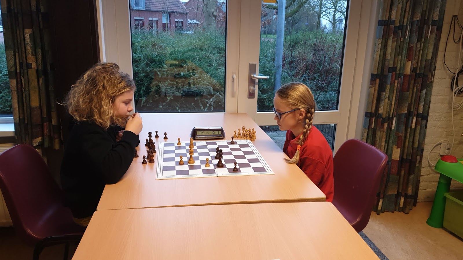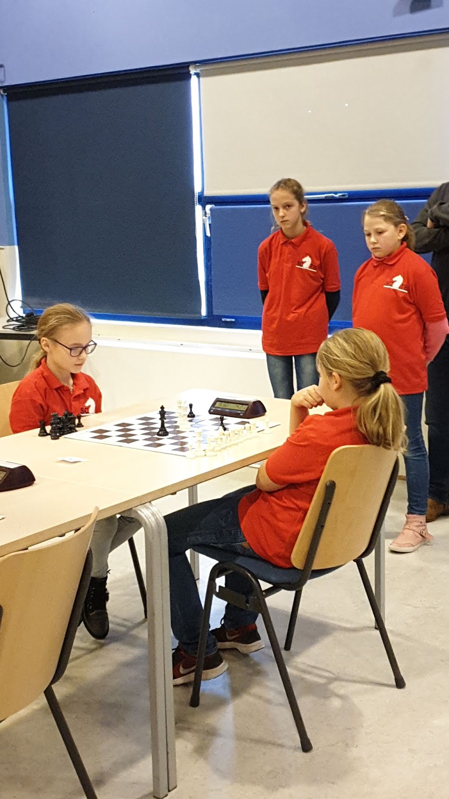 Zo eindigde een lange en spannende eerste dag van het PJK. Elisa plaatst zich door goed spel, maar ook doordat ze veel beter met haar tijd om ging. Veel sneller werden beslissingen genomen, waardoor ze geen enkele partij op tijd verloor. Eline speelde kwalitatief goed. Door hierdoor een net iets verkeerde zet viel ze net buiten de NK-plekken met 4 uit 7.