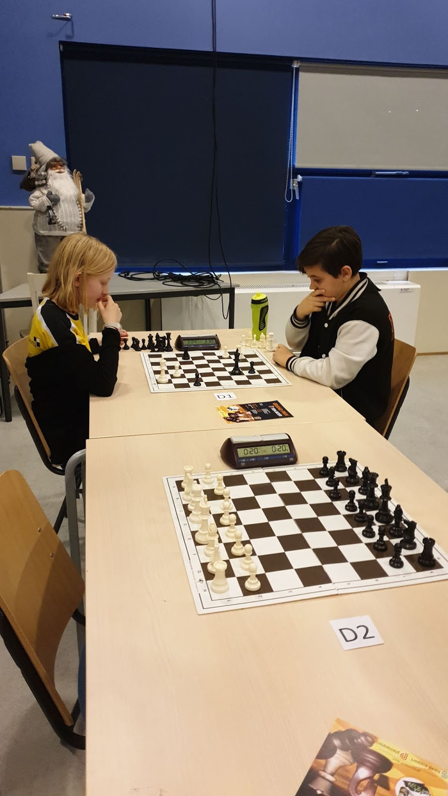 Ook in de D-categorie werd het erg spannend. Ik zag vooral dat Danique haar spel daaronder leed. Eline speelde goed, maar op de beslissende momenten ging het vaak net verkeerd. Daniël deed het naar zijn kunnen, Ivar ook. Beiden kunnen veel winnen als ze rustiger gaan spelen. Tessel kwam om te oefenen voor volgend jaar en haalde 2 uit 7. Isidora wist bijna 4 punten te halen, maar verloor een gewonnen stelling tegen Eline. De enige die redelijk constant bleef spelen was Elisa.
