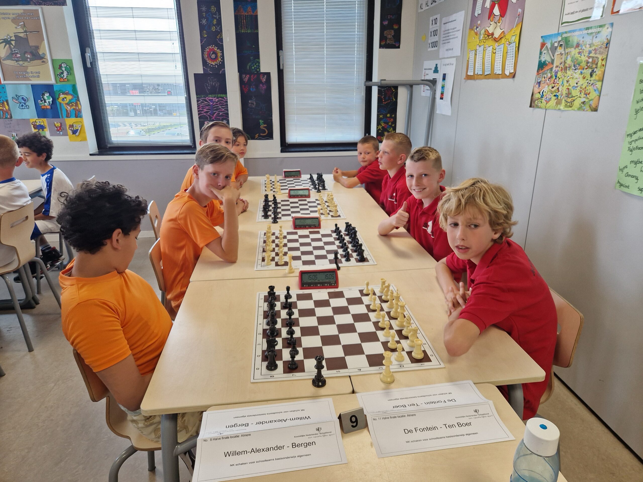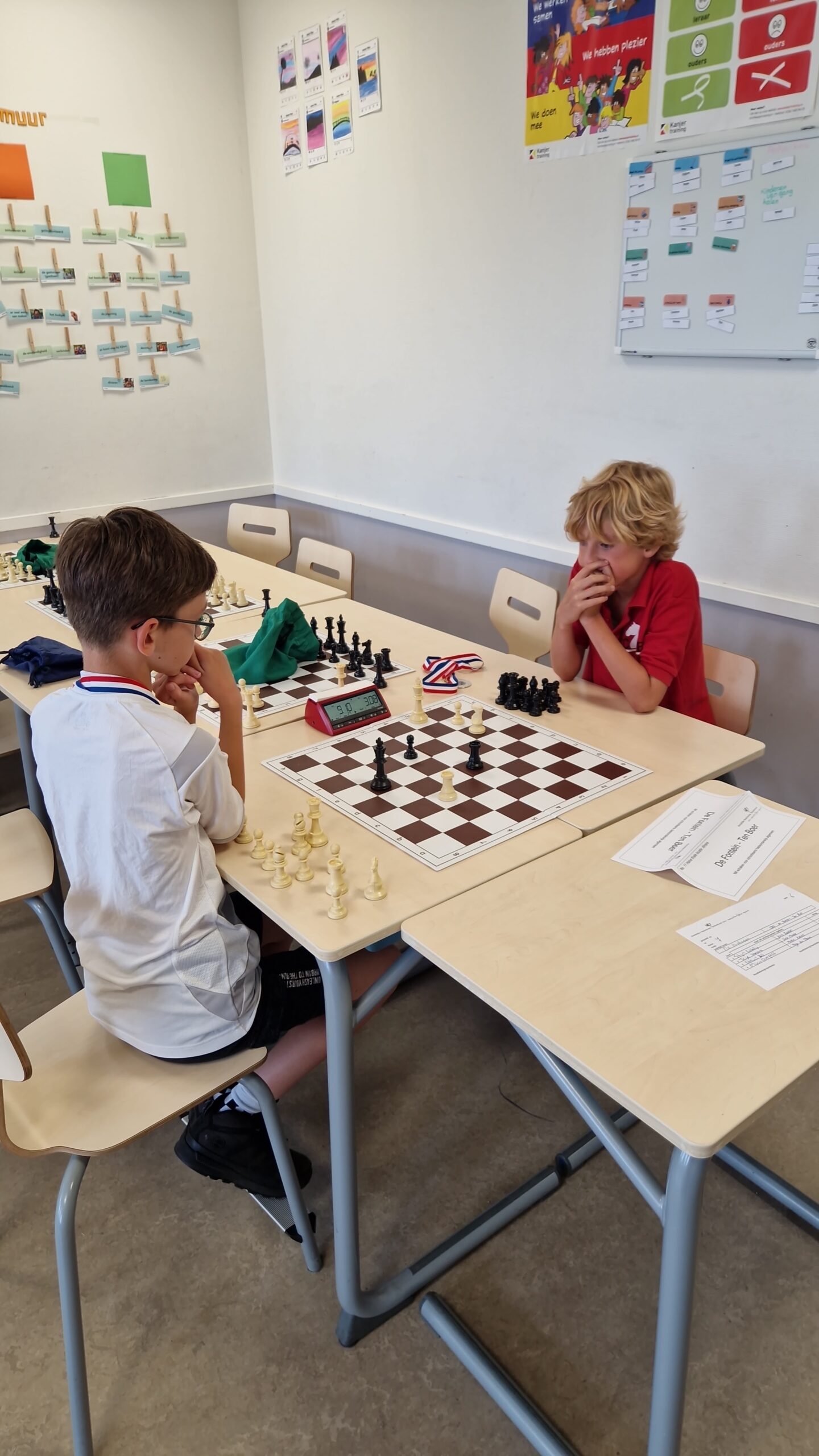 Laat ik een kort verslag per ronde geven. In de eerste ronde wonnen we met 3-1 van de Willem Alexander school (in oranje shirts!) uit Bergen. Sven nam remise om de overwinning veilig te stellen en Joris kwam er net niet doorheen maar wist de remise wel veilig te stellen. In de tweede ronde tegen Hilversum waren we te veel onder de indruk van onze tegenstander. Echte groep 8 jeugd met een coach die regelmatig achter de borden ging staan. Eigenlijk best wel overweldigend. Een 4-0 nederlaag ondanks dappere strijd.