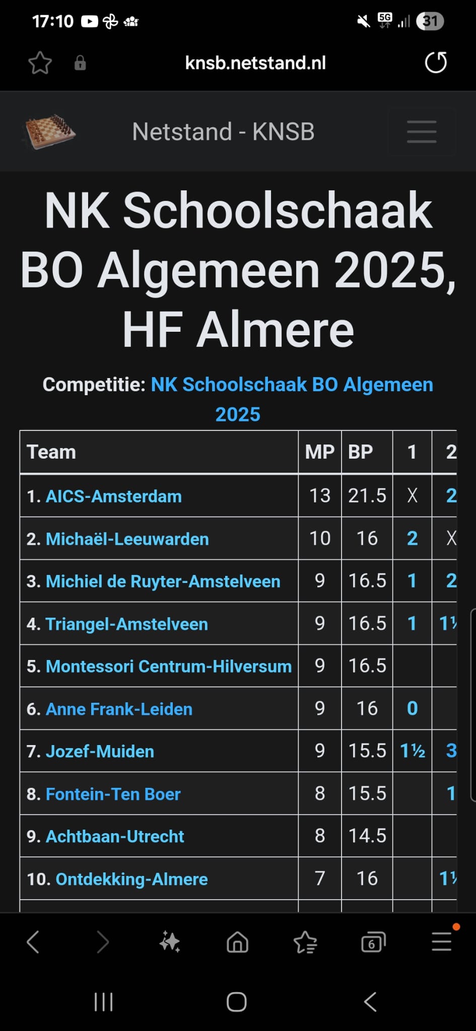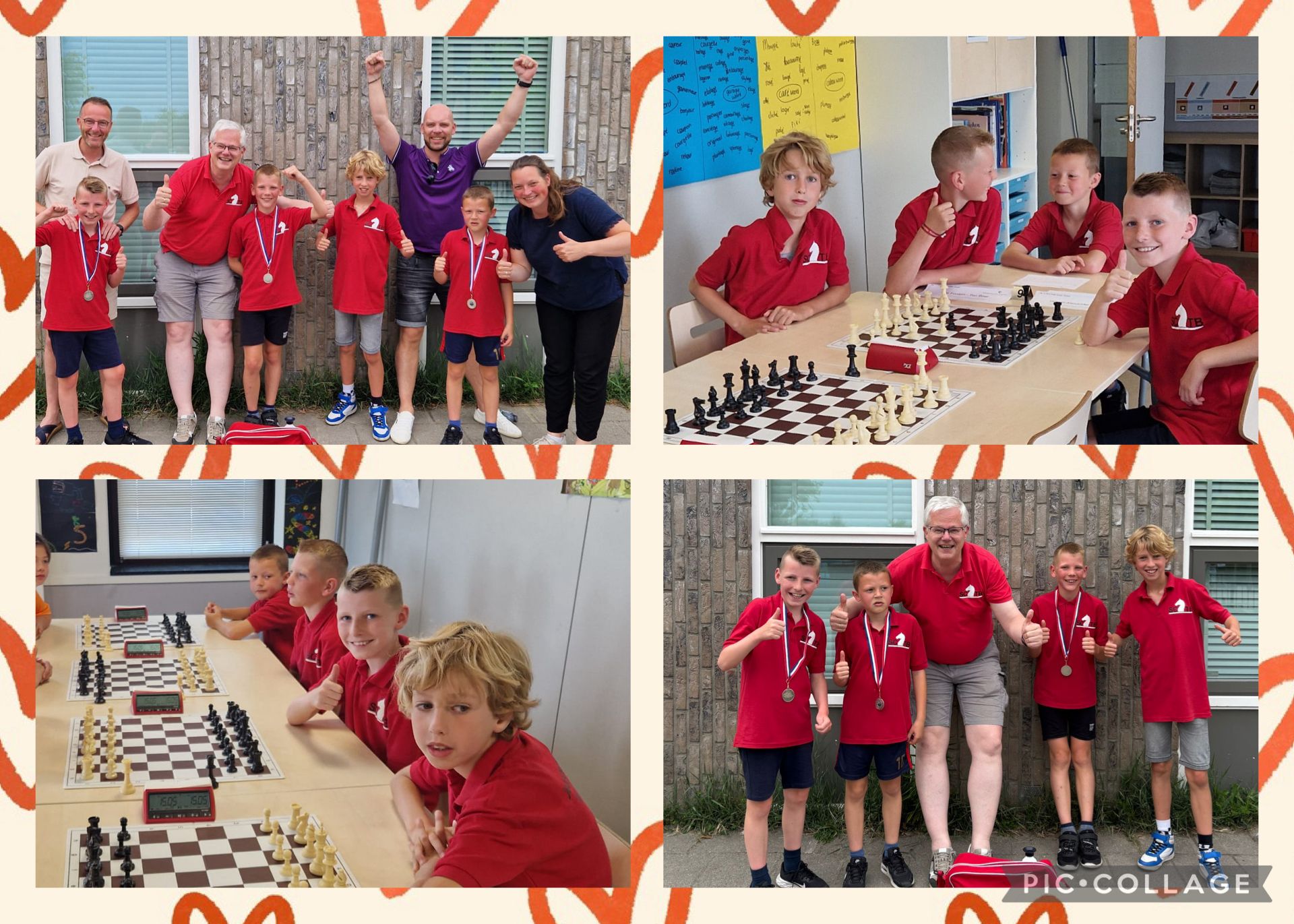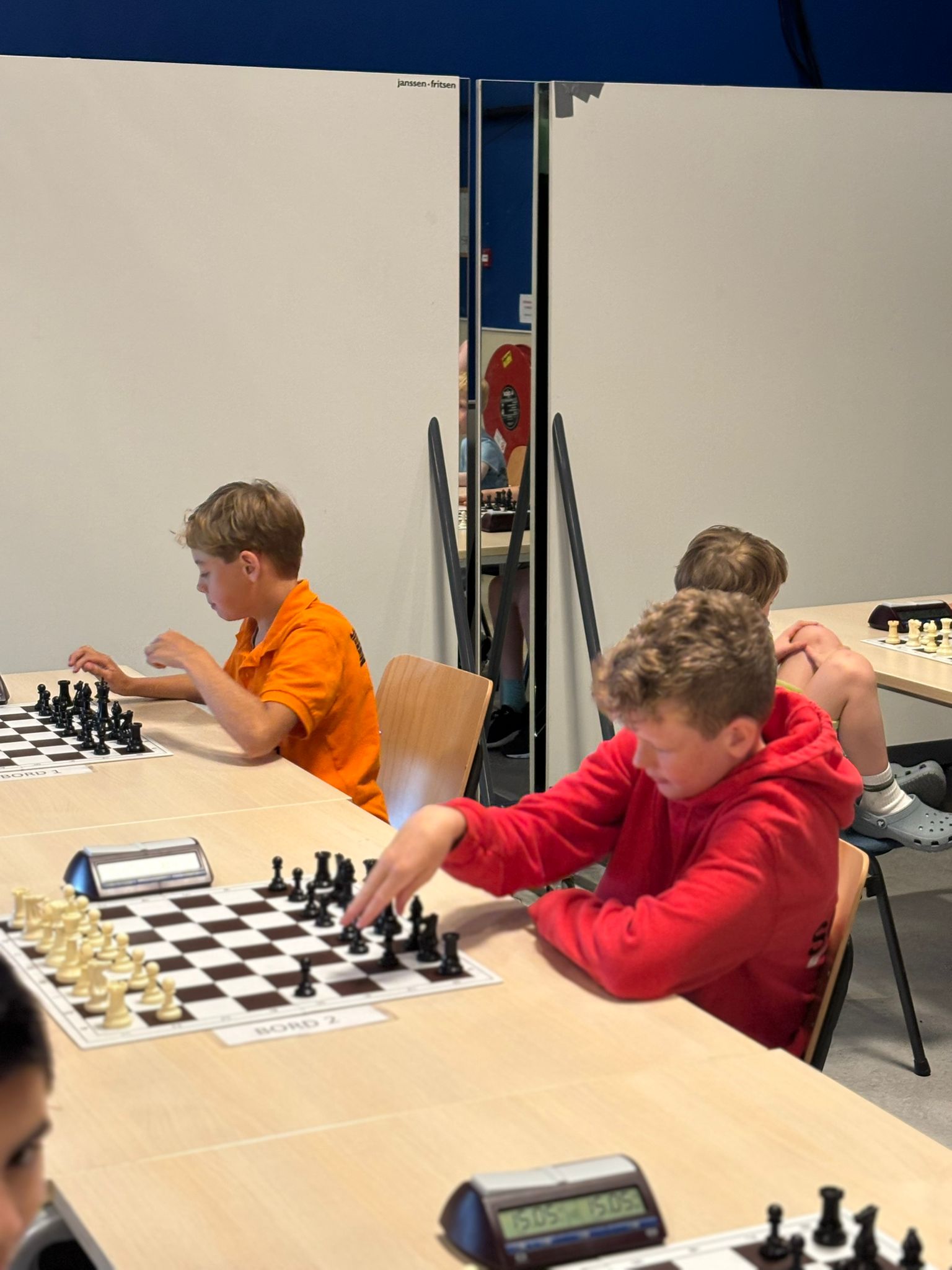 Een pittige partij voor Joris waarbij de tegenstander maar liefst zes keer remise aanbood, maar Joris vastbesloten op winst bleef spelen. Wat een vechtlust. Joris wilde beslist winnen voor het team. Het belang van de winstpartij van Joris werd de staf en begeleiding pas duidelijk toen de jeugd buiten aan het voetballen was. De einduitslagen druppelden binnen en doordat twee cruciale wedstrijden 2-2 werden bleven we boven deze 4 teams in de eindstand. Met nog een uitslag onduidelijk stonden we zevende en konden we niet meer buiten de top 8 vallen. Naar de finale!! Uiteindelijk als nummer 8 met één bordpunt, het punt van Joris, meer dan nummer 9.