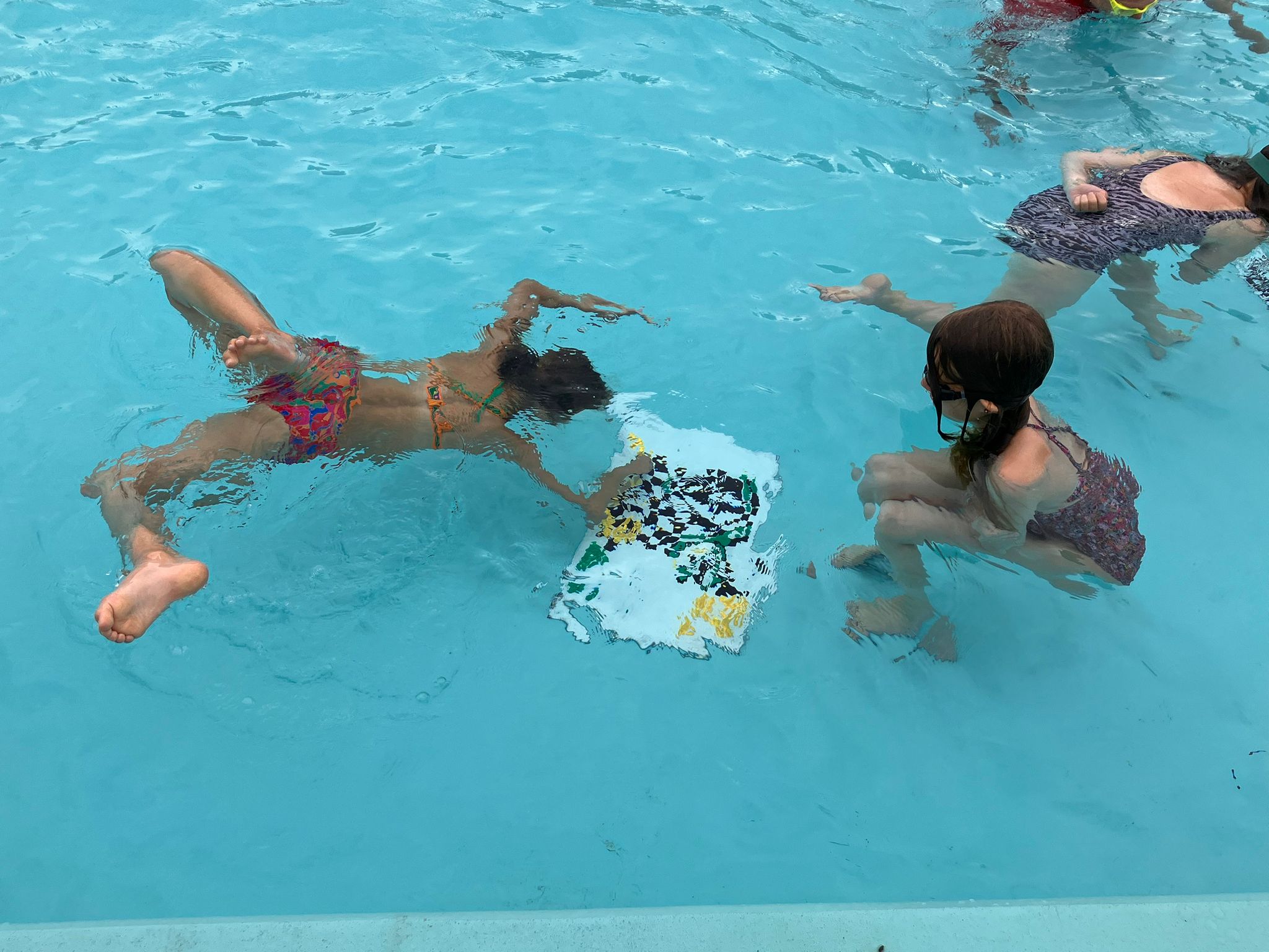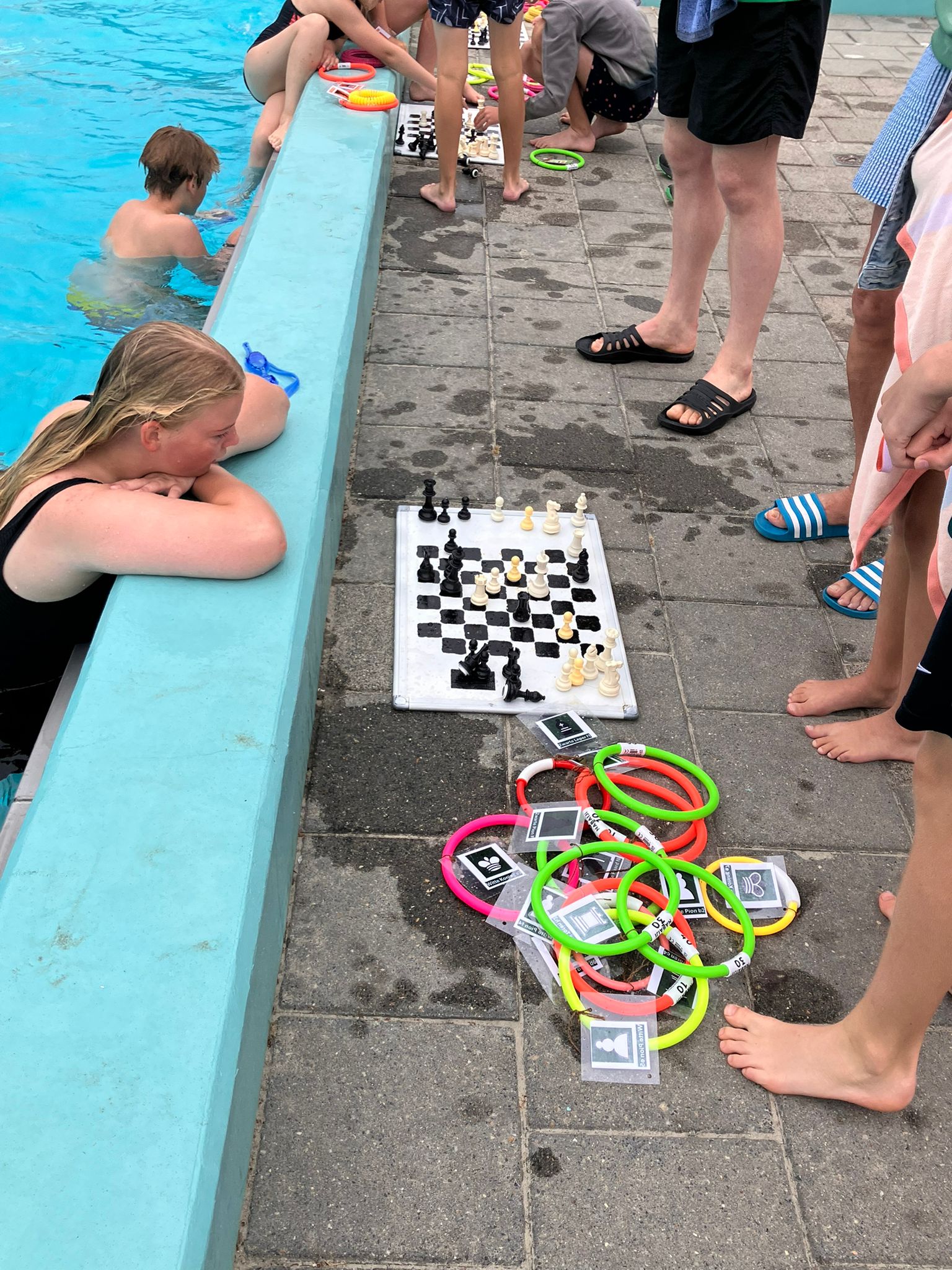 Het werd een prachtige ochtend. Terwijl de zwemclub haar training in het diepe bad deed, stelden we samen met Martin, Lisanne en Rik alles op voor de happening. Milan hielp mee om de borden in het zwembad te doen. Hierna kwamen de 21 schakers die meededen. We hebben veel leden die zowel van de schaakclub als de zwemclub lid zijn. Verder kwam Wouter van de zwemclub ons versterken. Na de uitleg volgden het inzwemmen o.l.v. Martin, Rik en Lisanne.