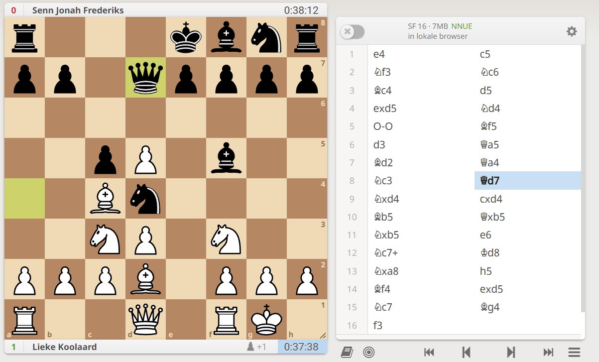 In deze stelling zag Lieke de penning op de dame en de koning met Lc4-b5. Maar dan kan het paard de loper slaan. Dus even Slaan + Hout uitboeren: 9. Pxd4 cxd4 10. Lb5 met damewinst. Ze won de partij.