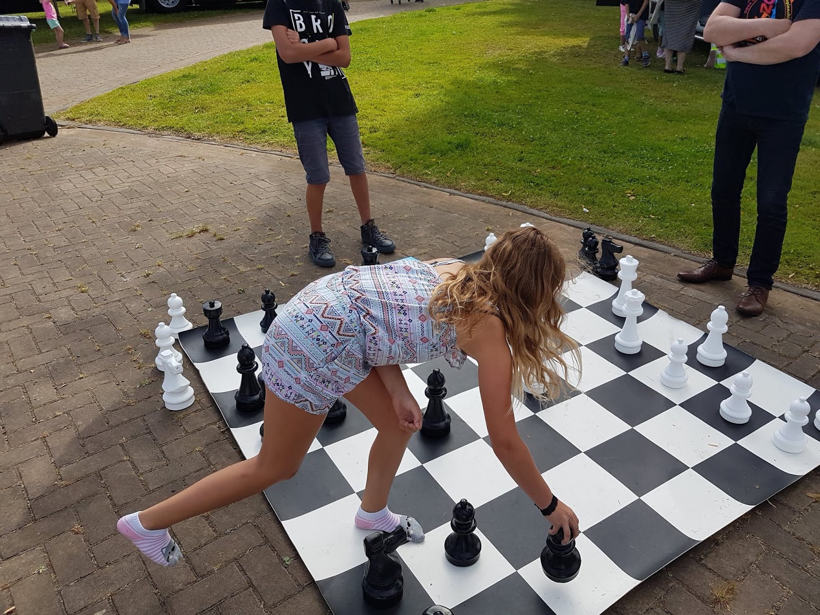 Paula List, moeder van Olaf, vroeg ons of we dit jaar als schaakclub op het centrale plein van het dorp wilden staan. Een geweldige mogelijkheid om kinderen iets te vertellen over het schaken en over de schaakclub. Omdat twee workshops uitvielen, kregen we zelfs drie keer een groepje op bezoek om uitleg te geven en ze een partij te laten schaken.