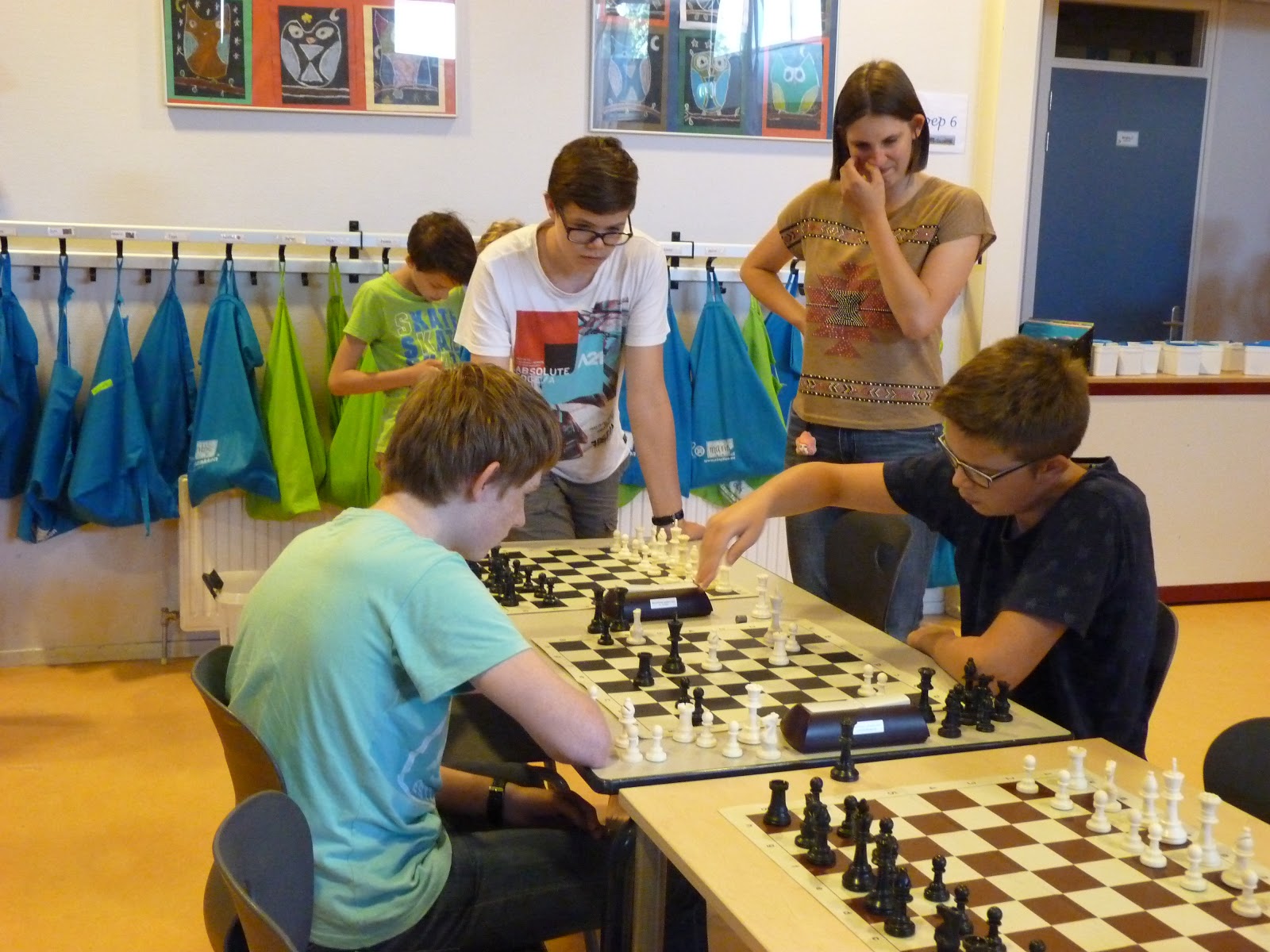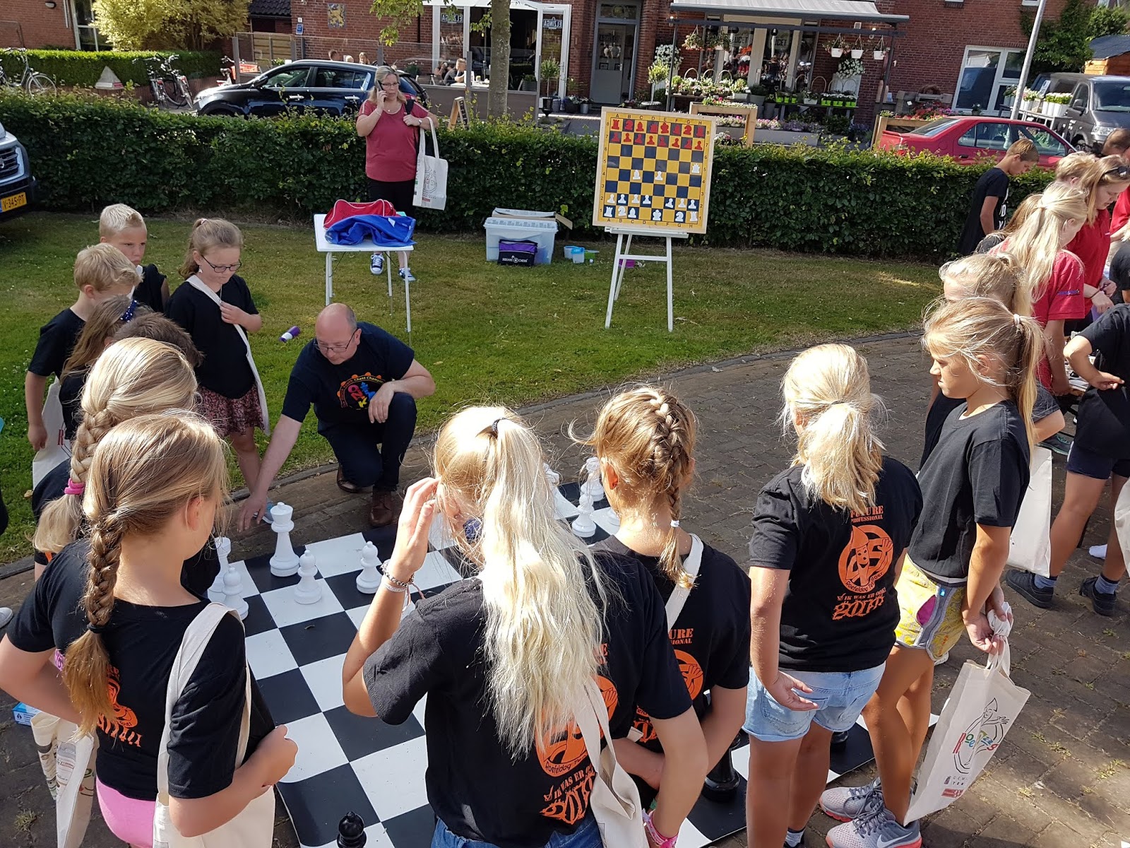 Het werd dus een geweldig succes. Mariëtte, Joël, Lindert, Gerbrich en Rowin maakten de jeugd enthousiast over schaken. Folders werden verspreid en Dirkjan, Jan en Roelof probeerden samen met de jeugdleden kinderen te helpen bij het oplossen van alle schaakzetten. Sommigen daagden Roelof zelfs uit.
