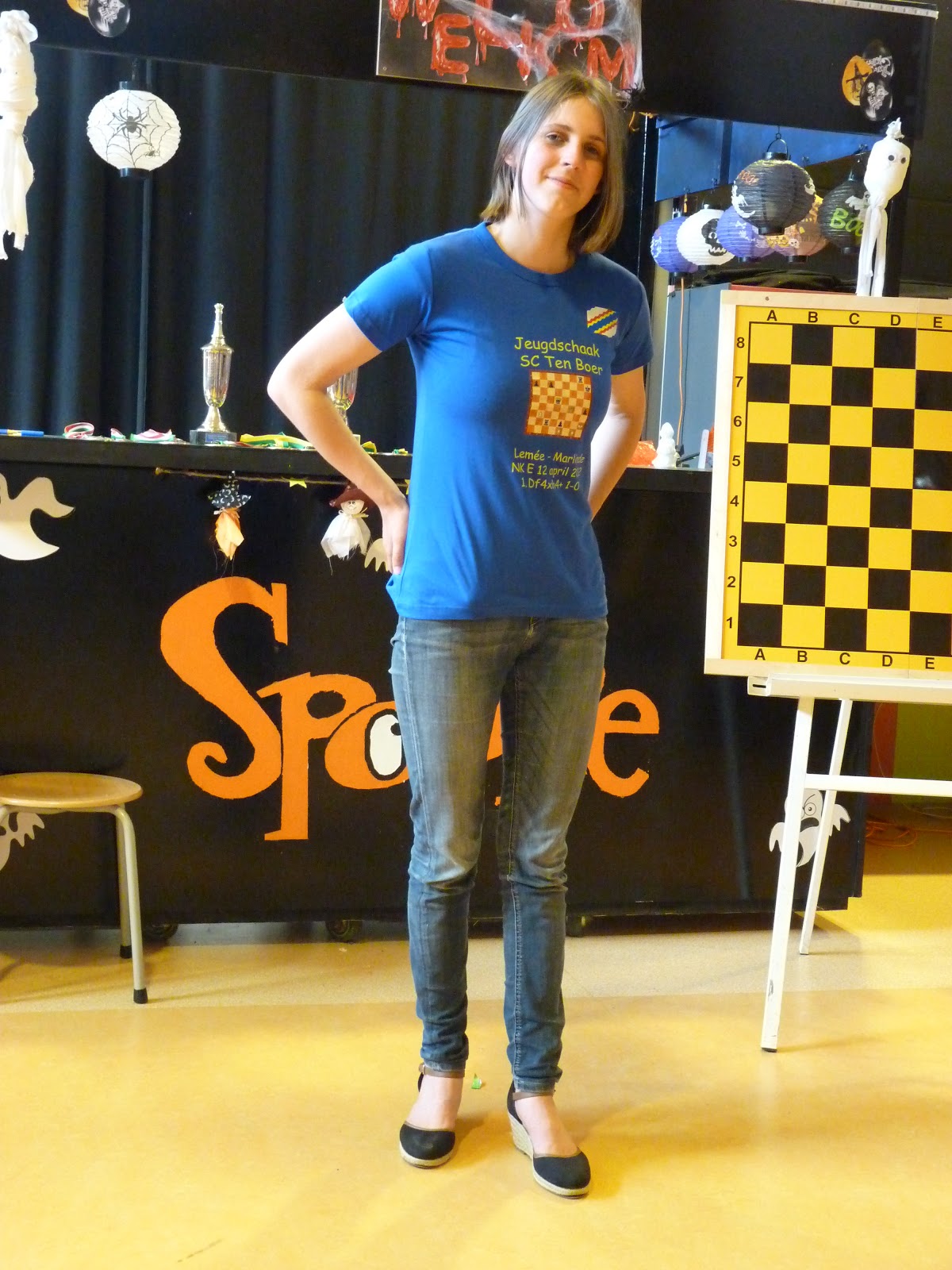 Na het schaken was er tijd voor de lange prijsuitreiking. Er waren veel ouders aanwezig en dat maakt het erg gezellig. Eerst namen we afscheid van ons nieuwe lid van de 1000+ club. Bij SC Ten Boer word je lid van de 1000+ club als je rating boven de 1000 komt. Je krijgt een shirt als je lid wordt van de club. Tot 30 juni was er nog maar één lid van de club: Gerbrich. Nu blijken ook Lemée, Rowin en Remco lid van de club te zijn geworden. Rowin en Remco pas na publicatie van de ratinglijst van 1 augustus. Zij moeten dus tot begin volgend jaar wachten. Lemée was al wel boven de 1000 gestegen. Helaas neemt ze afscheid van de club, maar wel met de versierselen van de 1000+ club van SC Ten Boer: een mooi shirt met een stelling uit een door Lemée gespeelde partij. Voor Lemée is dit een stelling uit haar NK E in 2012 tegen Marlinde Waardenburg. Van harte en welkom bij de club, Lemée. En veel dank voor alles wat je voor de club hebt gedaan.