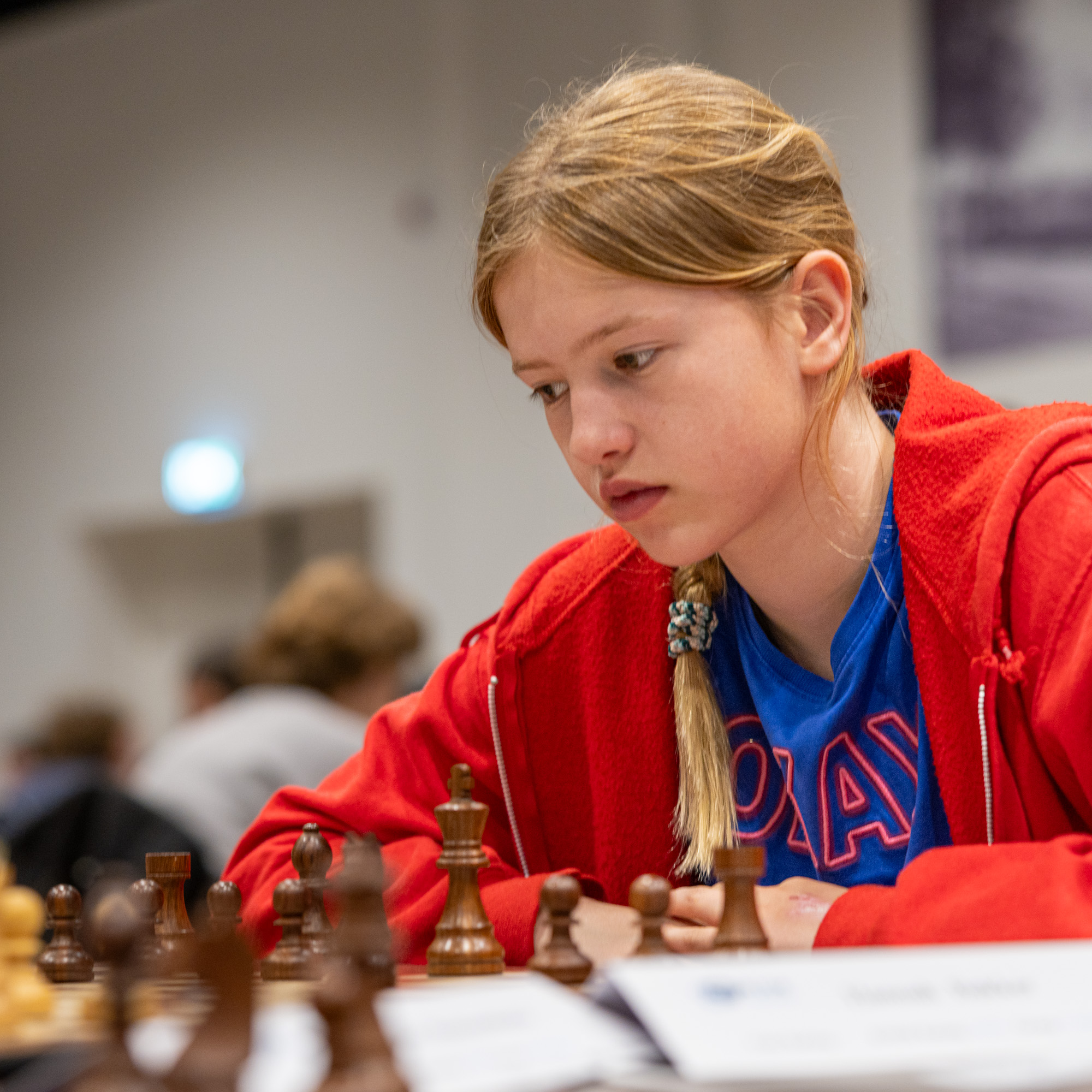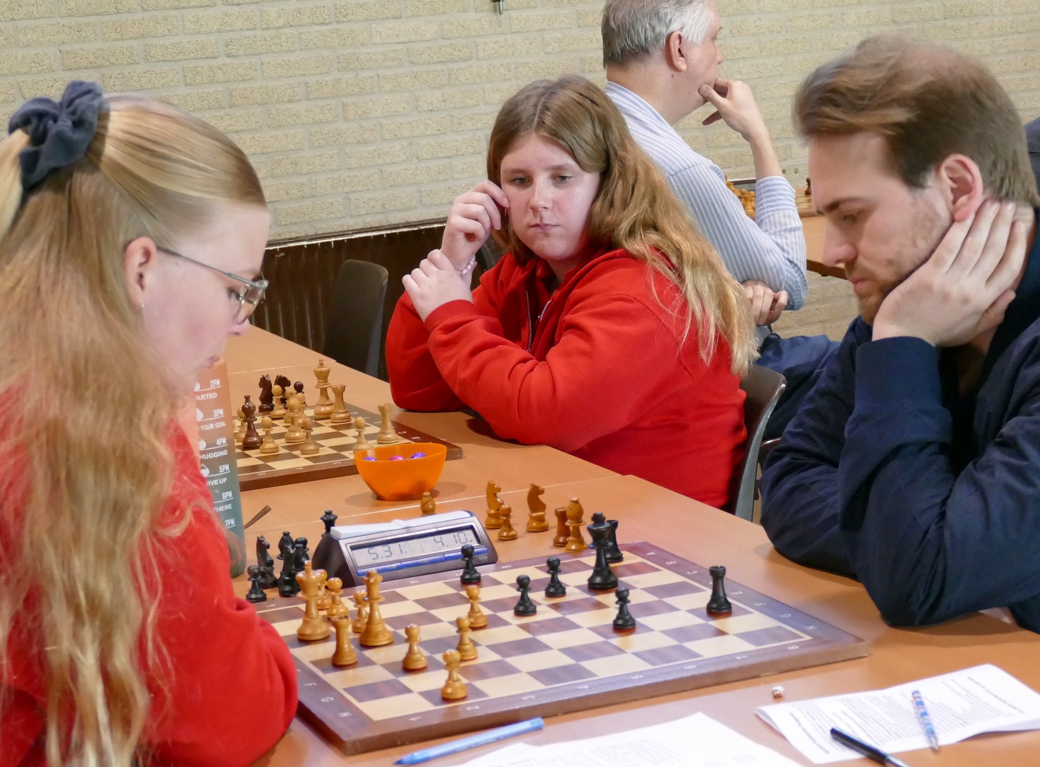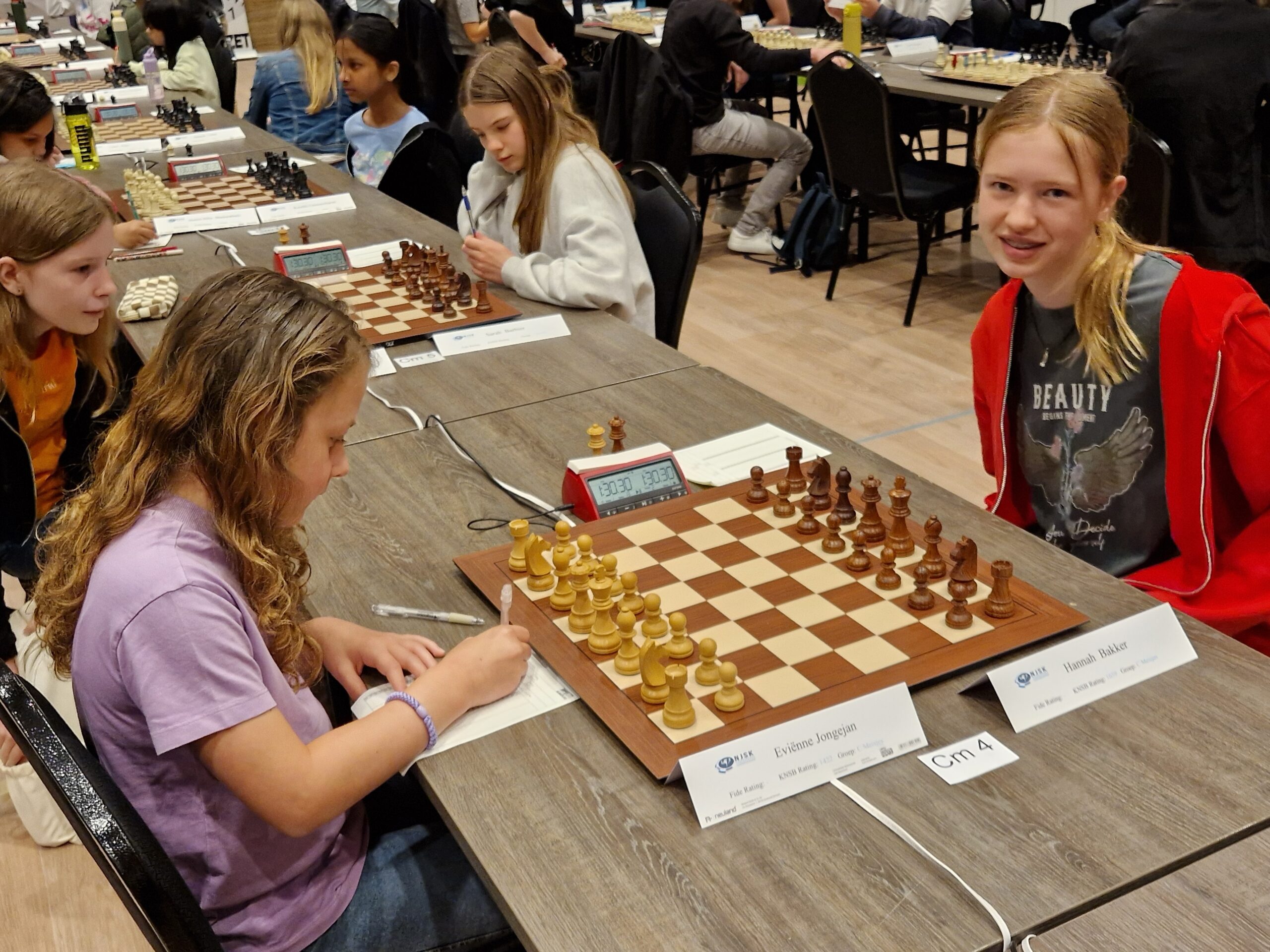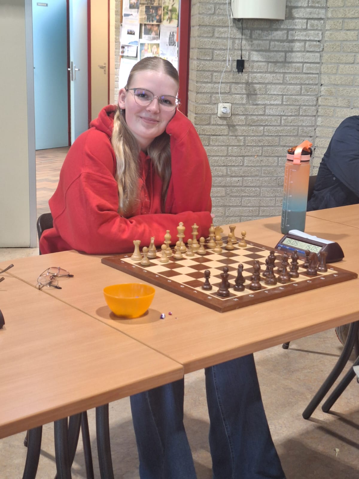 Hannah begon ook goed met een prima partij. Maar waar Bram de handigheid op dit niveau al heeft, moet Hannah deze ervaring nog opdoen. Die handigheid ontbrak gisteren. Waar ze bijna de hele partij een pion voor stond vergat ze om de partij af te maken. Daardoor bleef haar tegenstander Eviënne in de partij en toen Hannah na 2 uur een verkeerde afruil deed was er een verloren pionneneindspel over. Jammer, Hannah, maar jouw tijd komt nog!