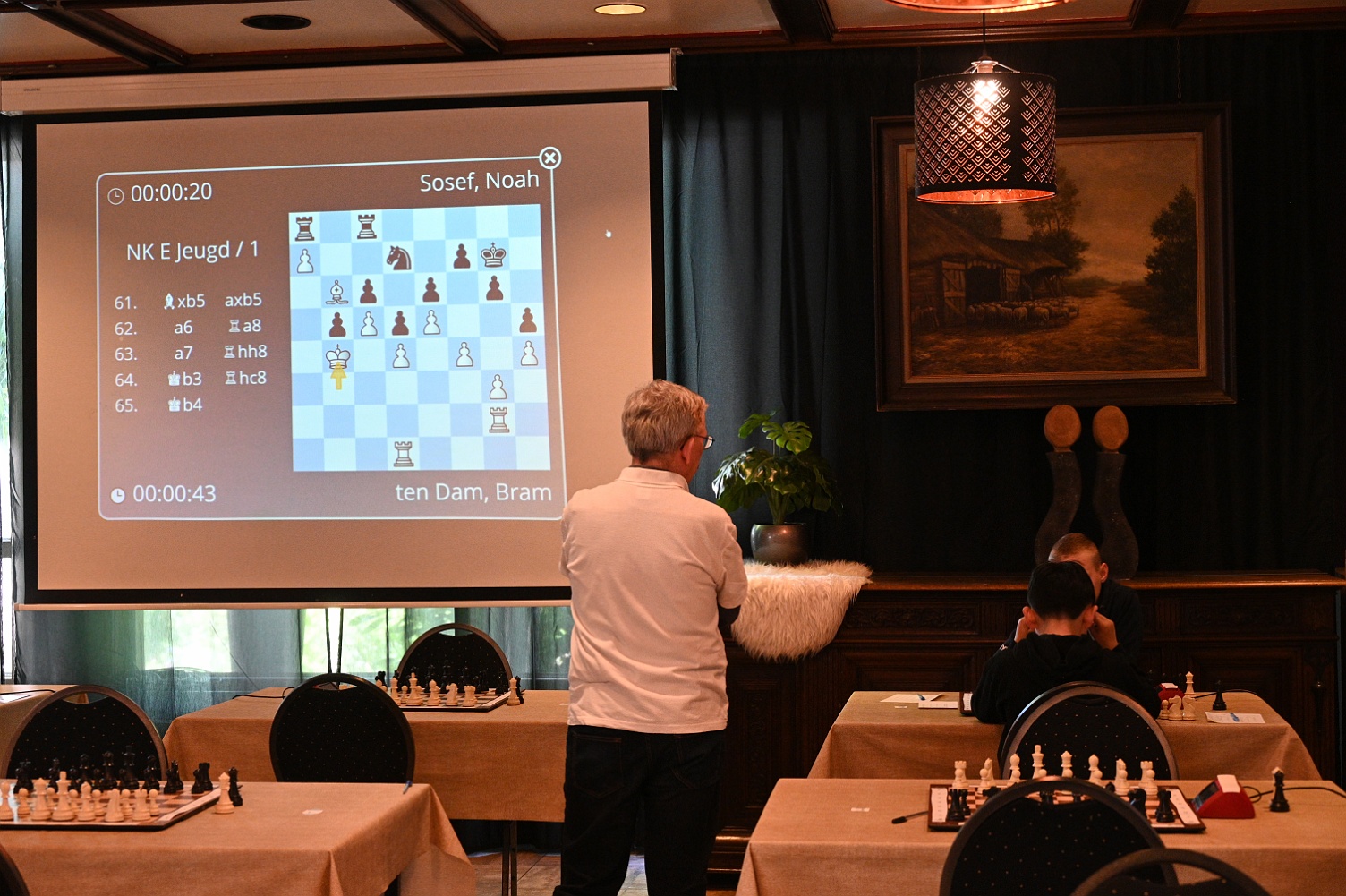 Na 7 ronden 100%. Dat betekent dat de titel heel dichtbij is. De laatste twee ronden sluipt de vermoeidheid in het spel. Tegen Aadvik krijgt Bram een goede stelling en na zwarts optimistische f7-f5 ook behoorlijk wat voordeel. Bram mist echter de scherpte om de stelling open te breken en zwart krijgt tegenspel op de damevleugel. Er wordt tot remise besloten. Even denken we in Damwoude dat Bram al Nederlands kampioen is. Echter Noah, zijn tegenstander uit ronde 4, kan nog gelijk komen. In de laatste ronde is dus een remise nodig. Ik krijg zelf het gevoel dat Bram de laatste ronde een beetje met de handrem erop speelt. Hij speelt wat tam, krijgt zeker in het toreneindspel een grote kans, maar is tevreden met remise. Waarom ook het risico nemen?