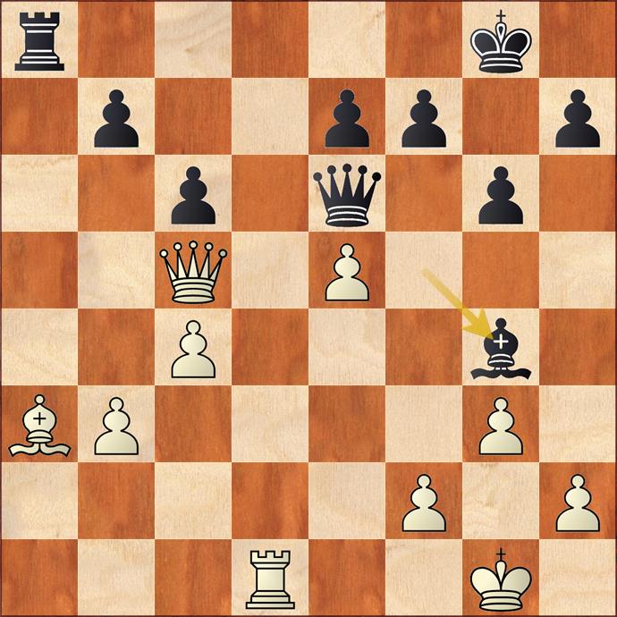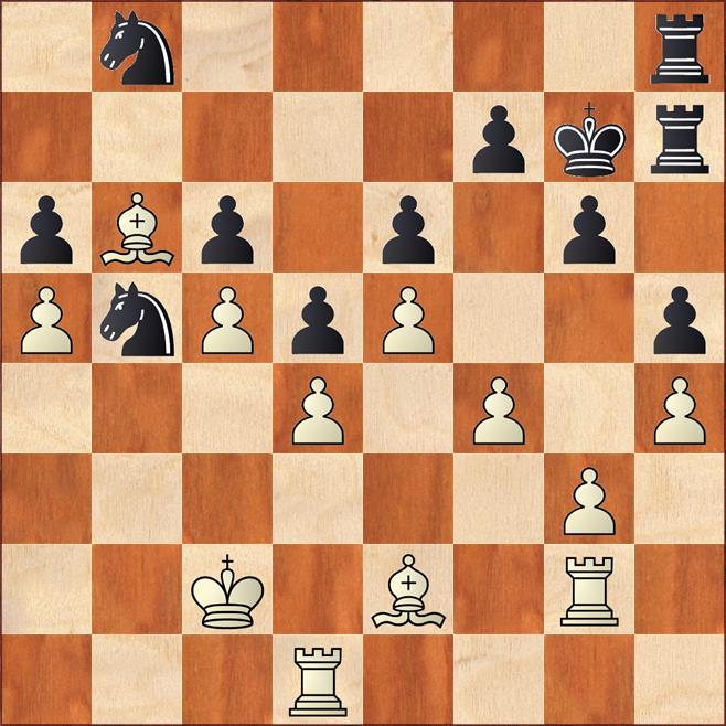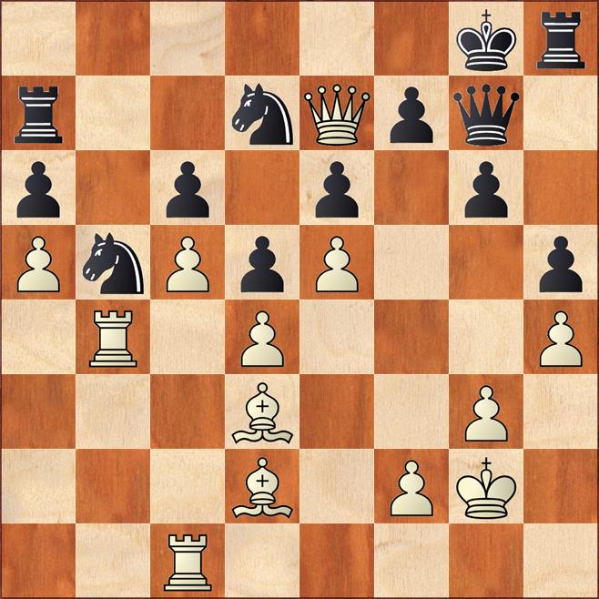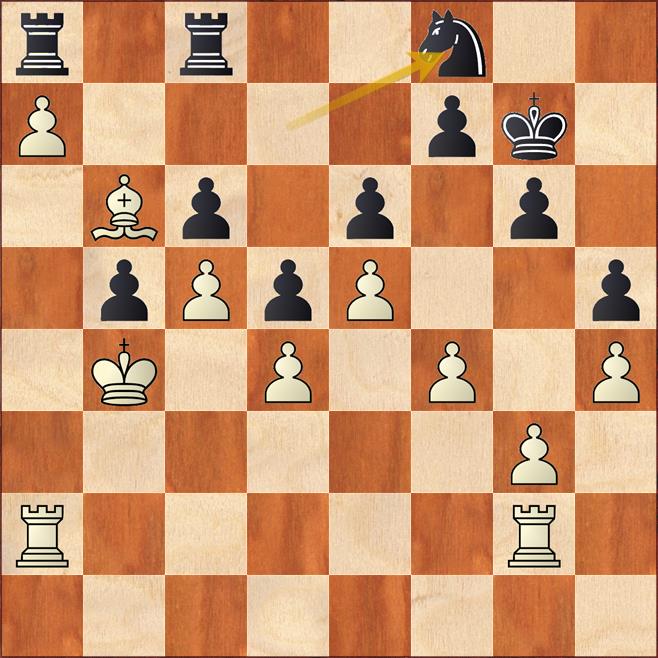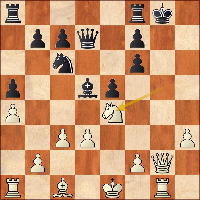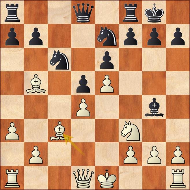 De enige zet volgens de engine is 14… Lxg5. Na 15. Pxg5 kan zwart de loper op f5 (o.a. nodig om h7 te dekken) verdedigen met het pionoffer 15… Pf4 16. Lxf4 exf4 17. Dxf4 Df6. Na 15. Dxf5 Lxc1 16. Txc1 g6 of 16… Pf4 zijn er ook nog verdedigingsmogelijkeden.