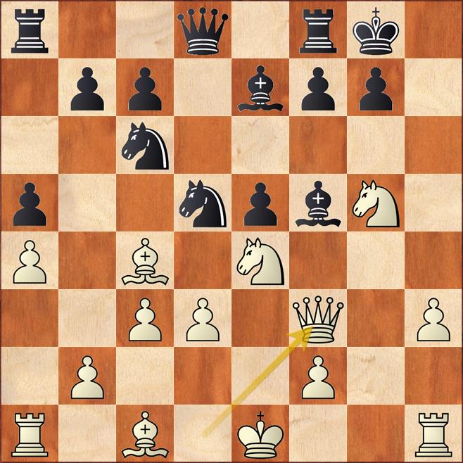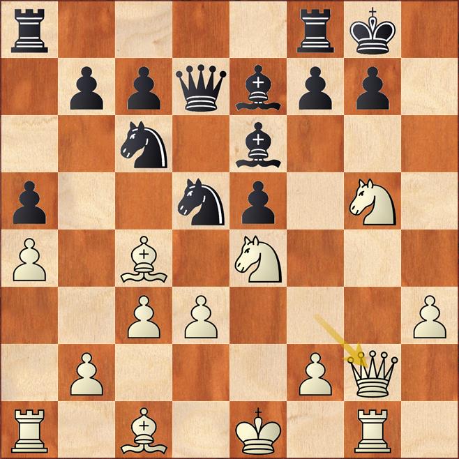 Nu komen er allemaal tactische trucjes in. Echter zwart kan zich nog verdedigen. Zelf zat ik naar 14. Db3 te kijken. De engine geeft echter 14. Tg1 met beslissend voordeel. Na 14… Dd7 volgt de partij voortzetting zonder de zet die zwart nu heeft.