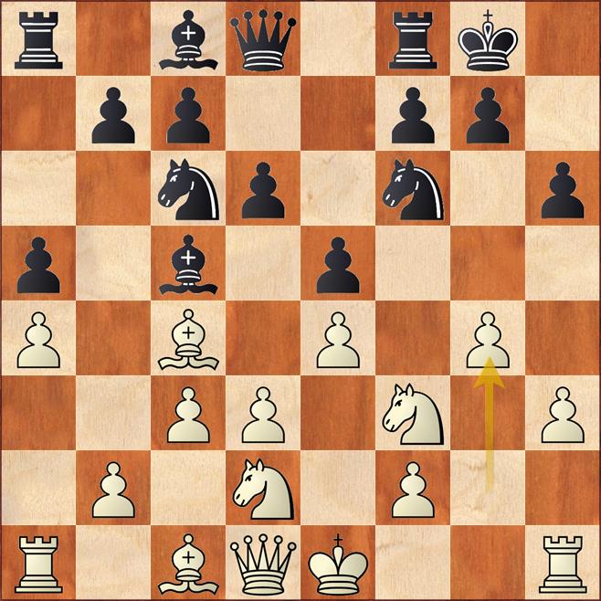 ‘De standaard reactie op een flankaanval is een tegenstoot in het centrum’ zeggen de leerboekjes. Toch geeft wit dit een nieuw aanknopingspunt. Het paard kan naar e4, g4-g5 kan en de pion op f7 is gepend dus na g5 is g5-g6 een serieuze dreiging. 10. exd5 Pxd5 11. Pe4 Le7 12. g5 hxg5 Dit opent de stelling. Vermoedelijk is de stelling gesloten houden met 12… h5 aan te bevelen, ook al is dan de druk over de diagonaal c4-g8 in combinatie met g5-g6 ook heel vervelend. Bijvoorbeeld 13. Db3 Le6 14. g6 Dd7 (14… fxg6 15. Pfg5 is al mis) 15. gxf7+ met veel aanval.