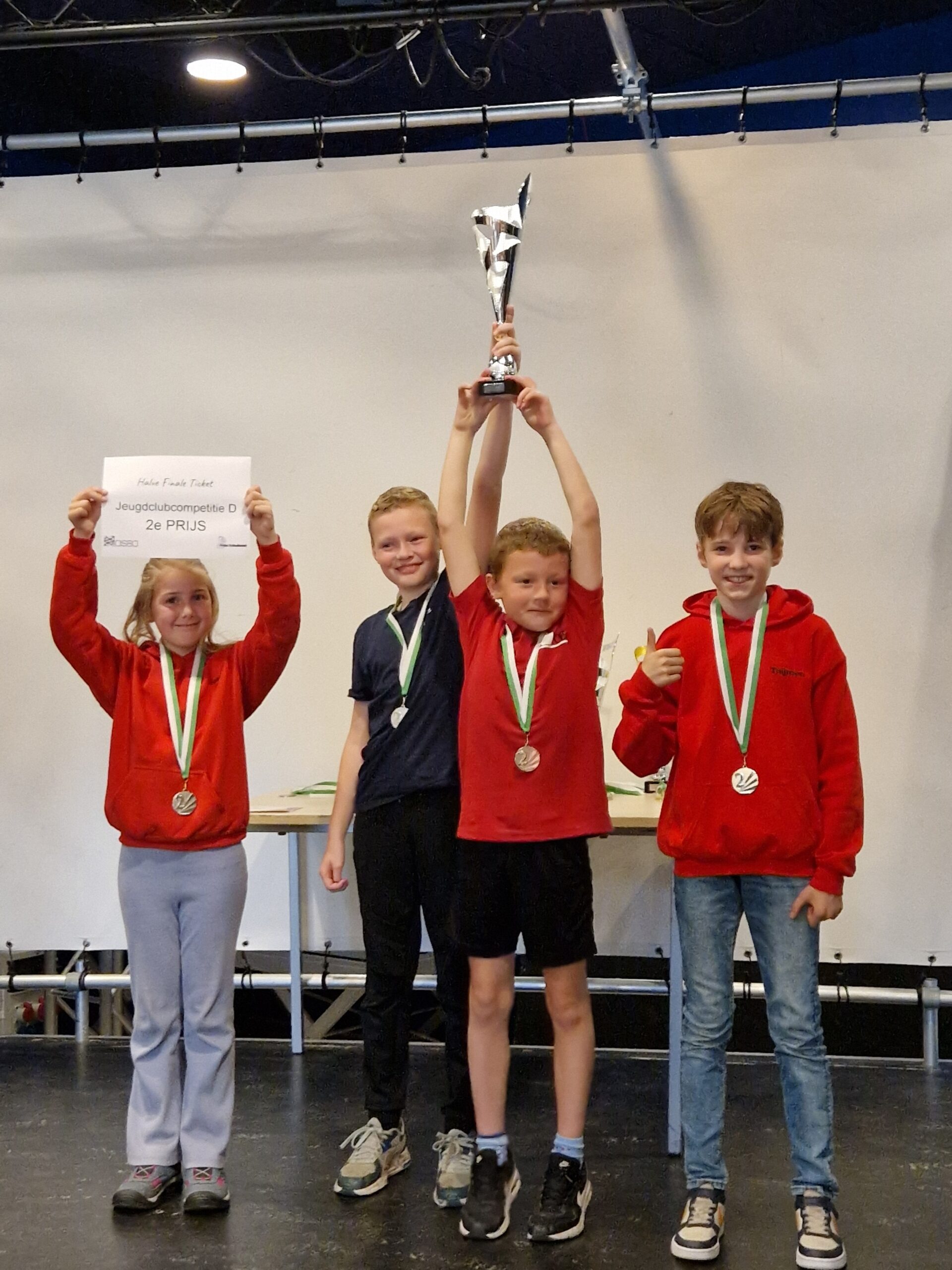 Het AB-team bestond uit Hannah, Sarah, Noa, Timo en Vincent. Het team was op papier verreweg het met de minste ratingpunten dus van tevoren was duidelijk: leren vanmiddag en hopelijk scoren we een bordpunt. Het werd een ware zegetocht voor het team. Allereerst omdat het team gewoon een heel leuk team samen is. De meiden kunnen het al goed met elkaar vinden en Vincent en Timo bleken er uitstekend bij te passen. Het was een gezellig team dat bij het inschaken voor de wedstrijd al veel plezier met elkaar hadden. Bovendien zijn Noa en Hannah op de club actief bij de jongere groepen en daardoor ook een leuke interactie tussen D- en AB-team. Dat bleek wel uit het voetballen op het dakterras tussen de rondes.