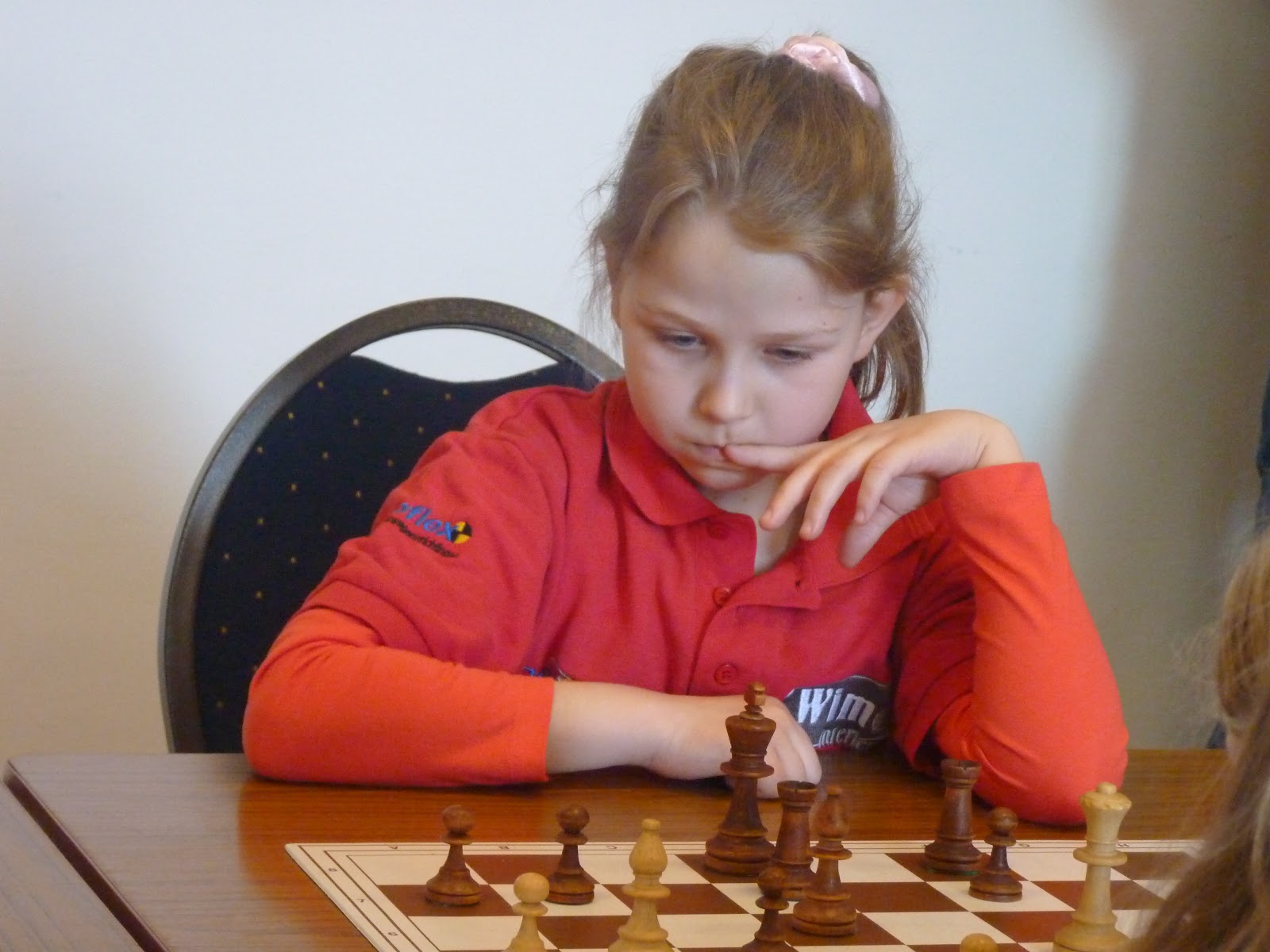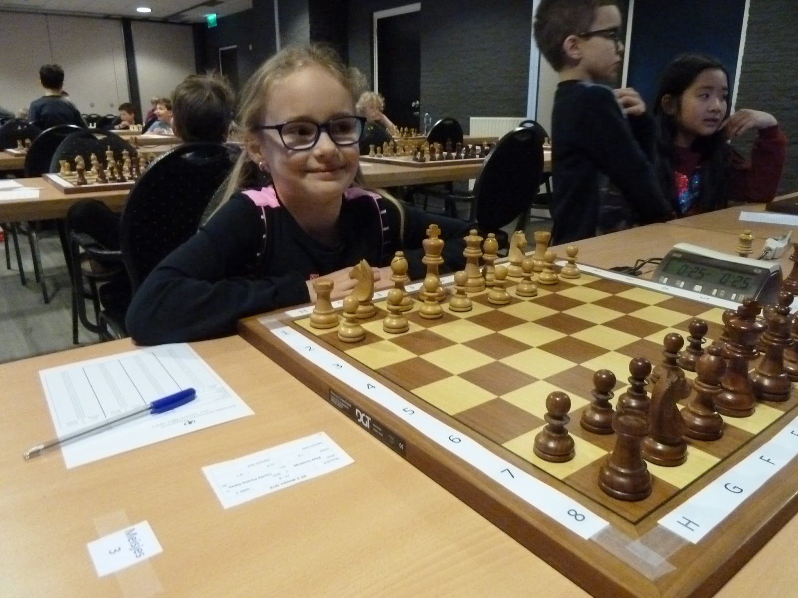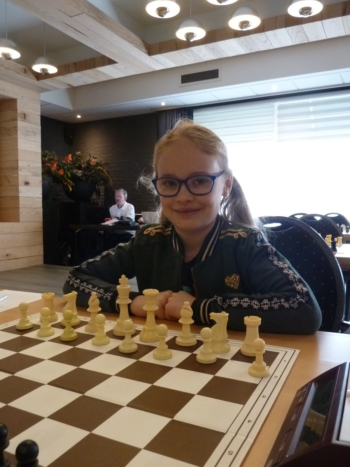 Elisa slaat nu wel toe. Ze speelt een goede partij met zwart. Haar tegenstander is een echte aanvalster. Ik zie haar in ronde 8 een perfecte mataanval met offers van toren en paarden uitvoeren. Tegen Elisa komt ze er echter niet aan te pas. Elisa wint een kwaliteit, besluit aan te vallen en speelt het mooie c7-c6 om het paard op c3 uit de partij te houden. De onderste rij wordt te zwak en Elisa zet mat.