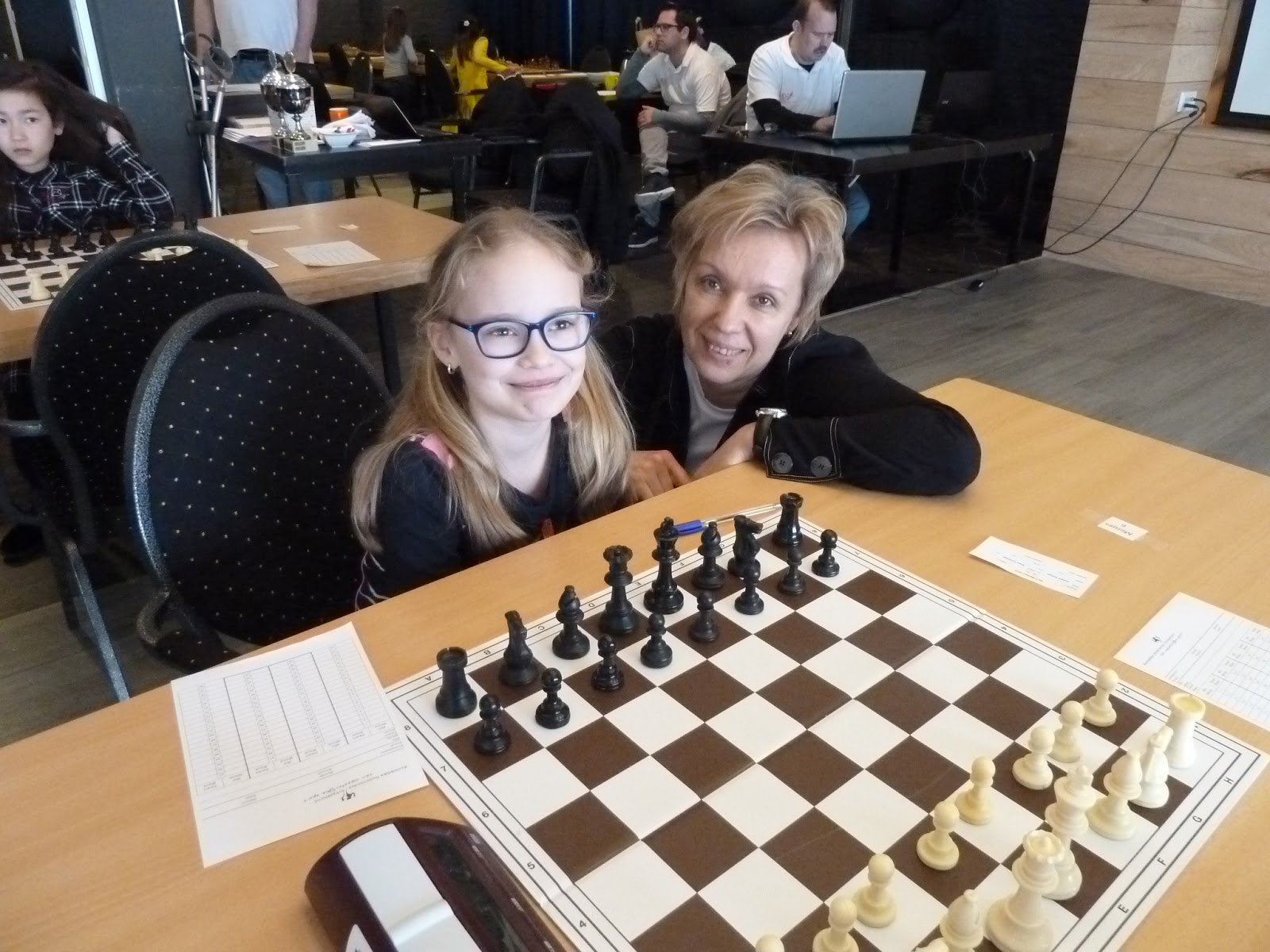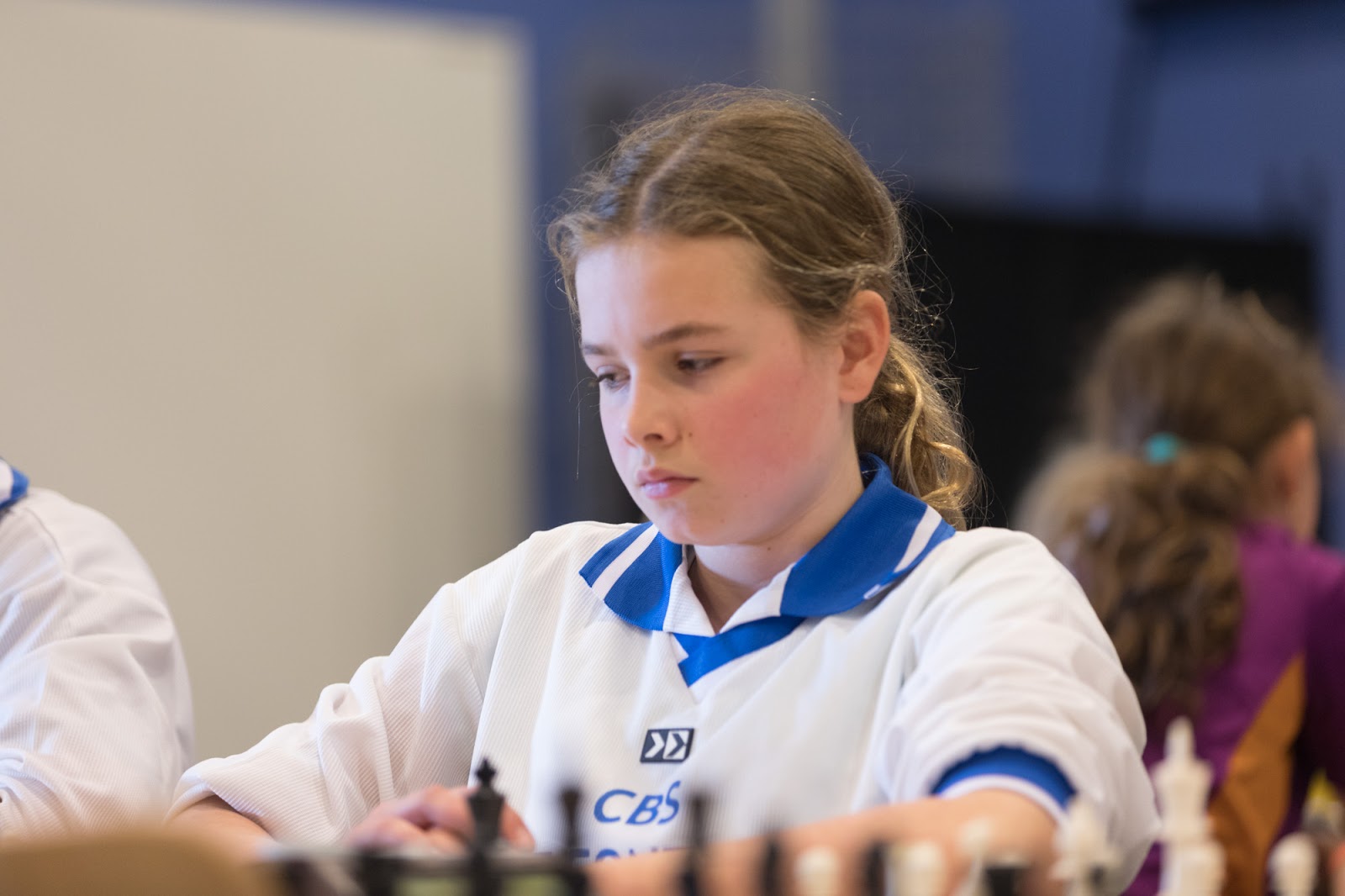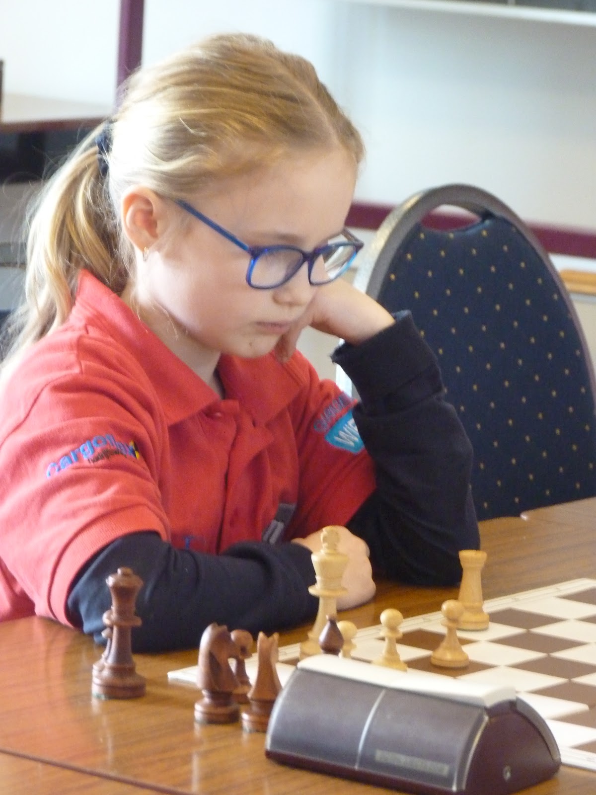 Elisa slaat nu wel toe. Ze speelt een goede partij met zwart. Haar tegenstander is een echte aanvalster. Ik zie haar in ronde 8 een perfecte mataanval met offers van toren en paarden uitvoeren. Tegen Elisa komt ze er echter niet aan te pas. Elisa wint een kwaliteit, besluit aan te vallen en speelt het mooie c7-c6 om het paard op c3 uit de partij te houden. De onderste rij wordt te zwak en Elisa zet mat.