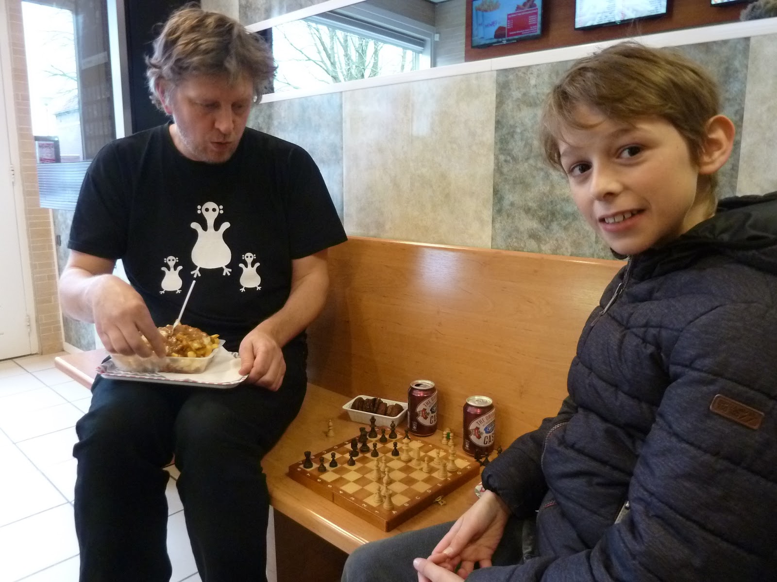 Voor Jan een sneue ronde. Jan speelde heel lang goed mee, stond misschien één pion achter toen hij misselijk werd en moest opgeven. Jammer want hij heeft een heel goede eerste dag achter de rug.
