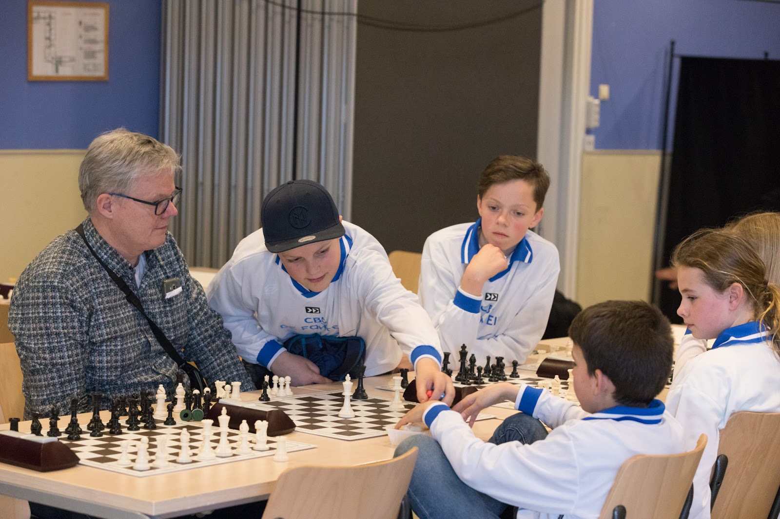 Op woensdag 7 maart werd eindelijk het basisschoolschaak kampioenschap gespeeld. De afgelopen jaren werd dit altijd in november gehouden, maar door omstandigheden lukte dat niet. We moesten daarom uitwijken naar 2018 en toen bleek dat door stakingen, vakanties de enige geschikte datum 7 maart was. Het bleek alleen lastig een zaal te regelen. Dus vroegen we aan Geon Knol en organisator CBS de Zaaier of we samen met hen het toernooi konden organiseren. Dat kon, waarvoor veel dank. Er wordt in dit kampioenschap niet individueel maar in teams gespeeld. Het volgende probleem: want alleen de Fontein kon 3 teams opbrengen. Gelukkig bleek het mogelijk om een combinatieteam in te schrijven.