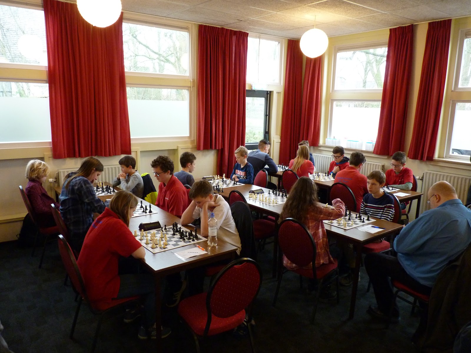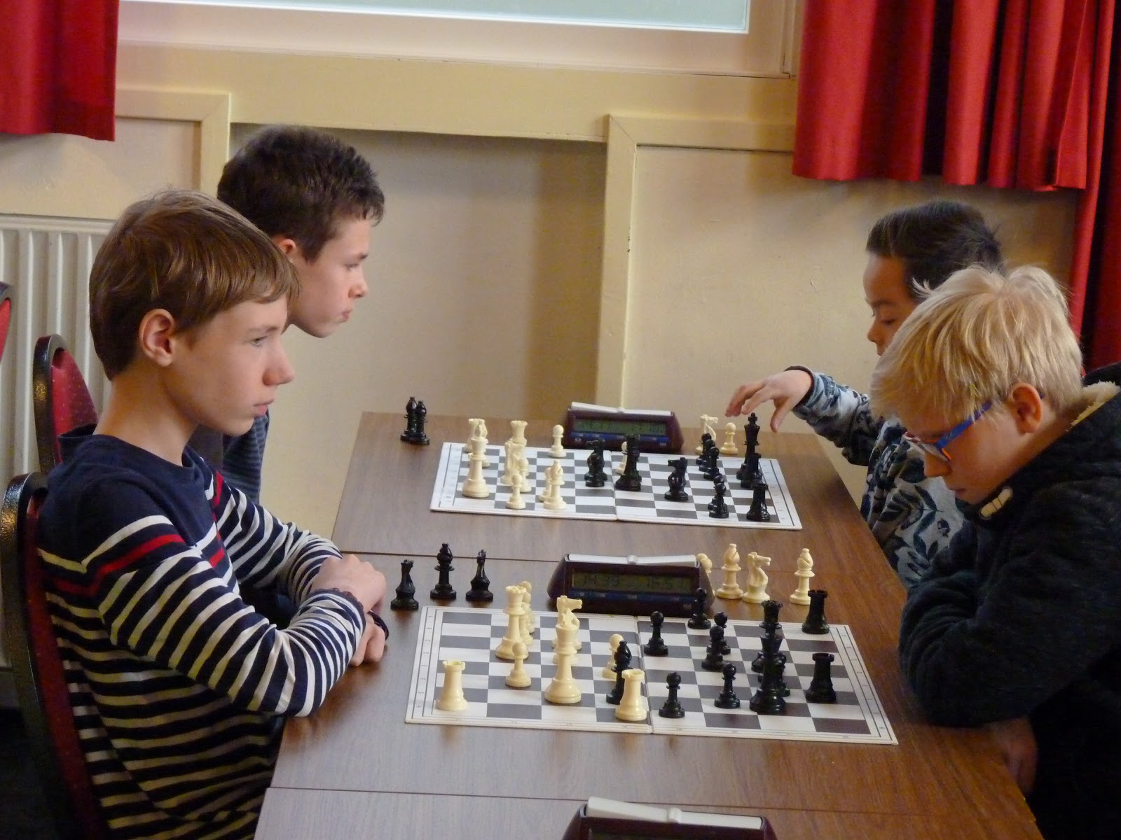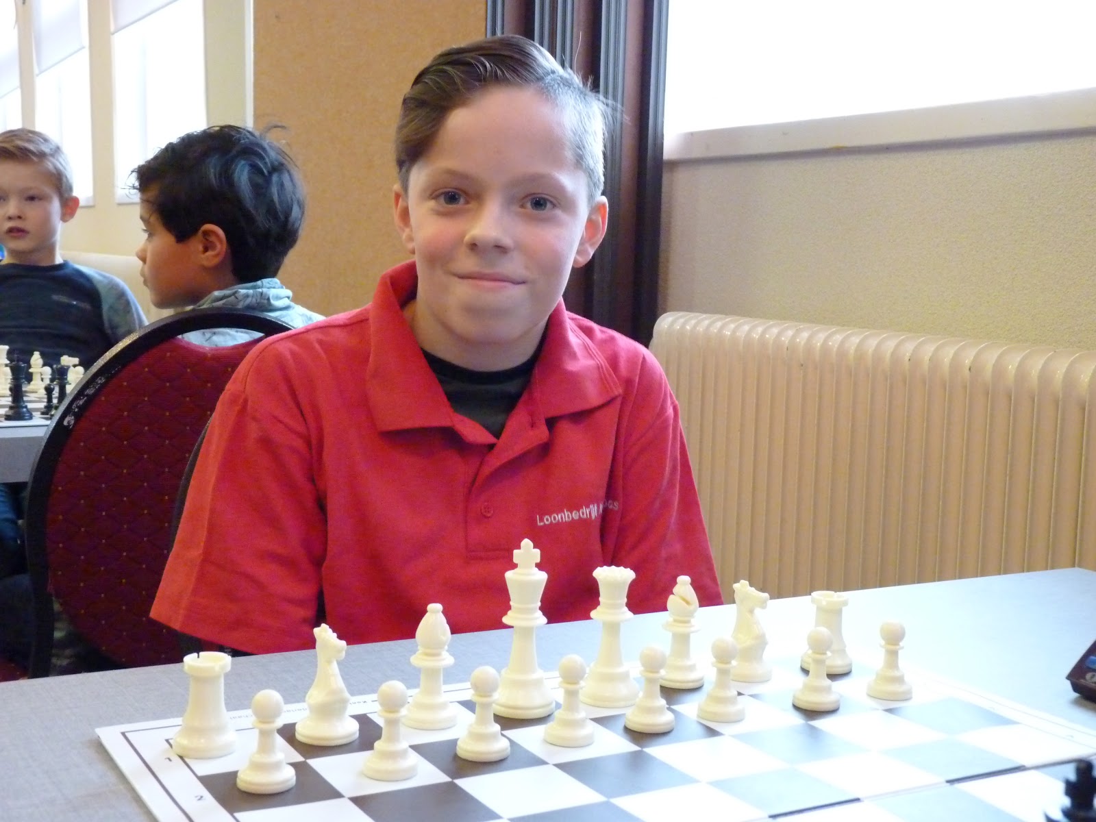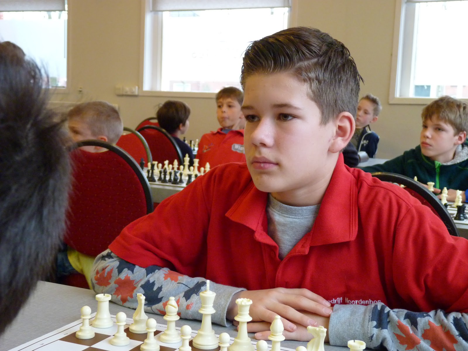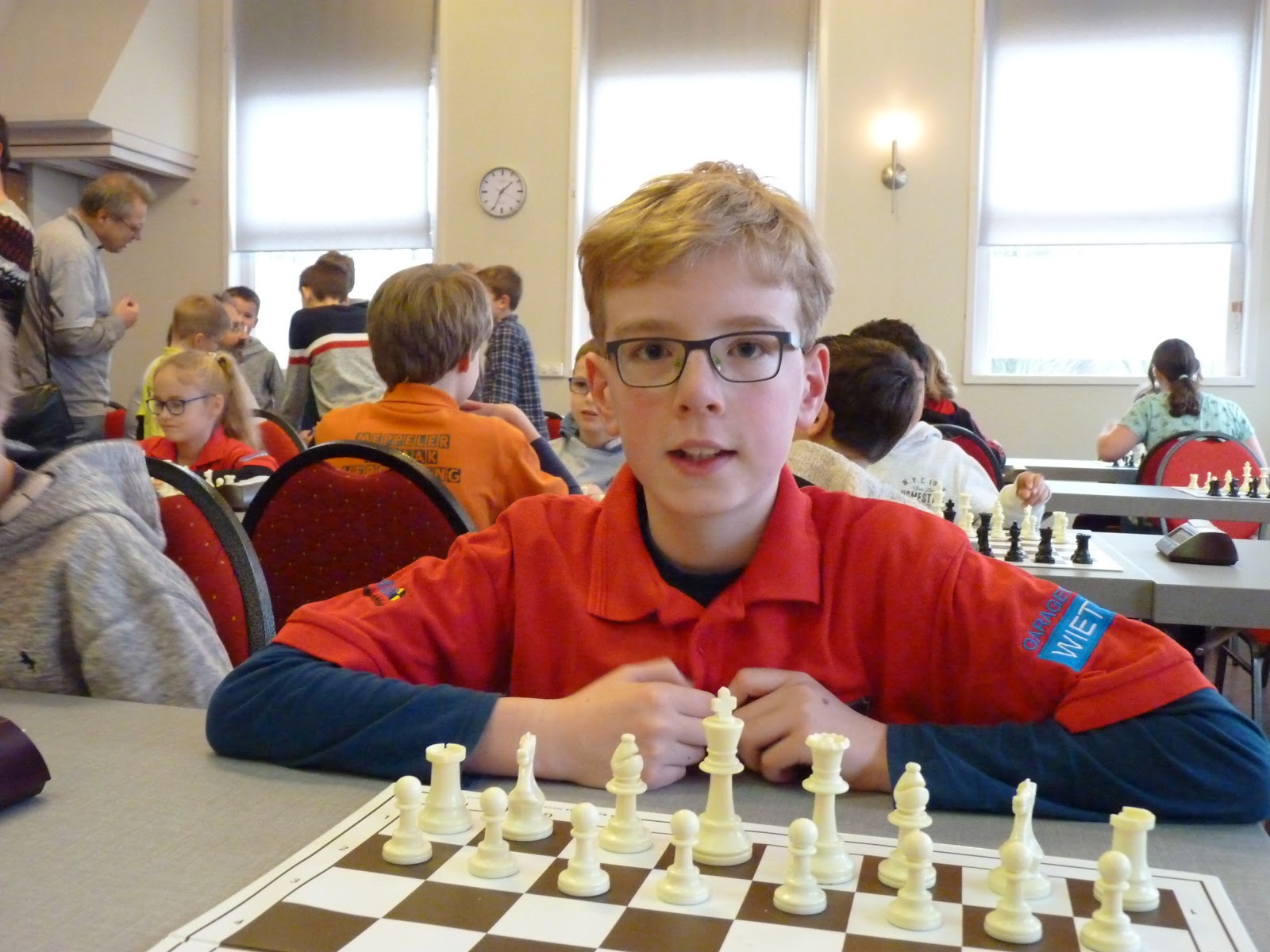 De A- en B-groep zaten in een aparte zaal wat heel goed is voor de rust. De C- en D-groep zaten in de grote zaal. Voor onze jongste deelnemer, Giovanni, bleek dit een lastige omstandigheid. Hij is gevoelig voor dingen die om hem heen gebeuren en het lukte hem in enkele partijen niet om zich daar voor af te sluiten. Zo miste hij in de eerste partij dat hij zijn tegenstander net schaak had gezet op het moment dat deze besloot om Giovanni schaak te zetten. Het was een briljante zet, want daardoor won hij de dame van Giovanni die net aan het winnen was. Giovanni heeft veel talent, heel veel talent. Hij ziet dingen die anderen nog lang niet zien. Zeker als de focus er is speelt hij als de beste. Vandaag lukte dat vanwege eerder genoemde reden en een lichte verkoudheid niet. In de laatste ronde was het op en verloor Giovanni, waardoor hij slechts vierde werd en geen derde. Hij heeft wel heel veel geleerd vandaag!