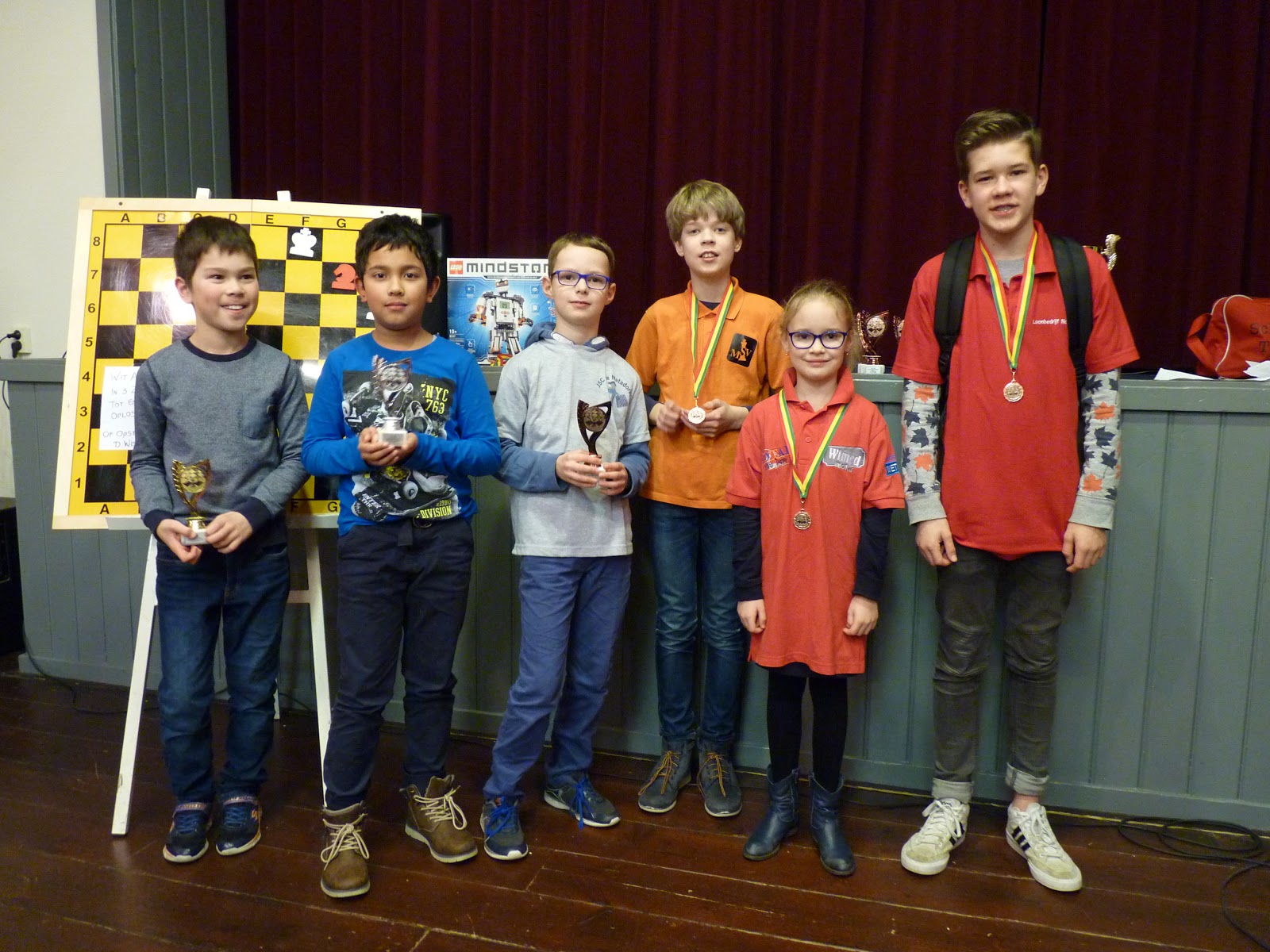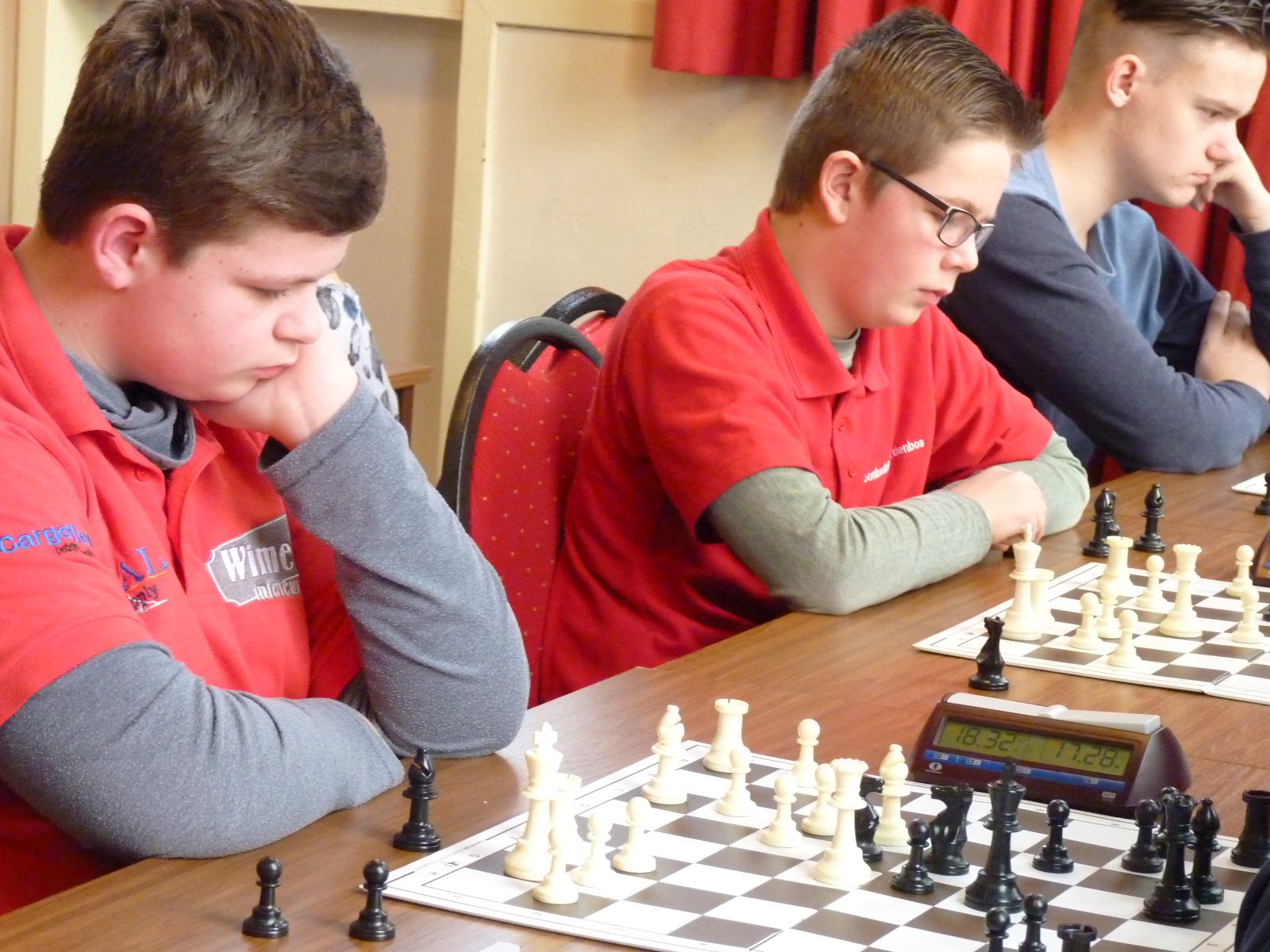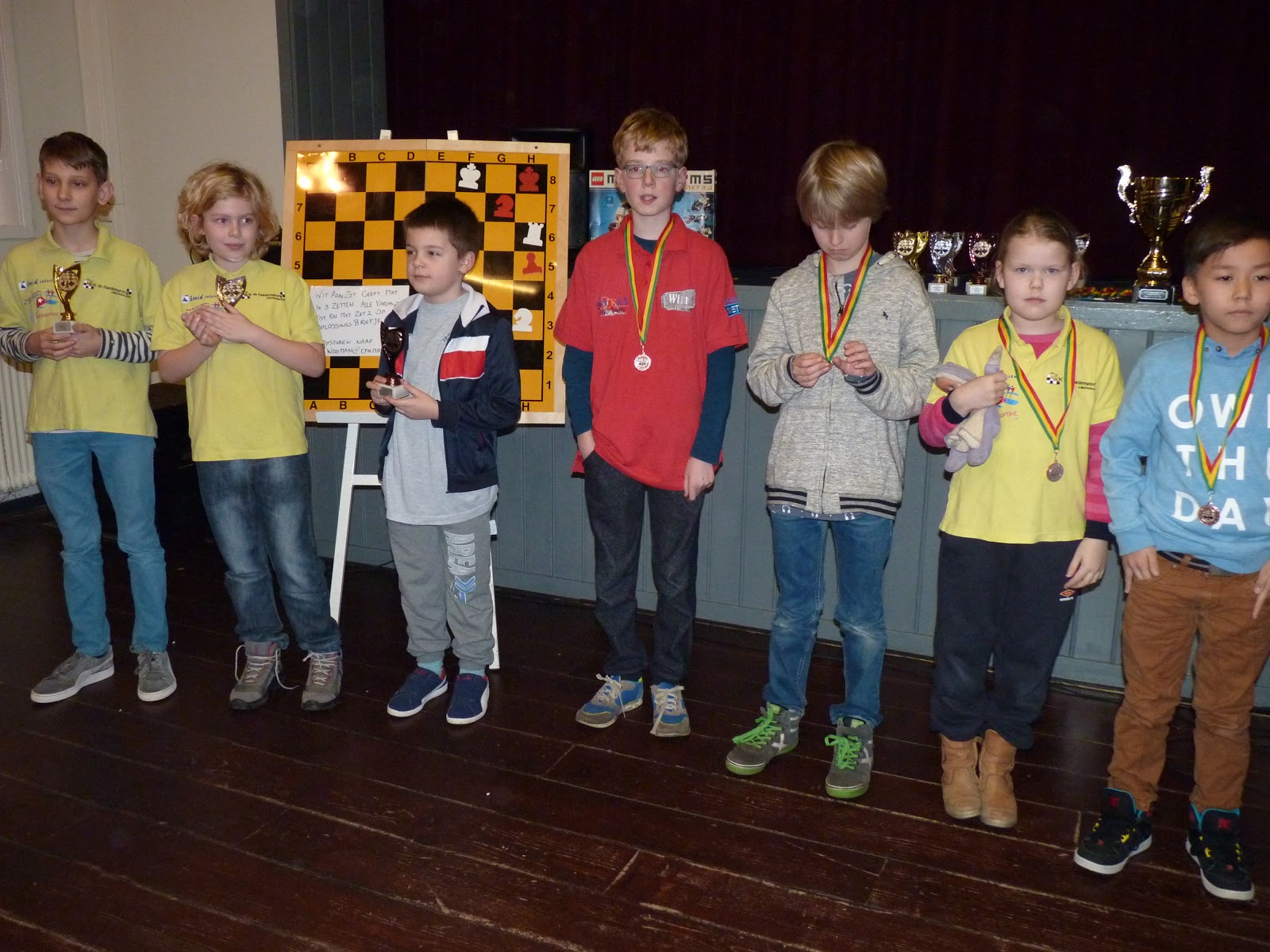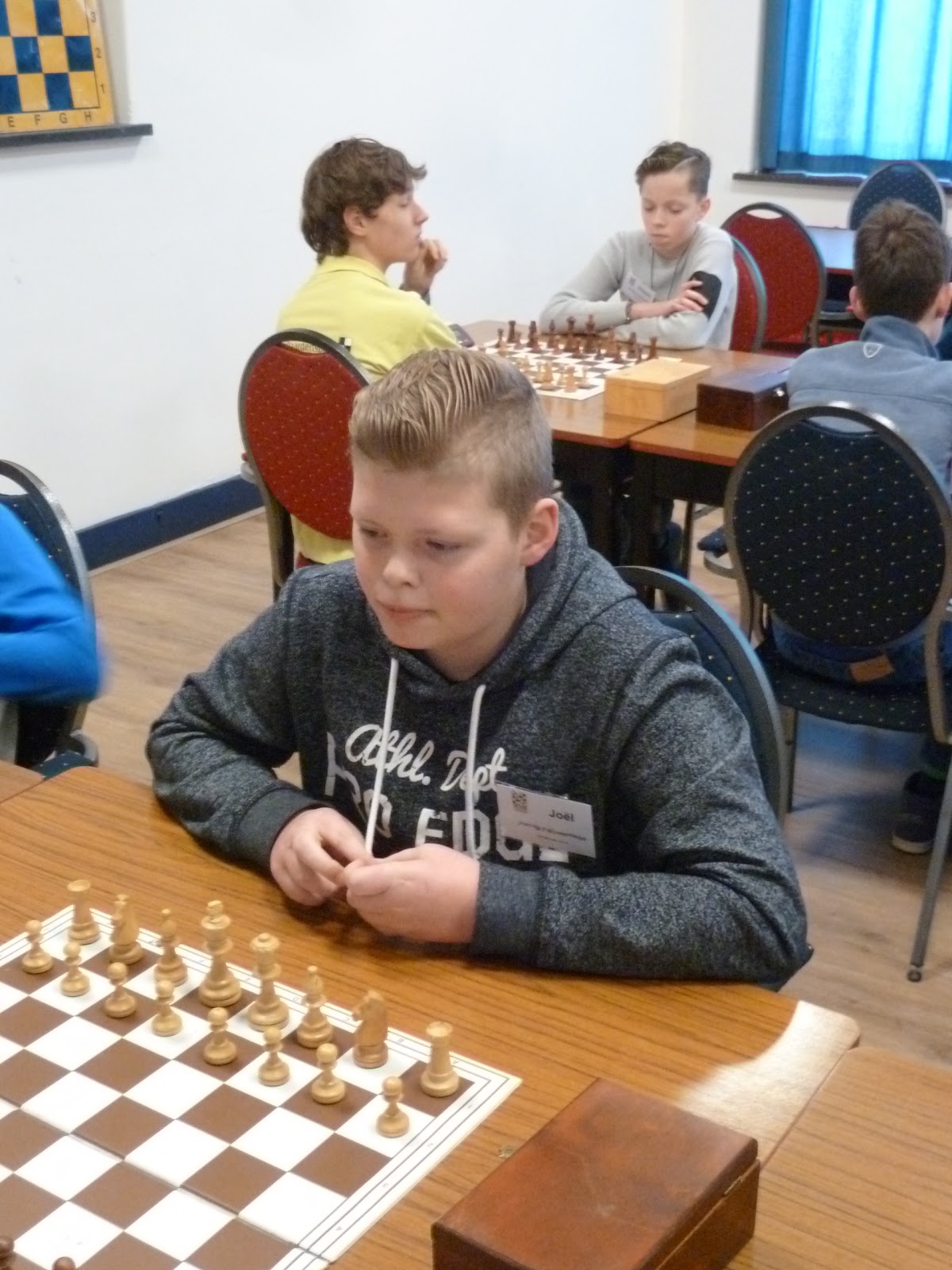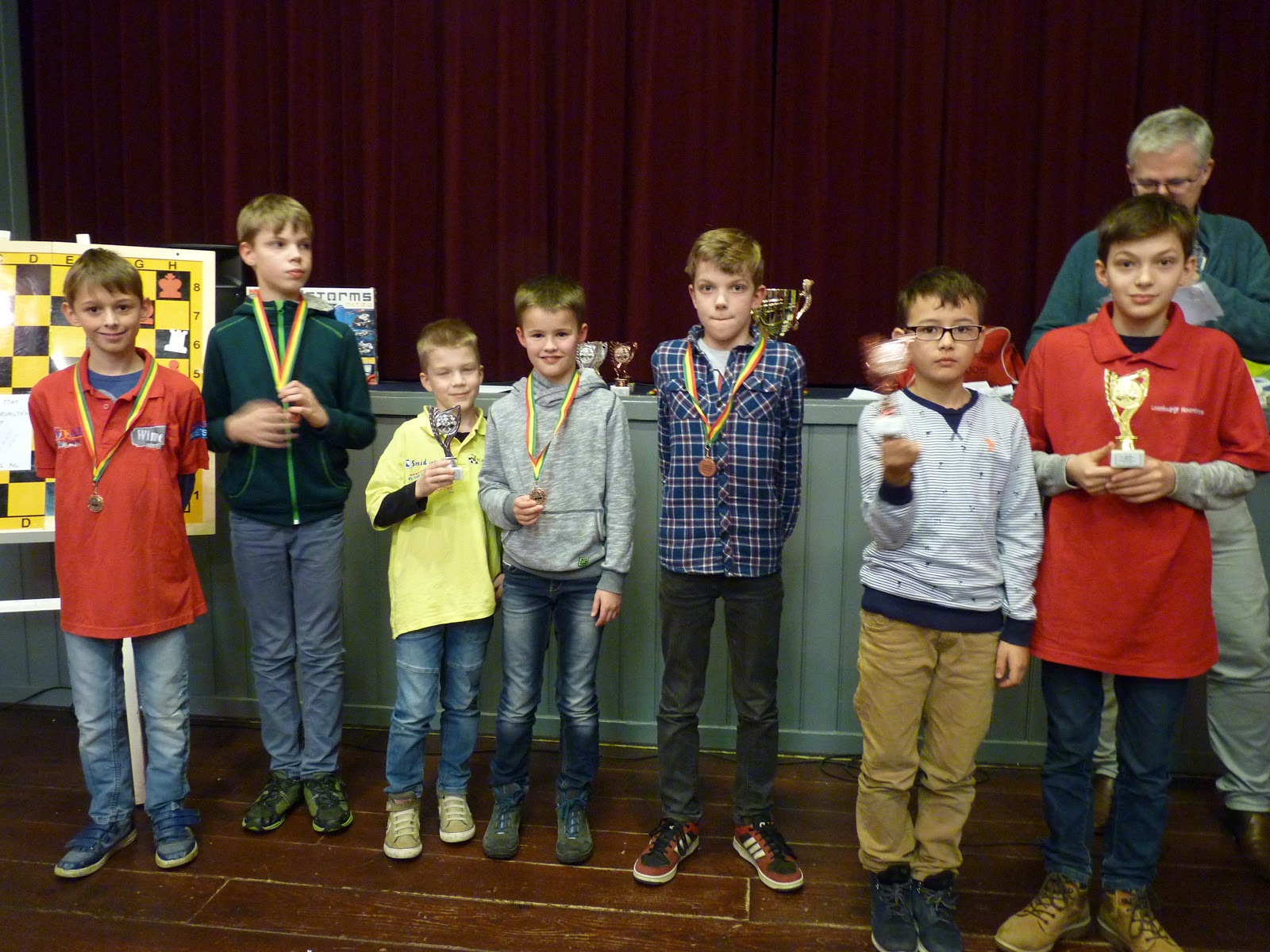 De A- en B-groep zaten in een aparte zaal wat heel goed is voor de rust. De C- en D-groep zaten in de grote zaal. Voor onze jongste deelnemer, Giovanni, bleek dit een lastige omstandigheid. Hij is gevoelig voor dingen die om hem heen gebeuren en het lukte hem in enkele partijen niet om zich daar voor af te sluiten. Zo miste hij in de eerste partij dat hij zijn tegenstander net schaak had gezet op het moment dat deze besloot om Giovanni schaak te zetten. Het was een briljante zet, want daardoor won hij de dame van Giovanni die net aan het winnen was. Giovanni heeft veel talent, heel veel talent. Hij ziet dingen die anderen nog lang niet zien. Zeker als de focus er is speelt hij als de beste. Vandaag lukte dat vanwege eerder genoemde reden en een lichte verkoudheid niet. In de laatste ronde was het op en verloor Giovanni, waardoor hij slechts vierde werd en geen derde. Hij heeft wel heel veel geleerd vandaag!