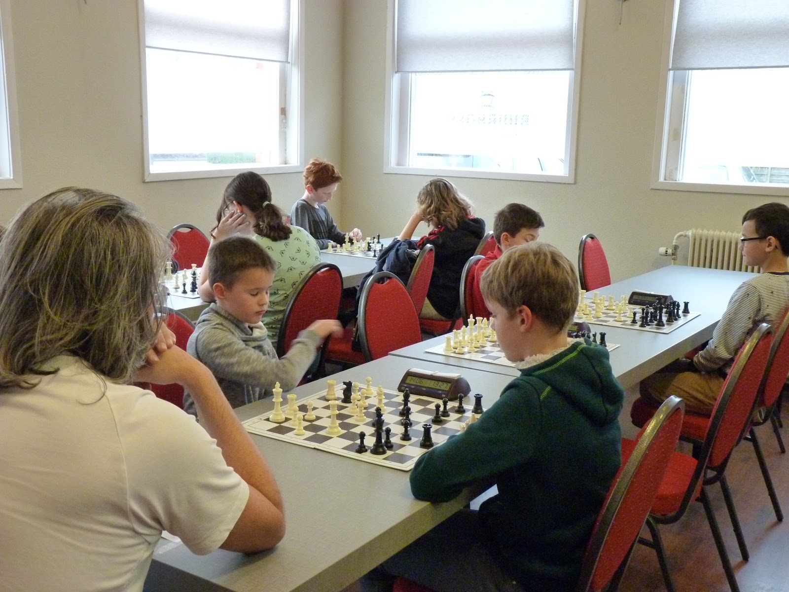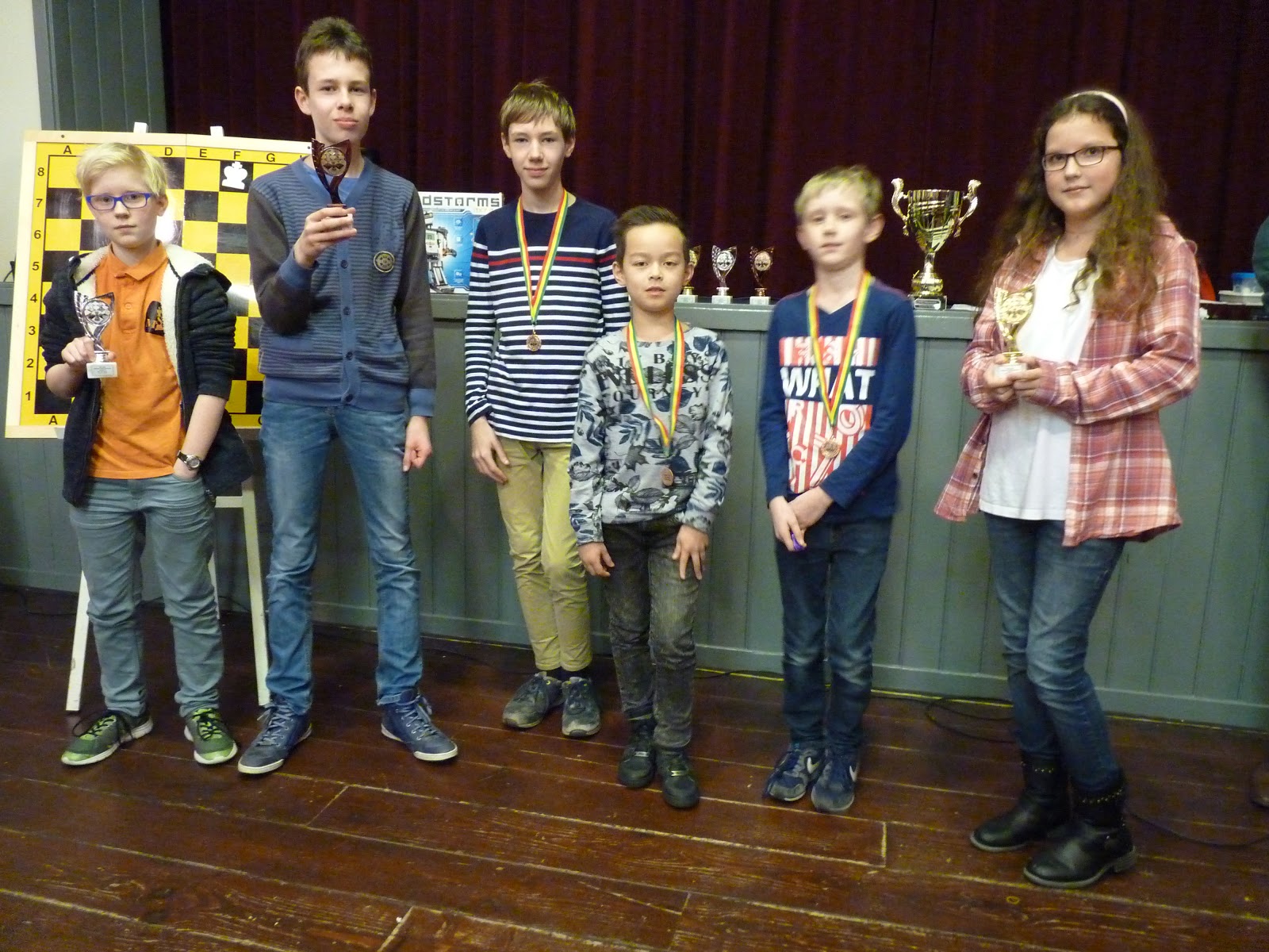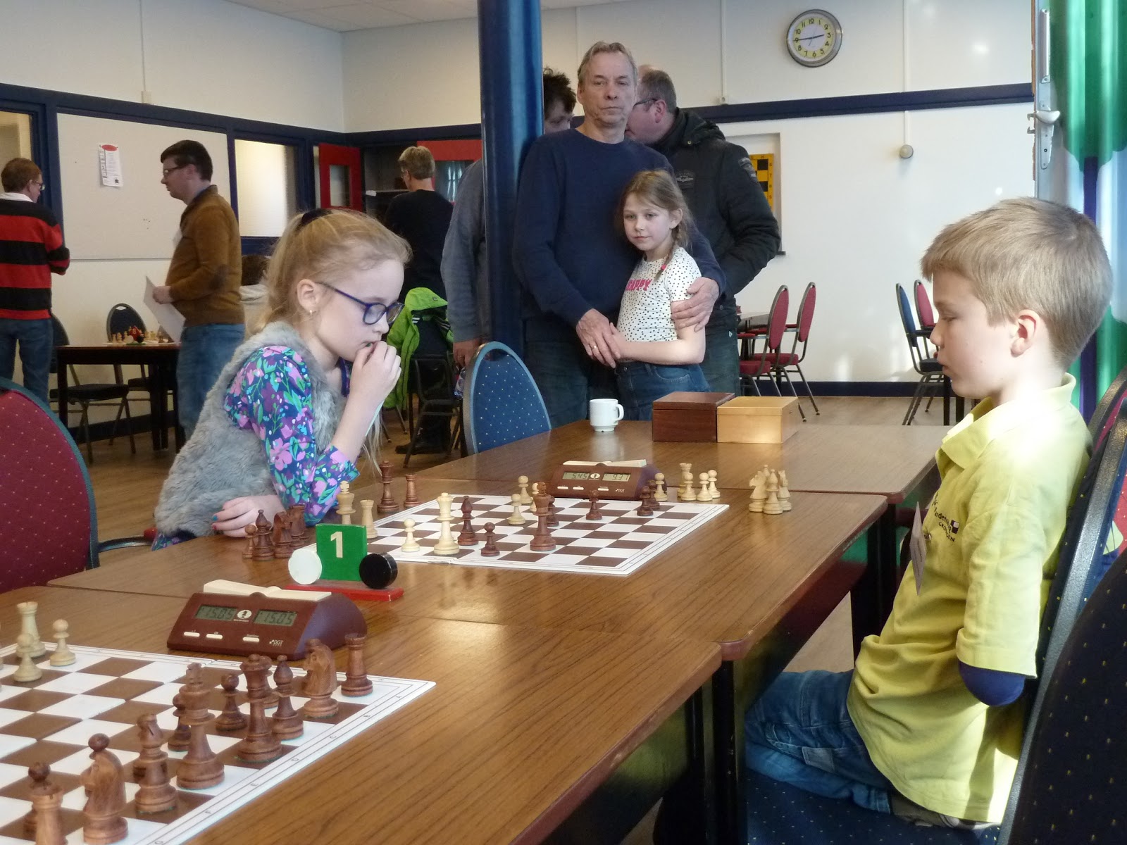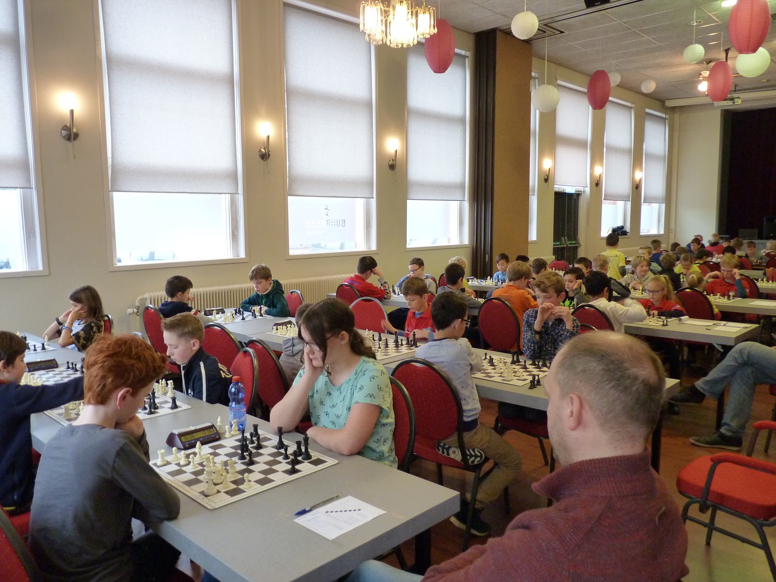 De A- en B-groep zaten in een aparte zaal wat heel goed is voor de rust. De C- en D-groep zaten in de grote zaal. Voor onze jongste deelnemer, Giovanni, bleek dit een lastige omstandigheid. Hij is gevoelig voor dingen die om hem heen gebeuren en het lukte hem in enkele partijen niet om zich daar voor af te sluiten. Zo miste hij in de eerste partij dat hij zijn tegenstander net schaak had gezet op het moment dat deze besloot om Giovanni schaak te zetten. Het was een briljante zet, want daardoor won hij de dame van Giovanni die net aan het winnen was. Giovanni heeft veel talent, heel veel talent. Hij ziet dingen die anderen nog lang niet zien. Zeker als de focus er is speelt hij als de beste. Vandaag lukte dat vanwege eerder genoemde reden en een lichte verkoudheid niet. In de laatste ronde was het op en verloor Giovanni, waardoor hij slechts vierde werd en geen derde. Hij heeft wel heel veel geleerd vandaag!