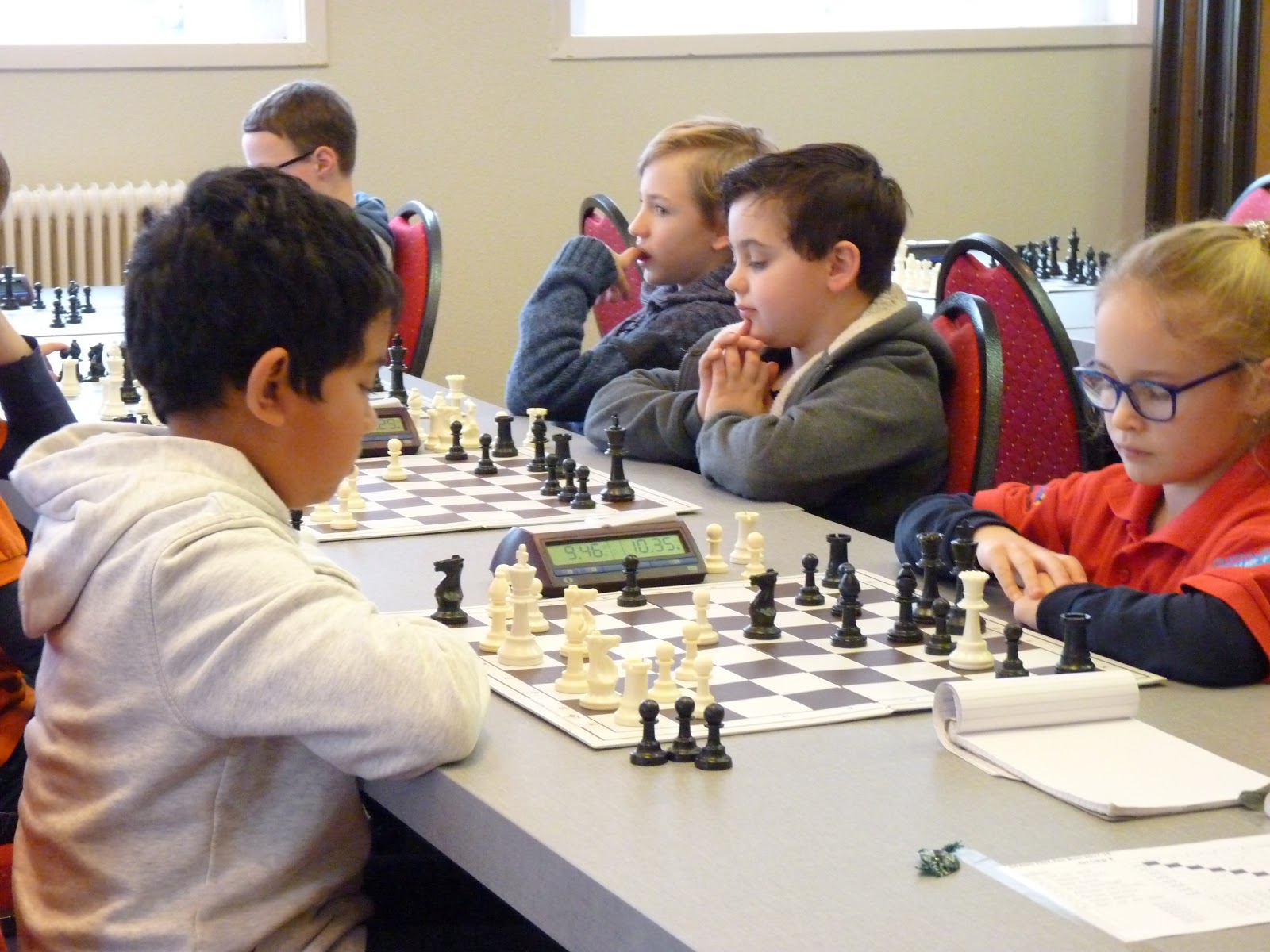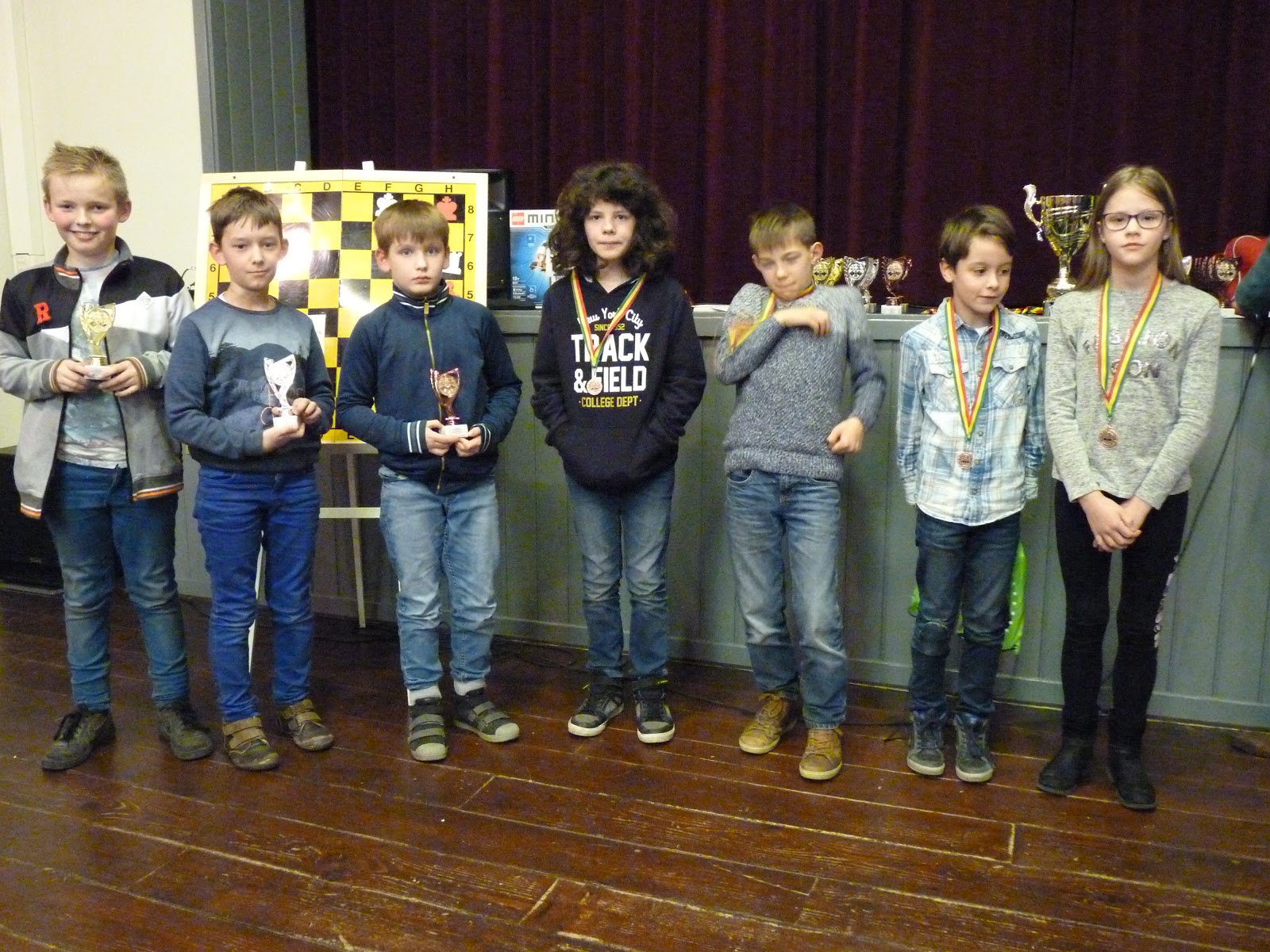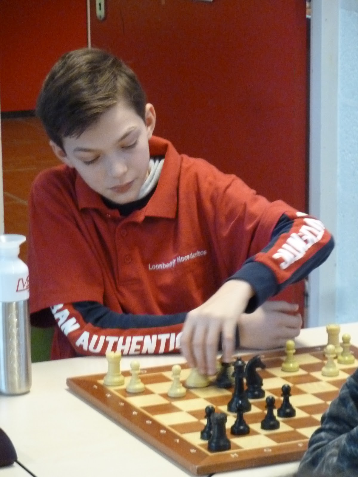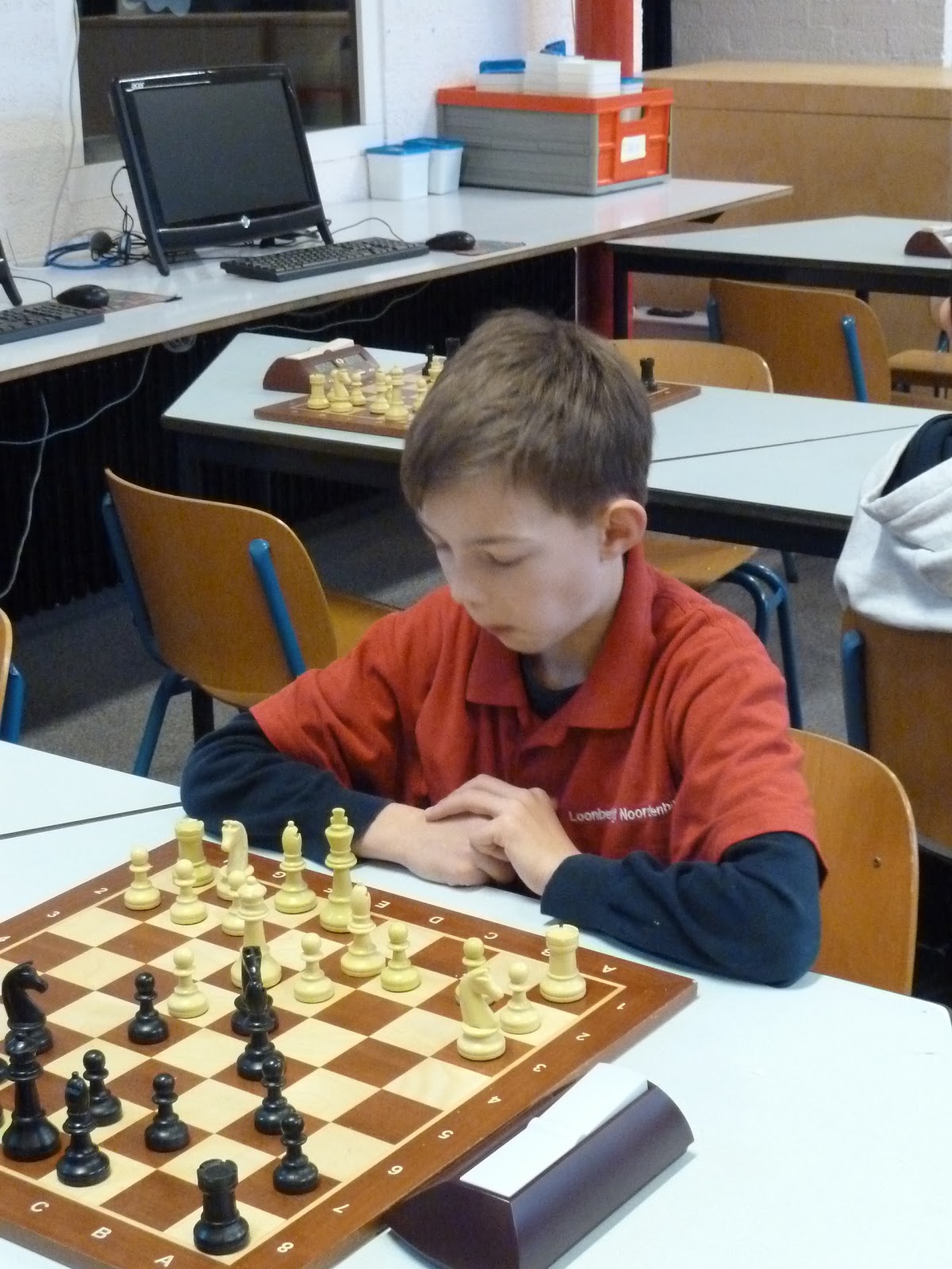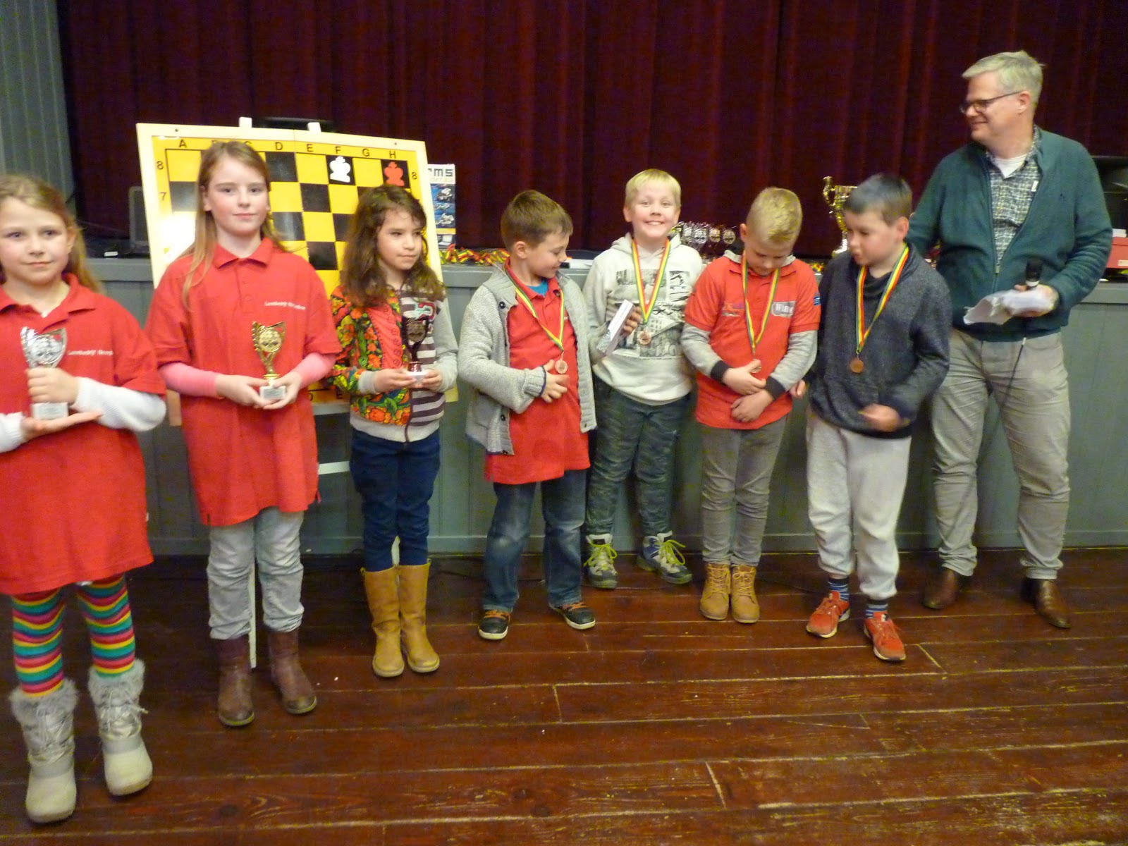 De A- en B-groep zaten in een aparte zaal wat heel goed is voor de rust. De C- en D-groep zaten in de grote zaal. Voor onze jongste deelnemer, Giovanni, bleek dit een lastige omstandigheid. Hij is gevoelig voor dingen die om hem heen gebeuren en het lukte hem in enkele partijen niet om zich daar voor af te sluiten. Zo miste hij in de eerste partij dat hij zijn tegenstander net schaak had gezet op het moment dat deze besloot om Giovanni schaak te zetten. Het was een briljante zet, want daardoor won hij de dame van Giovanni die net aan het winnen was. Giovanni heeft veel talent, heel veel talent. Hij ziet dingen die anderen nog lang niet zien. Zeker als de focus er is speelt hij als de beste. Vandaag lukte dat vanwege eerder genoemde reden en een lichte verkoudheid niet. In de laatste ronde was het op en verloor Giovanni, waardoor hij slechts vierde werd en geen derde. Hij heeft wel heel veel geleerd vandaag!