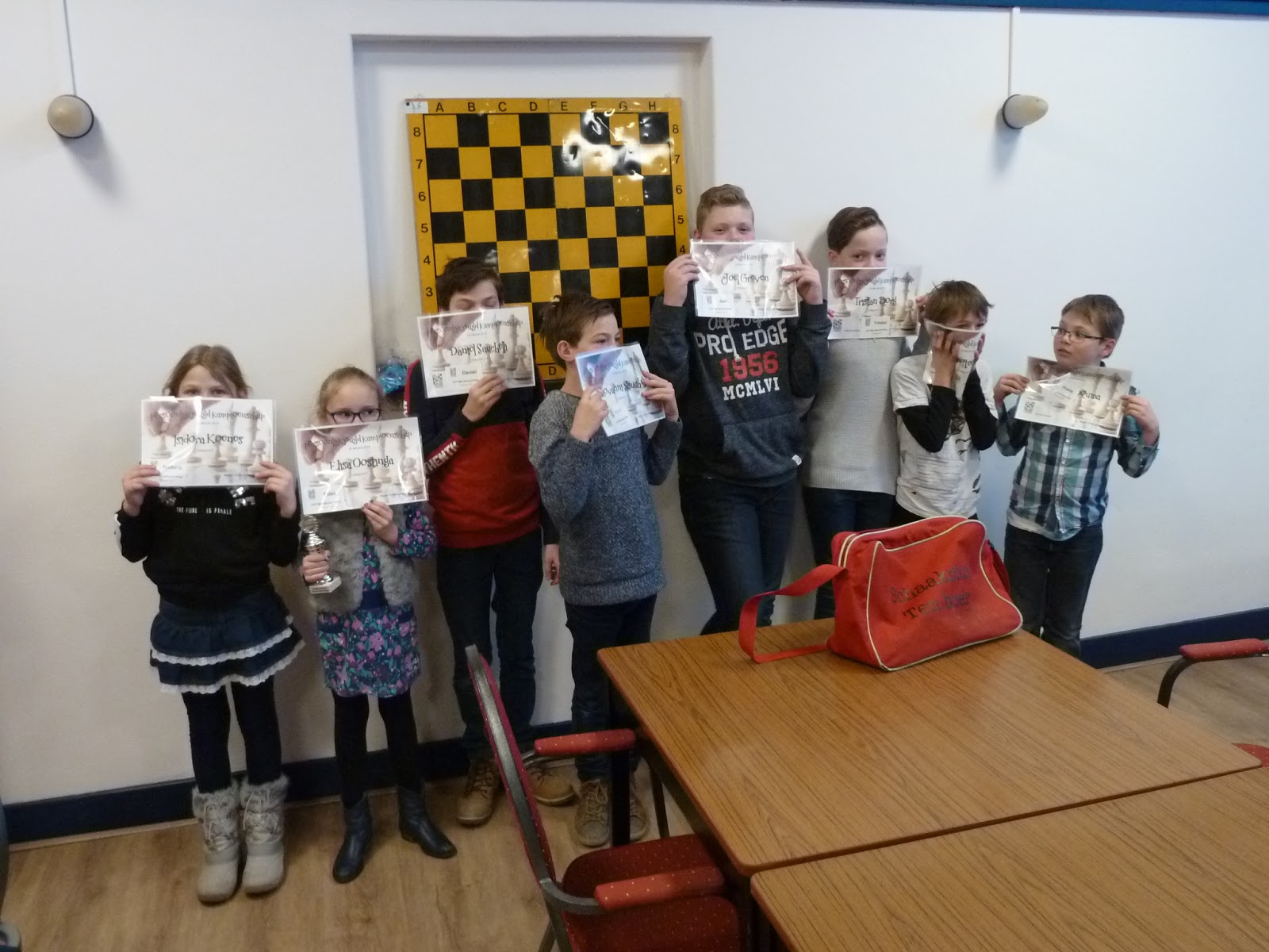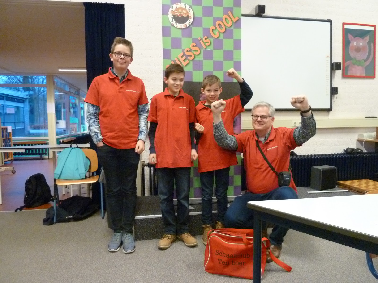 Giovanni is een enorm talent. Aanstormend. Gisteren speelde hij heel goed. Hoogtepunt was de overwinning in de laatste ronde. Knap hoe je snel beter wordt, Giovanni! Tristan is het geheime wapen van CBS de Fontein. Hij is iemand die heel taai is en nooit opgeeft. Ook niet in verloren stellingen. Gisteren lukte het hem om zo 2 keer te winnen en in totaal 3 punten te scoren. Let op deze jongen op 7 maart bij het schoolschaakkampioenschap. Daniël en Joël zijn de besten van het vijftal.