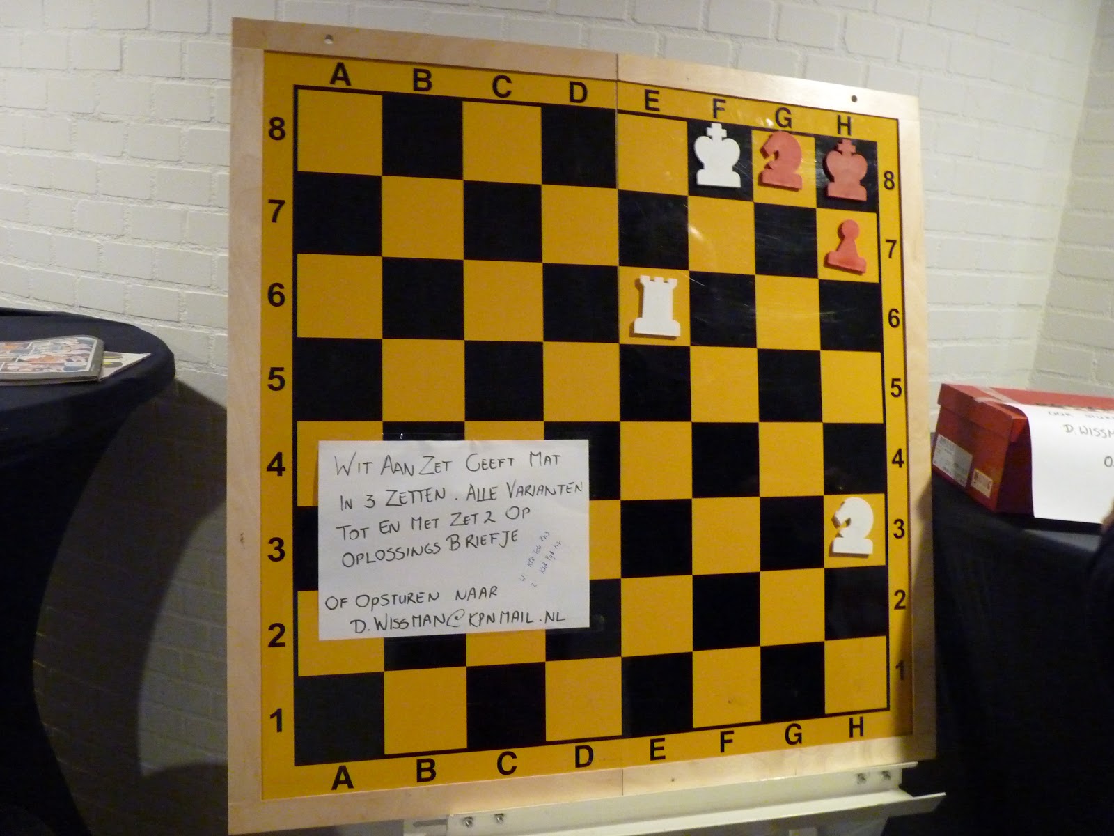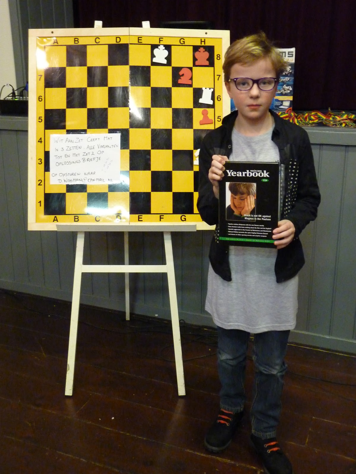Tijdens de Grand Prix was er ook een probleem. Wit zet mat in 3 zetten. Geef alle varianten tot en met de 2de zet van wit. Veel jeugd vond uiteindelijk de oplossing, maar vergat de drie varianten op te schrijven. Hierdoor moesten er heel veel briefjes getrokken worden voordat de twee winnaars bekend waren: Pieter van Nes en Abe Smeding. Zij wonnen een schaakboek.