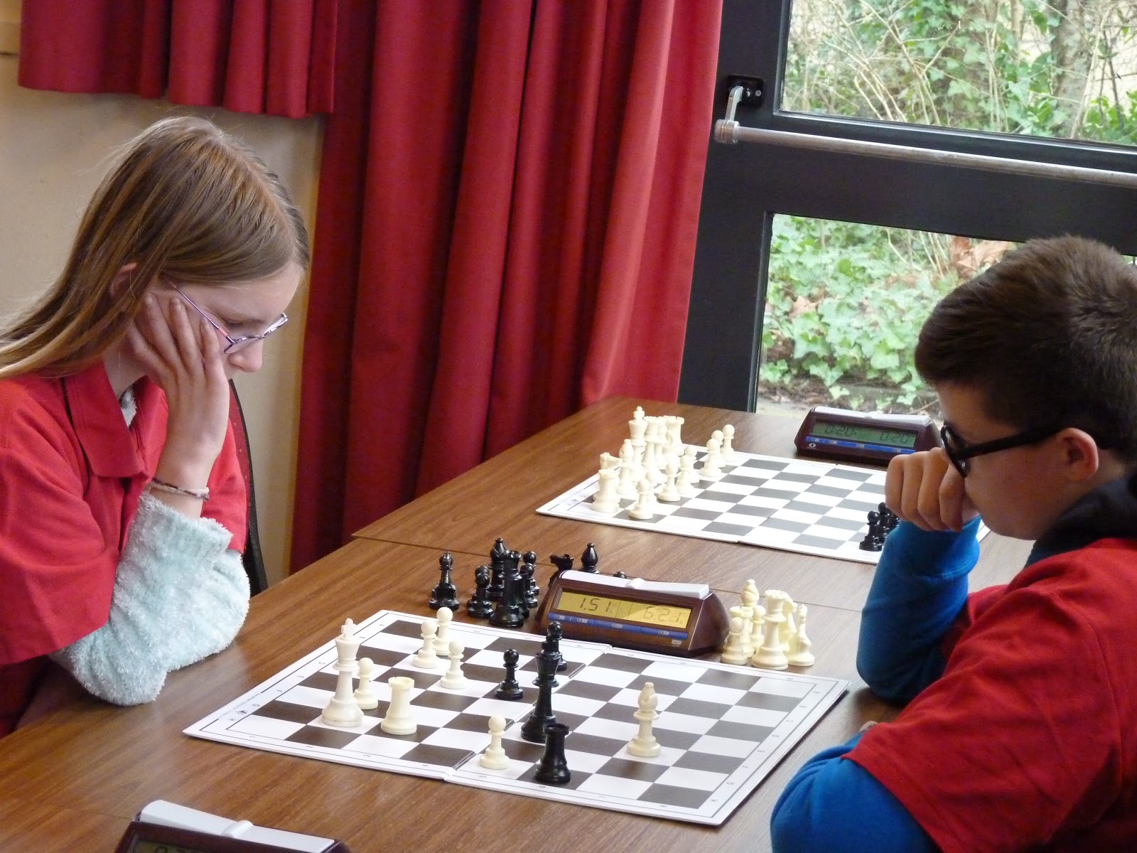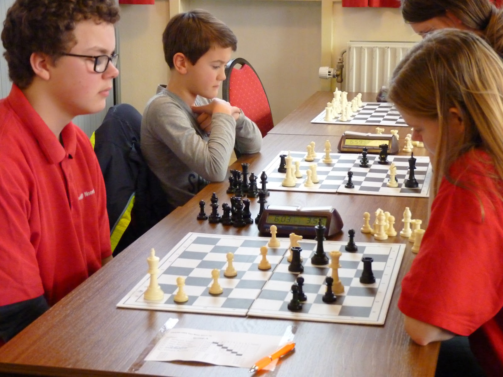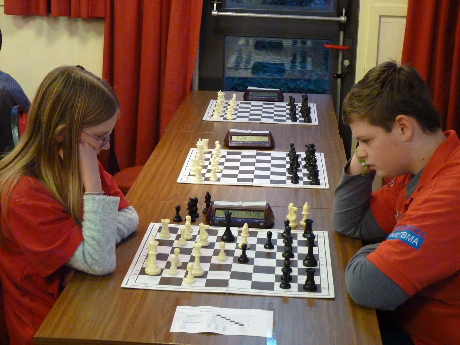 In de vierde ronde in Hoogezand moeten onze teams tegen elkaar. Het eerste team wint bijzonder geflatteerd van het tweede team. Yrsa overspeelt Gerbrich en verdient de overwinning. Wyona staat ook kansrijk tegen Remco en Joël heeft het beste van het spel tegen Robin. Alleen Daan is veel sterker dan Rowin. Uiteindelijk worden echter alle partijen verloren. Zeker Yrsa verdiende meer.