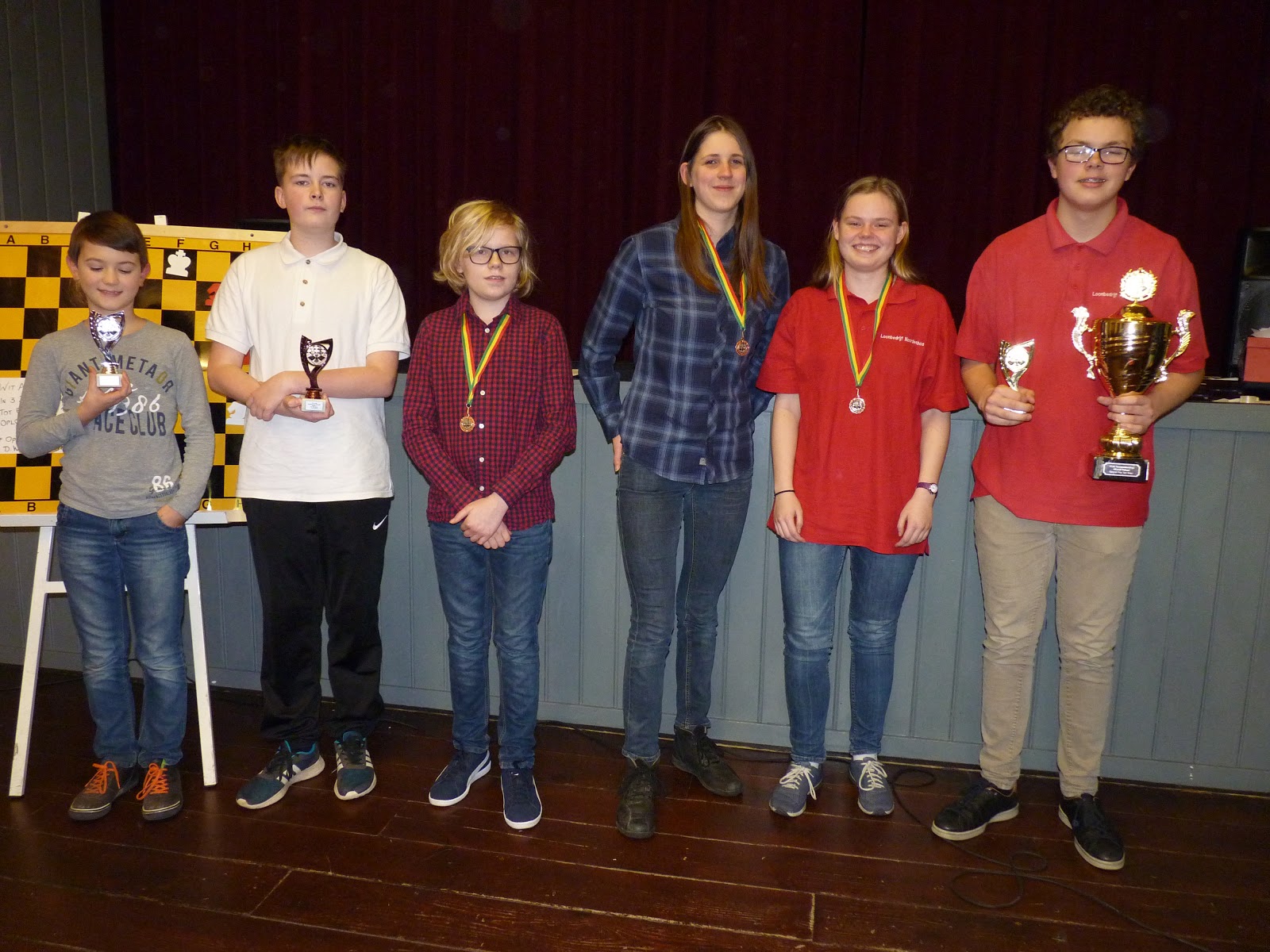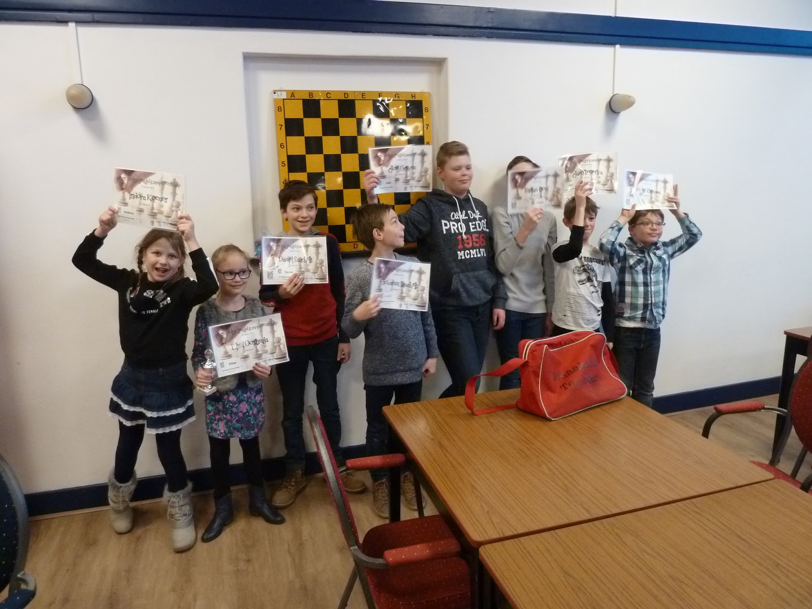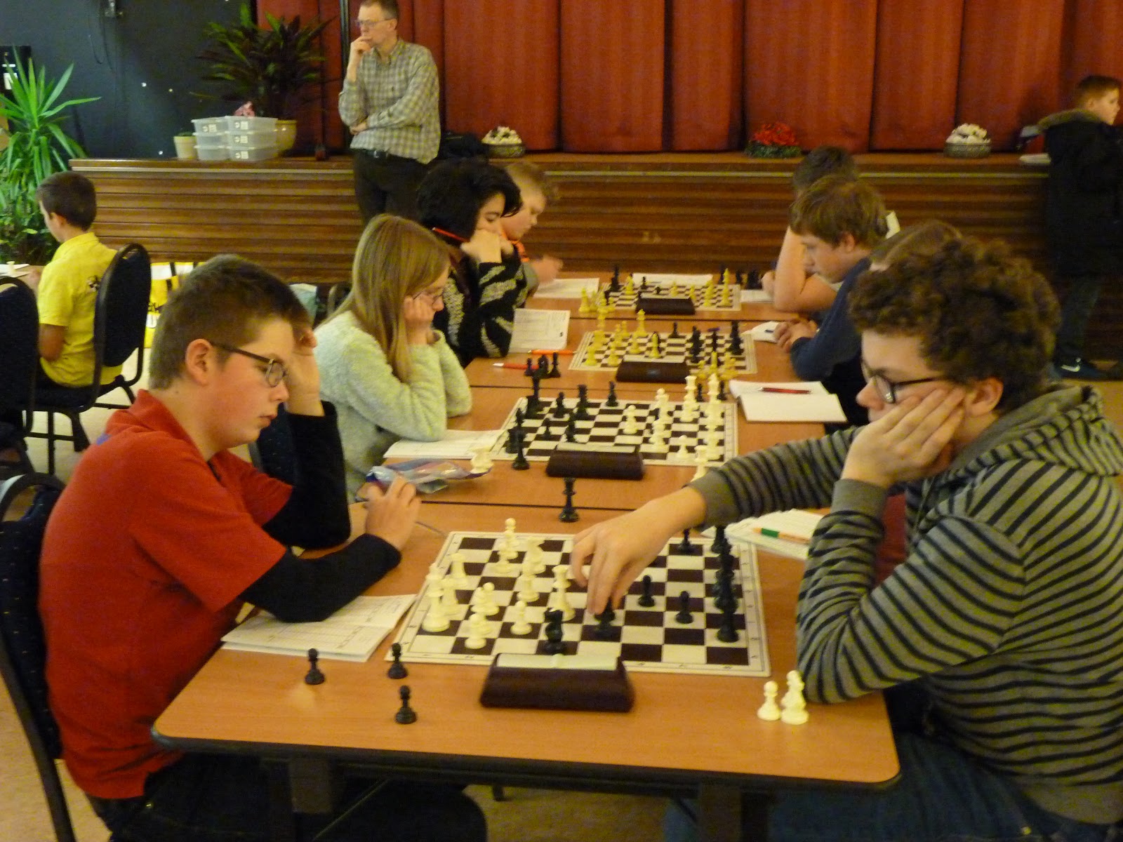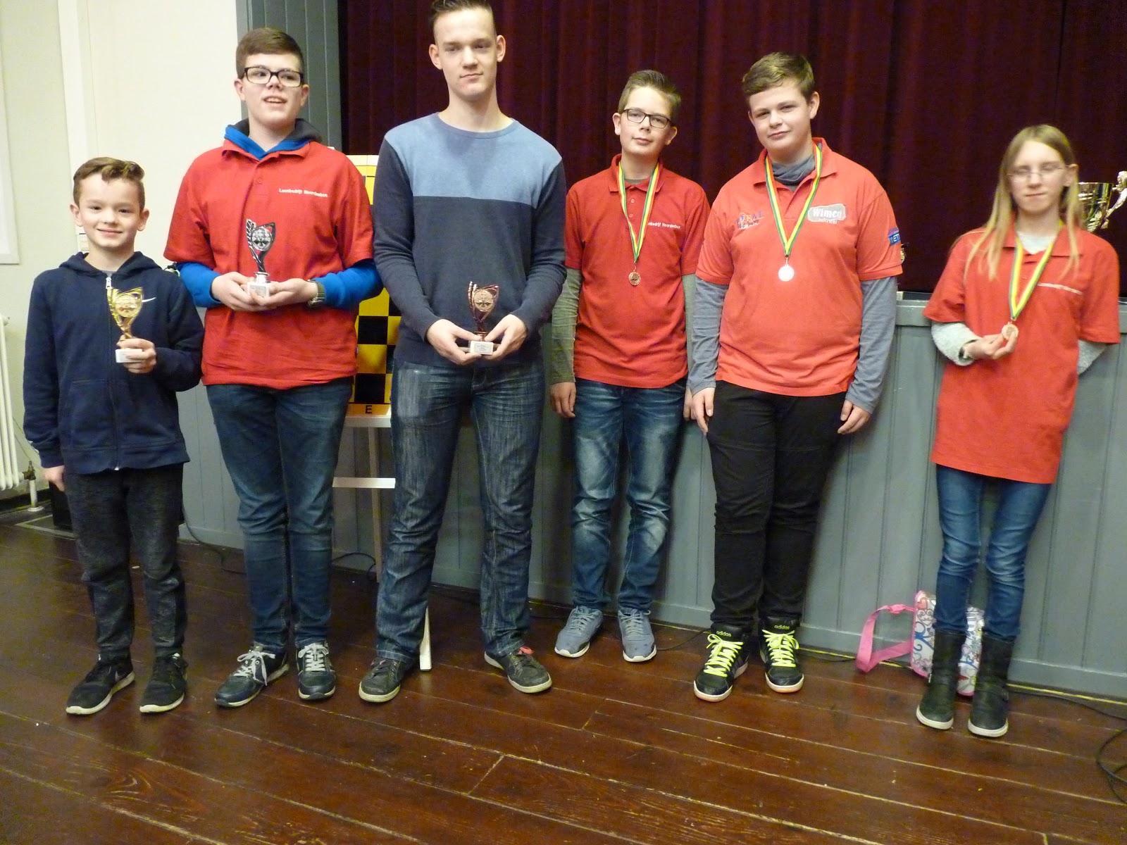 Gisteren waren de Persoonlijke jeugdkampioenschappen van de Noordelijke Schaakbond. Voor het eerst allemaal op één dag in plaats van verdeeld over drie dagen. Vanuit Ten Boer waren we met een grote delegatie. 8 van de 43 deelnemers kwamen bij onze club vandaan, terwijl Wyona en Daan ook sterke banden hebben met onze club. Het werd een leuke en goed georganiseerde dag door Marjet en Roland. Veel dank daarvoor, jullie doen veel voor het jeugdschaak in de Nosbo.