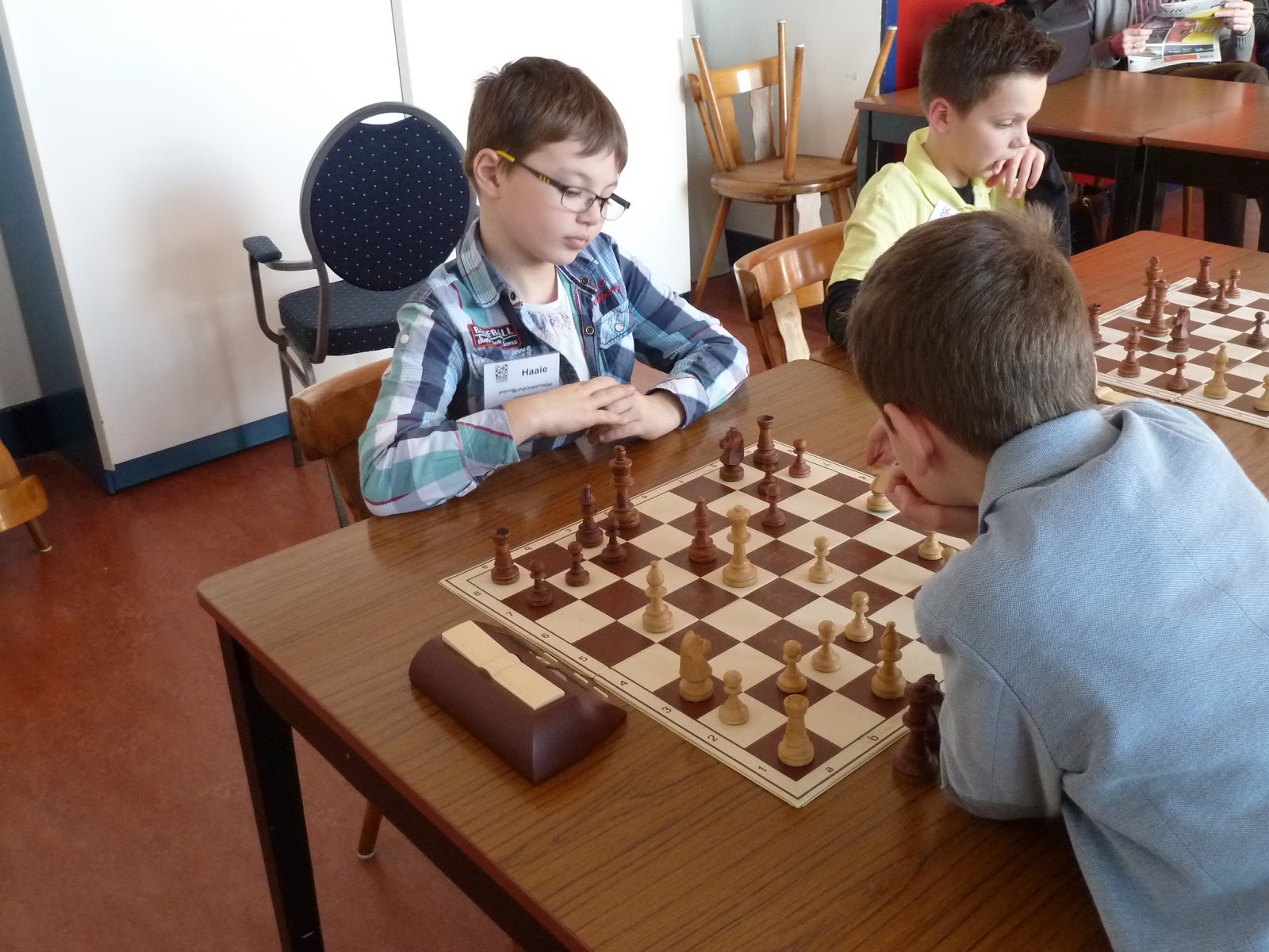 In groep H dus de twee Bronswijks van de Paardensprong. Wat een enthousiasme, ook bij hun moeder. Leuk om zulke talenten van de Paardensprong te zien. Vijf jaar nog maar, wat een toekomst. Ook Sebastian was zo’n jonge deelnemer die ik in de toekomst nog vaak hoop te zien op toernooien. Ook enthousiast, alleen de loper gaat wel eens het hoekje om: Zo moest Thea regelmatig de zet La2 via b1 naar d3 corrigeren.