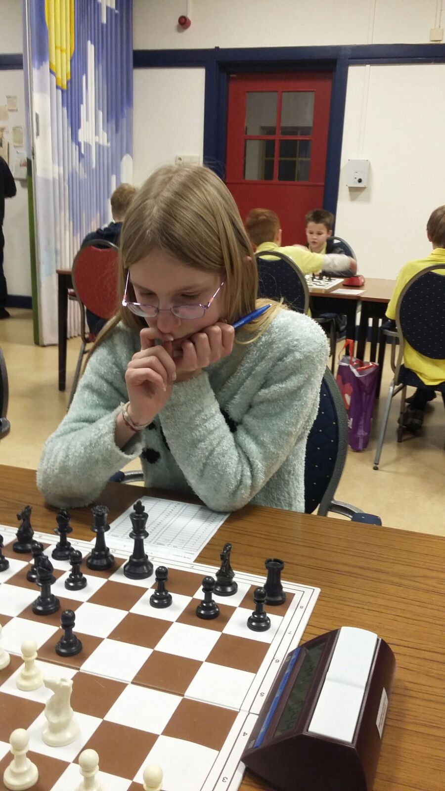 Ook de winnaar van vorig jaar, Lemée Reuver van onze eigen club deed mee. Ze is momenteel meer bezig met lesgeven dan met zelf schaken, dus voor haar was meedoen belangrijker dan winnen. Ze had het zwaar en wist geen punt te scoren.