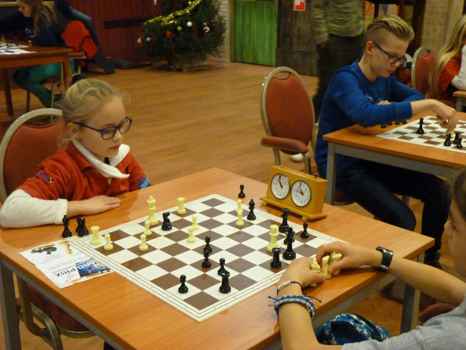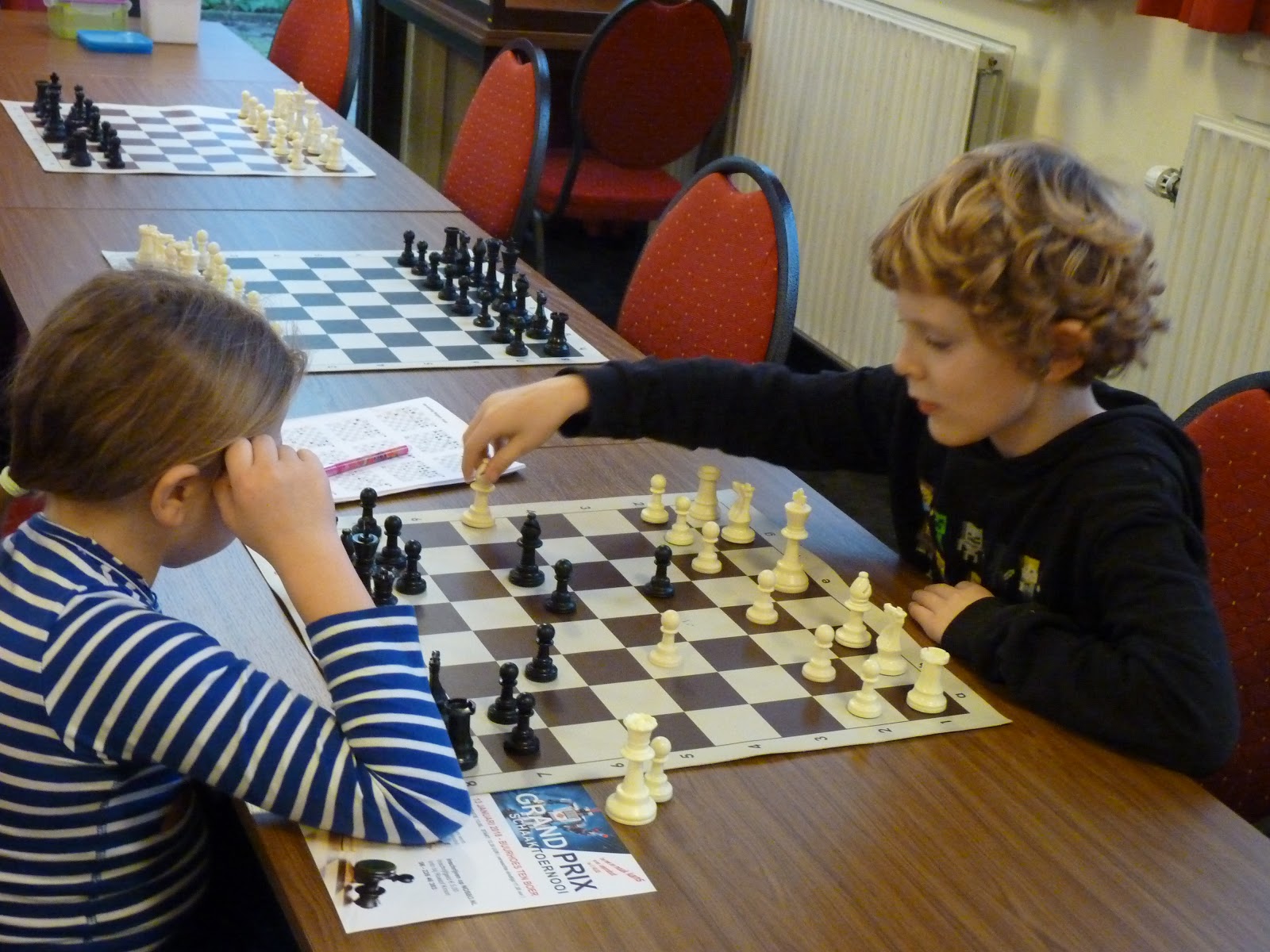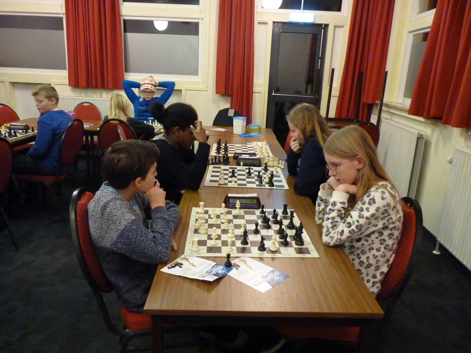 Op de laatste zaterdag voor Kerst wordt traditiegetrouw de Grand Prix van schaakclub Emanuel Lasker gehouden. Plaats van handeling is altijd Ons Huis in Sint Annaparochie. Omdat Gerbrich vorig jaar hier het toernooi won, was er een stevige afvaardiging van onze jeugdclub. Maar liefst 7 jeugdschakers van SC Ten Boer vond hun weg naar Sint Anne. Naast het vaste groepje met Joël, Rowin en Gerbrich dit keer ook Isidora, Lindert, Elisa en Mariëtte. Een neef en een nicht van Mariëtte deden ook mee. Ik moet zeggen dat organisator Thijs druk aan het opleiden is geslagen want er waren maar liefst zes jeugdspelers uit de eigen kweek. Een goed initiatief!