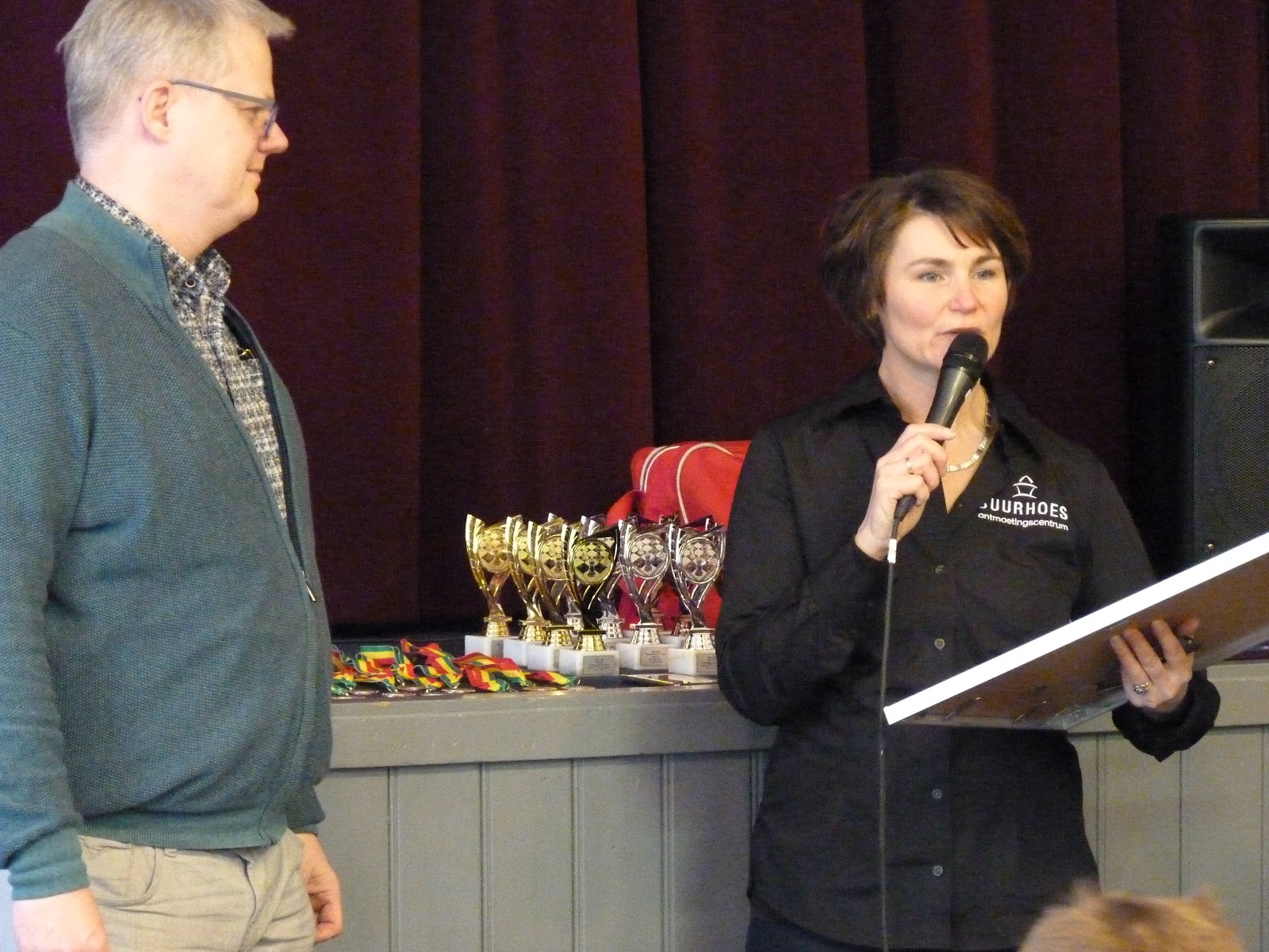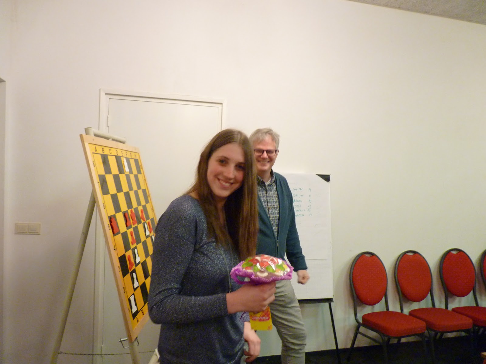 Om de jaren dat we met veel plezier hier onze clubmiddagen hadden te herinneren hebben we aan Pieternel van de EGTB een aandenken gegeven: een magnetisch schaakbord waar we om 7 uur ’s avonds al de eerste partij op gespeeld zagen worden. Heel veel dank voor de prachtige jaren in het Buurhoes!