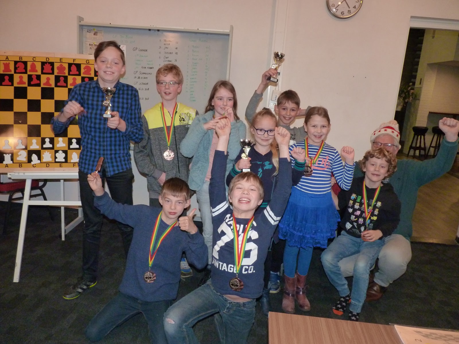 En natuurlijk hadden we geweldige groepsleiders. Luuk Hartman die als oud lid hielp (veel dank), onze enige echte voorzitter van de Noordelijke Schaakbond, Marc, Thea en Stephan als ervaren schaakouders en beginnende schaakvaders zoals Dino en Ronald. Daar lopen dan ook nog ervaren krachten als Simon Hofstra en Jan Pilon rond en ook degene waar we het allemaal van hebben afgekeken: Hiddo Zuiderweg. Zij maakten dat het toernooi vlekkeloos verliep, zelfs de incidenten die er waren werden soepel opgelost.