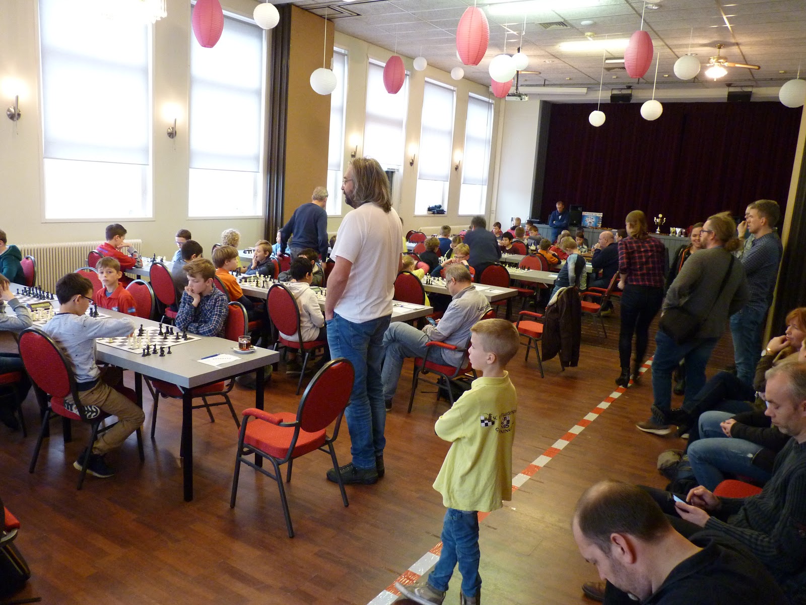 Toch zijn er ook dingen waar je gewoon niet meer over na denkt omdat je het altijd zo doet. En dan is het fijn dat mensen je op mogelijke verbeteringen wijst. Thijs Tuinstra, onze gewaardeerde organisator van de GP Emanuel Lasker was er voor het eerst en keek met verbazing naar het bekende roodwitte lint op de vloer.