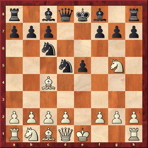 In deze bekende stelling speelde Robin 6. Pxf7. In de theorie staat 6. d4 als beter bekend, maar ook na de tekstzet is het niet leuk voor zwart. Goed gezien in elk geval van Robin. Er volgde 6… Kxf7 7. Df3+ Ke8?! (Ke6 om d5 te dekken is ingewikkeld maar zeker beter) 8. Lxd5 en Robin had een pion gewonnen en de koning van zwart mag niet meer rokeren. Een paar zetten later ging dit mis. In deze stelling
