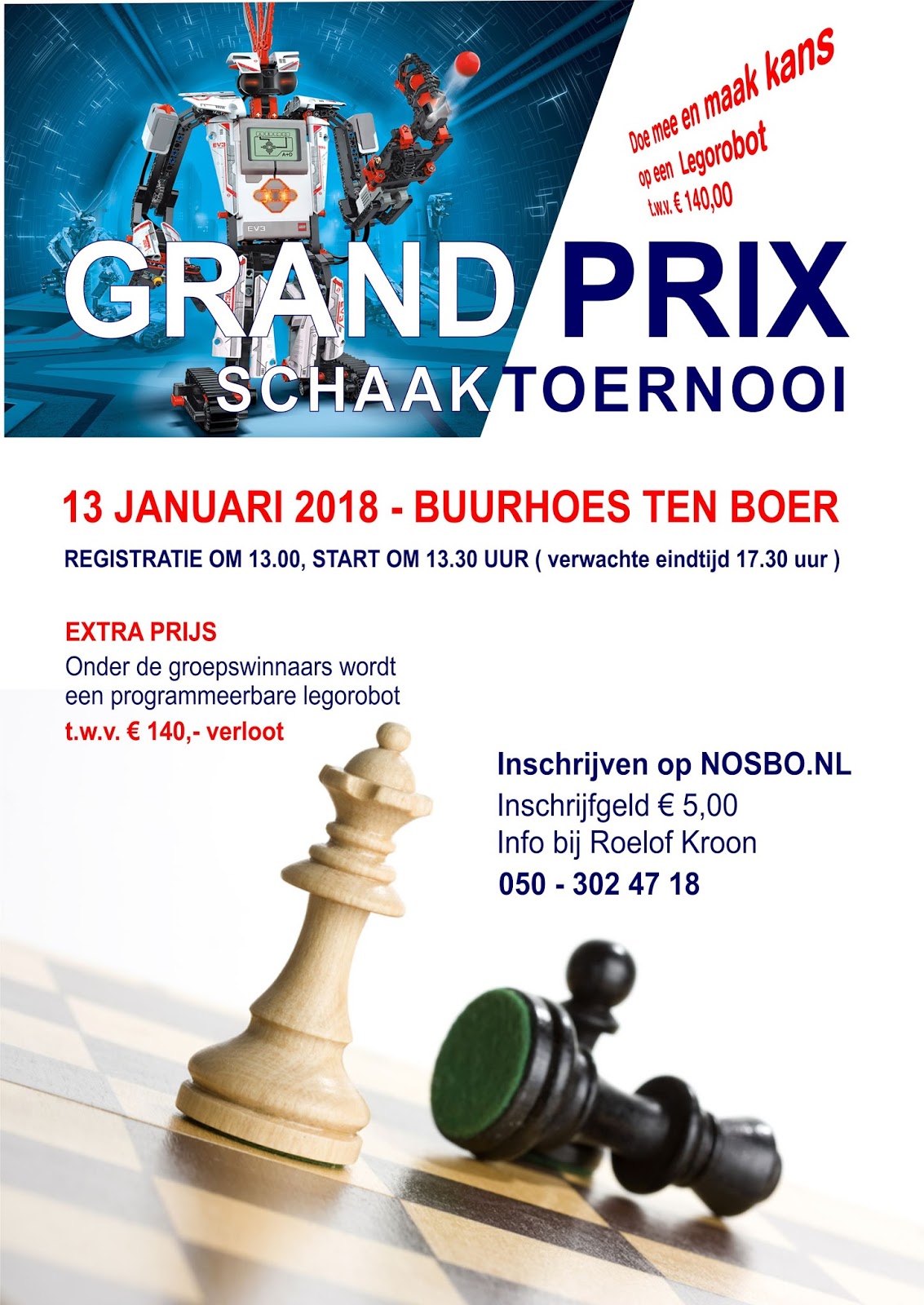 Er kwamen maar liefst 81 aanmeldingen binnen voor de Grand Prix. Uiteindelijk meldden twee deelnemers zich af en kwamen er twee niet opdagen. Met 77 deelnemers hadden we echter veel meer deelnemers dan we van te voren verwachtten. We kregen wat vragen van collega’s hoe het nou kan dat er zoveel deelnemers waren. Ik zou het eigenlijk niet weten. Wel hebben we dit jaar aanzienlijk meer promotie gemaakt. Afgekeken van de Paardensprong waar men ook altijd met leuke folders komt om meer dan 100 kinderen te trekken voor hun toernooi. Verder hadden we natuurlijk de lego robot, die door Erwin Kok beschikbaar was gesteld. En natuurlijk weten jeugdschakers het Buurhoes te vinden vanwege eerdere toernooien. We doen het met plezier en hebben een leuk team dat het organiseert. Thea en Jan doen al jaren mee. Helaas kon Jantine dit jaar niet, maar gelukkig wilden Paula en Helma meehelpen. Ook Tetske en Dirkjan waren er weer bij. Dirkjan maakte dit jaar de foto’s en Tetske zorgt al jaren voor de loterij met leuke prijzen.