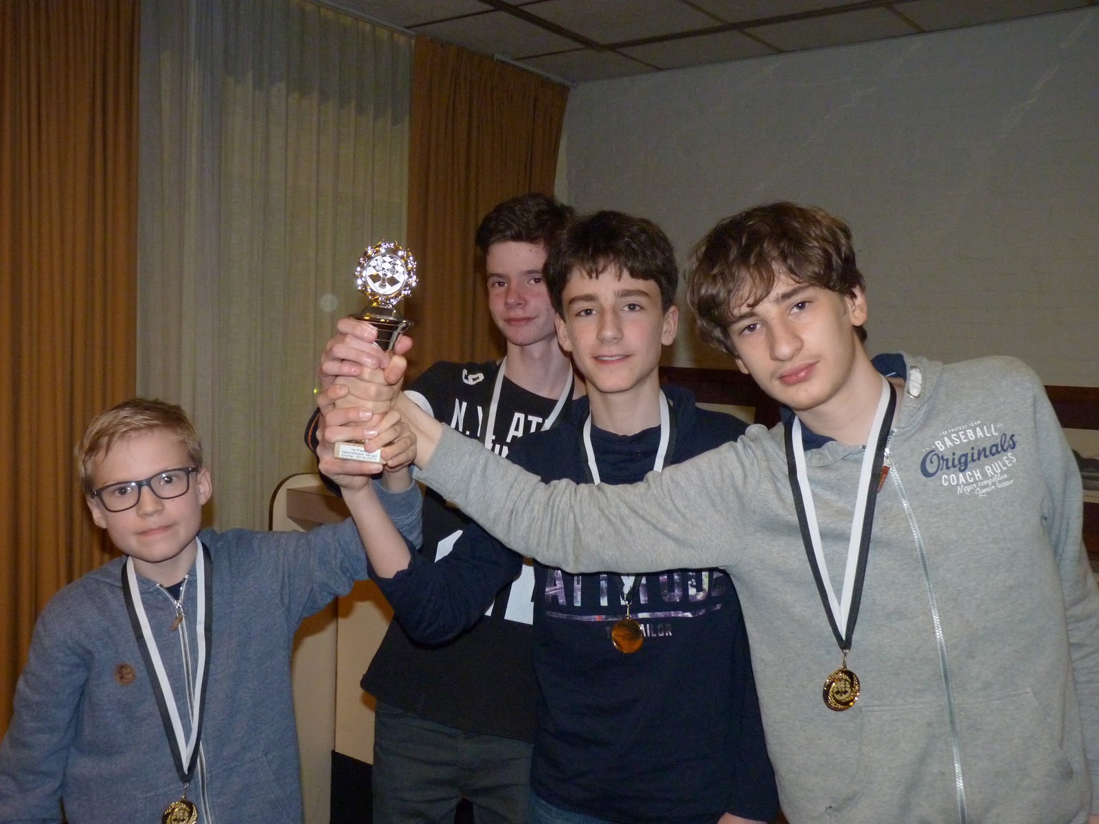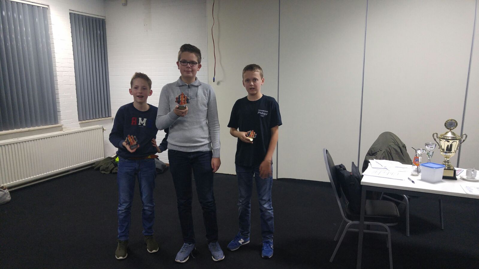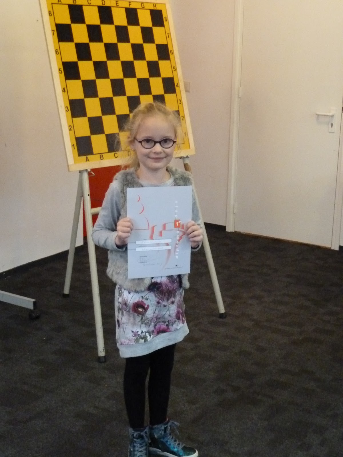 Rowin deed het een treetje lager ook uitstekend. Hij won al zijn partijen behalve tegen clubgenoot Jan. Jan bleek gewoon te hoog ingedeeld te zijn. Jan heeft veel talent en veel geleerd zaterdagmiddag. En hij was als enige in staat om Rowin een half punt af te snoepen. Rowin natuurlijk van harte gefeliciteerd met je eerste plaats.